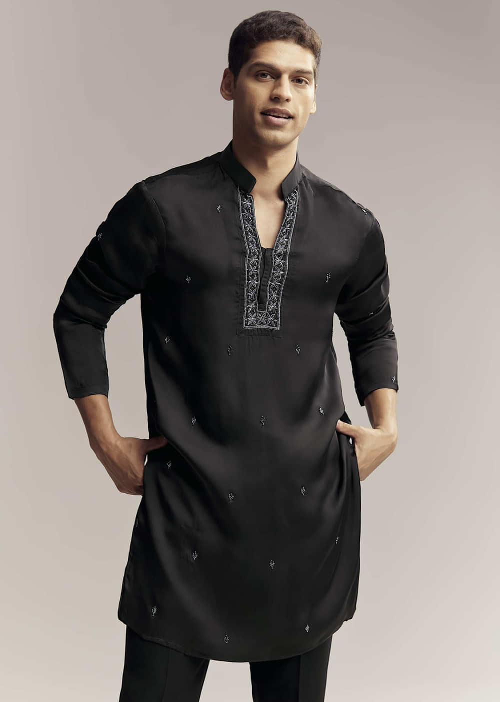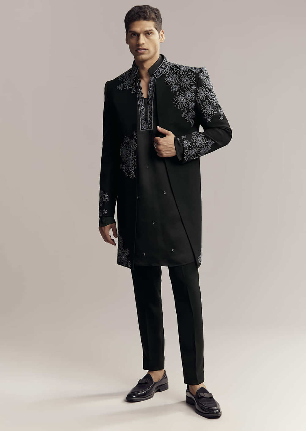 Black Imported Satin Organza Indo Western For Men With Zardosi Embroidery