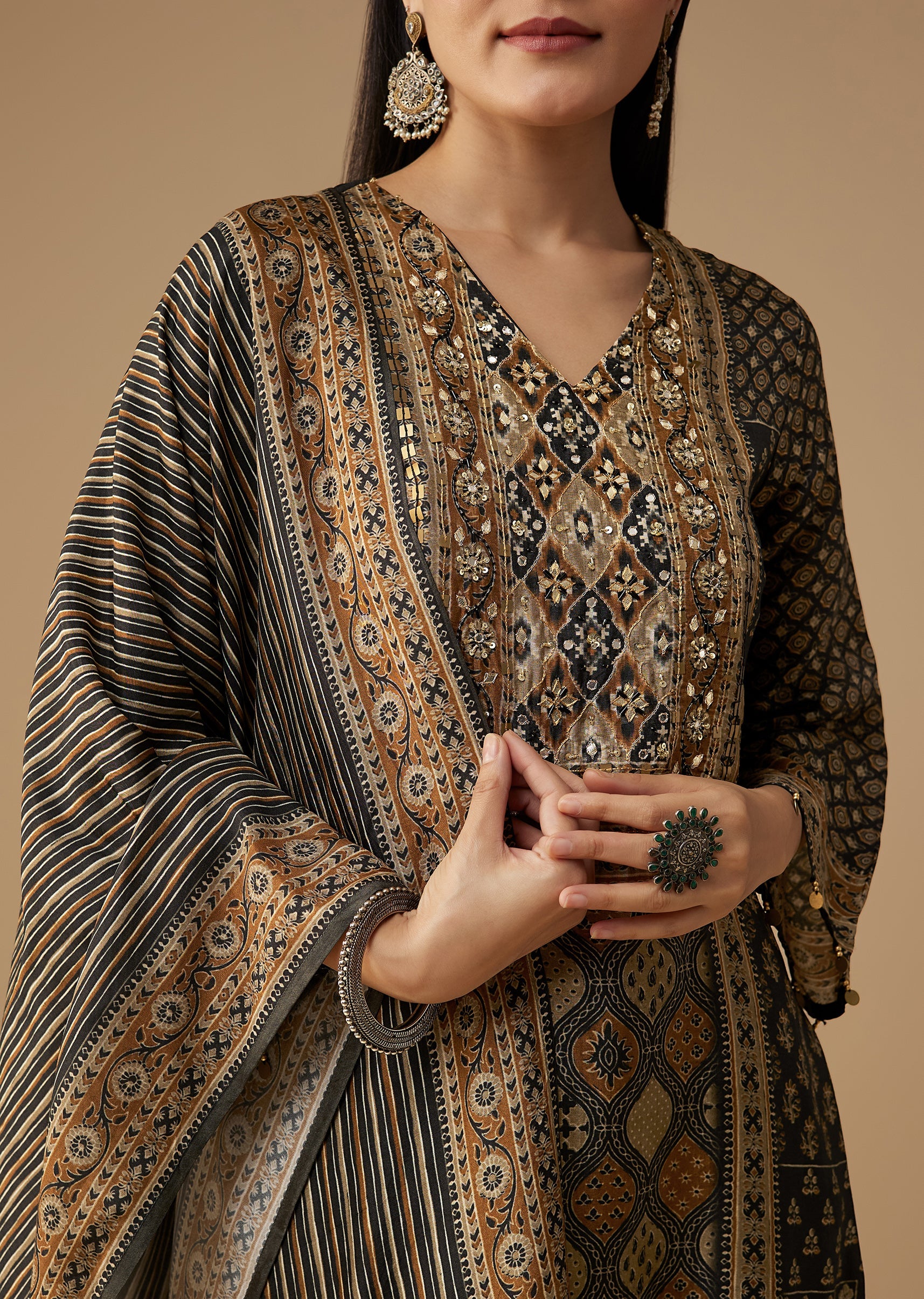 Bring a touch of artisanal charm to your wardrobe with this black silk kurta set, featuring indie inspired prints accented with delicate gotta work for a festive, handcrafted finish. The... More Product Details