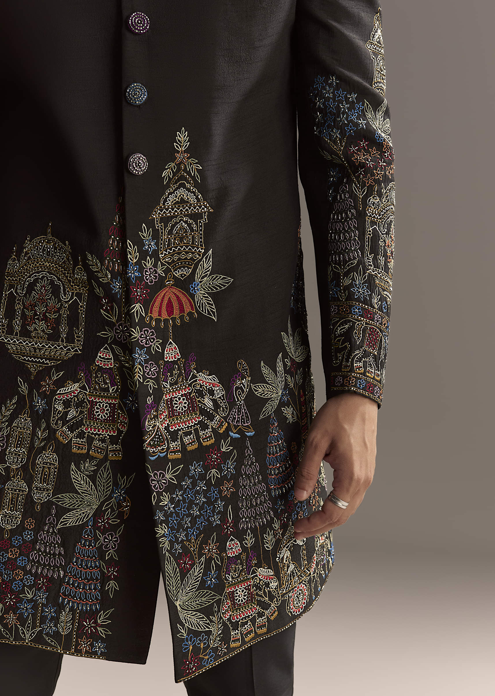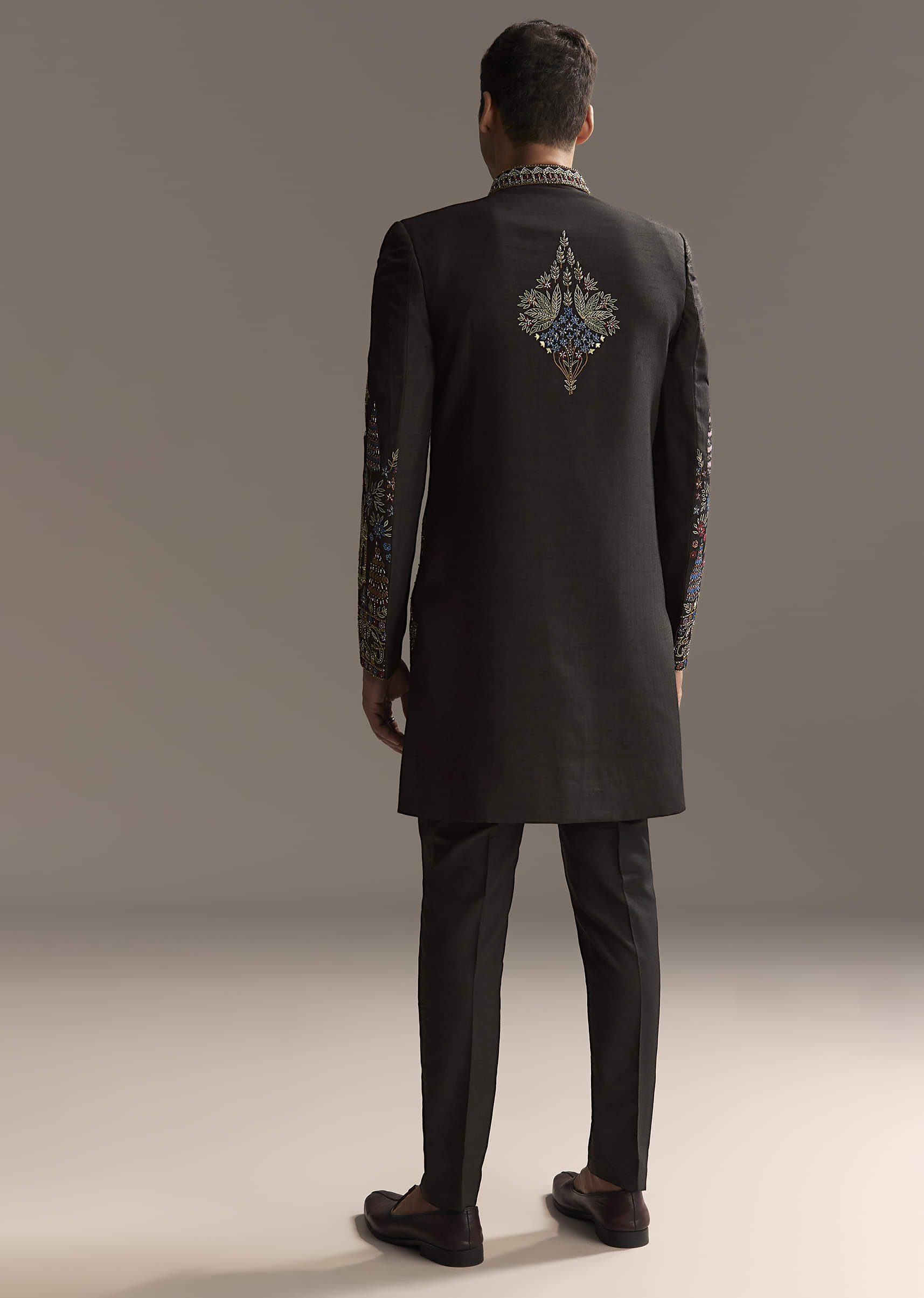 Tradition meets colour in this black indo western set in suiting fabric with vibrant floral and ornamental embroidery across sleeves, cuffs, and hem. Multicolour buttons, a patterned collar, and a... More Product Details