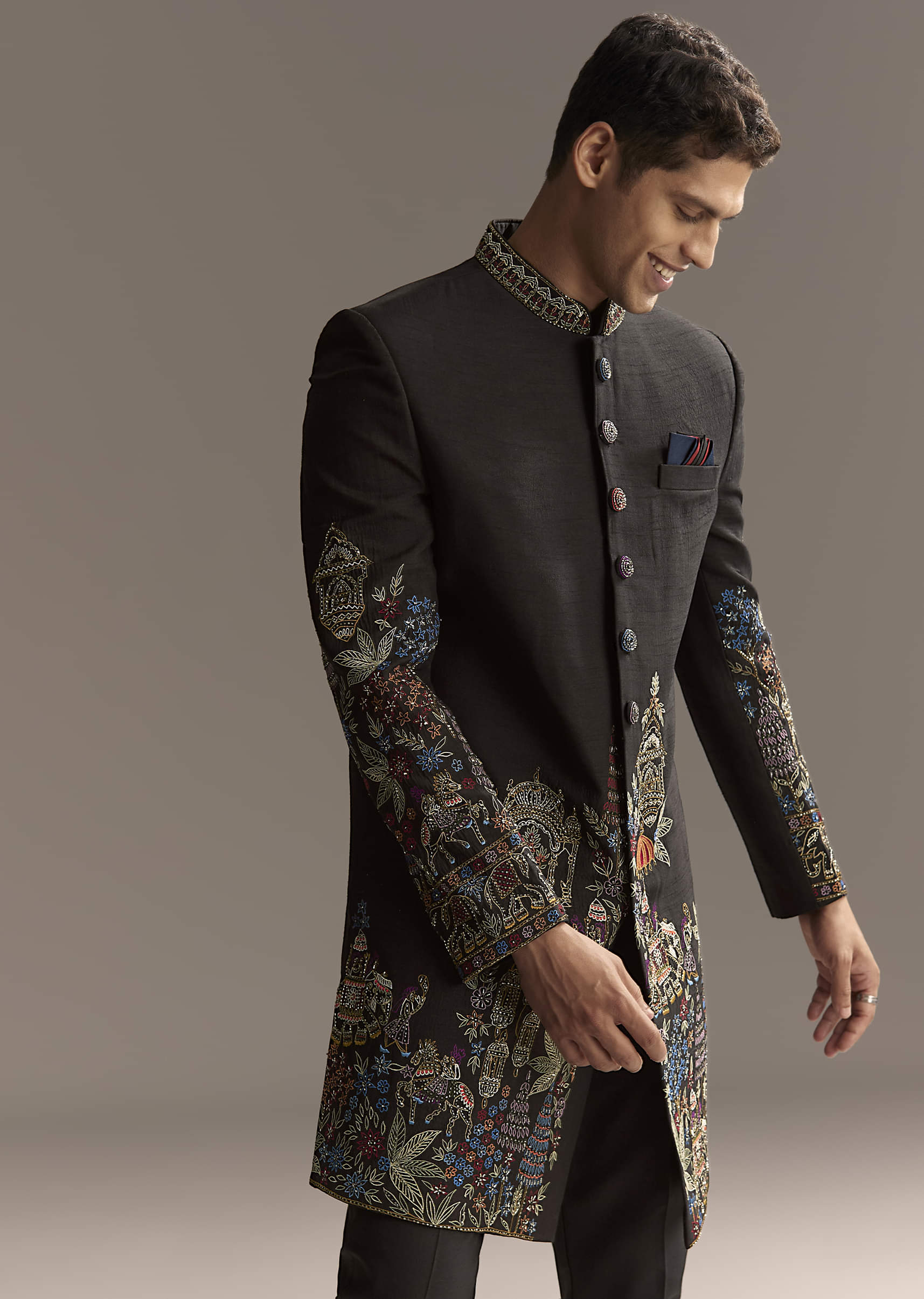 Tradition meets colour in this black indo western set in suiting fabric with vibrant floral and ornamental embroidery across sleeves, cuffs, and hem. Multicolour buttons, a patterned collar, and a coordinated pocket square pull the story together. You bring festive personality to sangeet and reception nights without losing polish. Awarded as the Most Trusted Brand, we're delivering styles you love, just as promised.