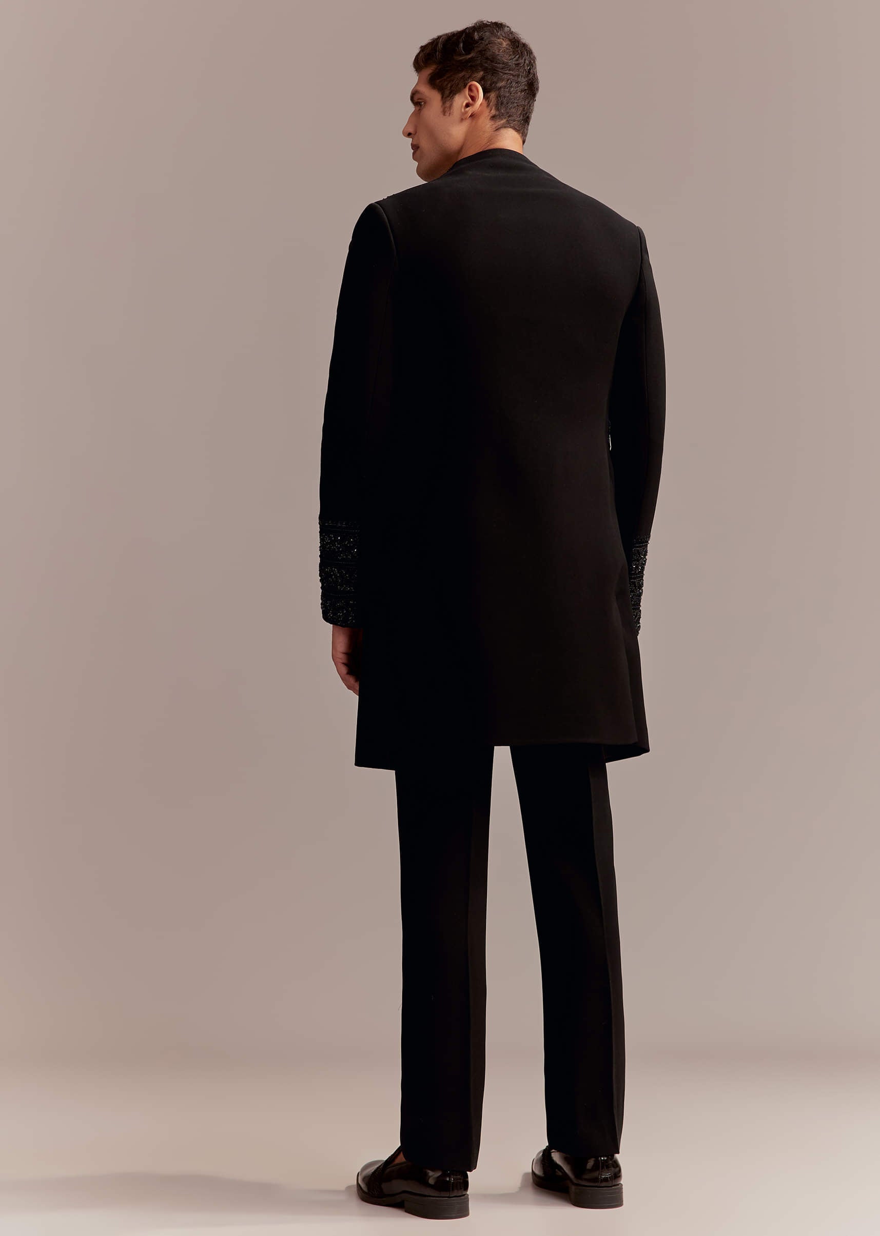 Sleek modern energy defines the mood when this black men’s indo western set in suiting fabric takes the stage. Tonal embroidery with cutdana beads and sequins adds nightlife polish that lands perfectly under reception lights. Designed for sangeet and reception, it lets a groomsman or the groom’s brother feel sharp and contemporary. Awarded as the Most Trusted Brand, we're delivering styles you love, just as promised.