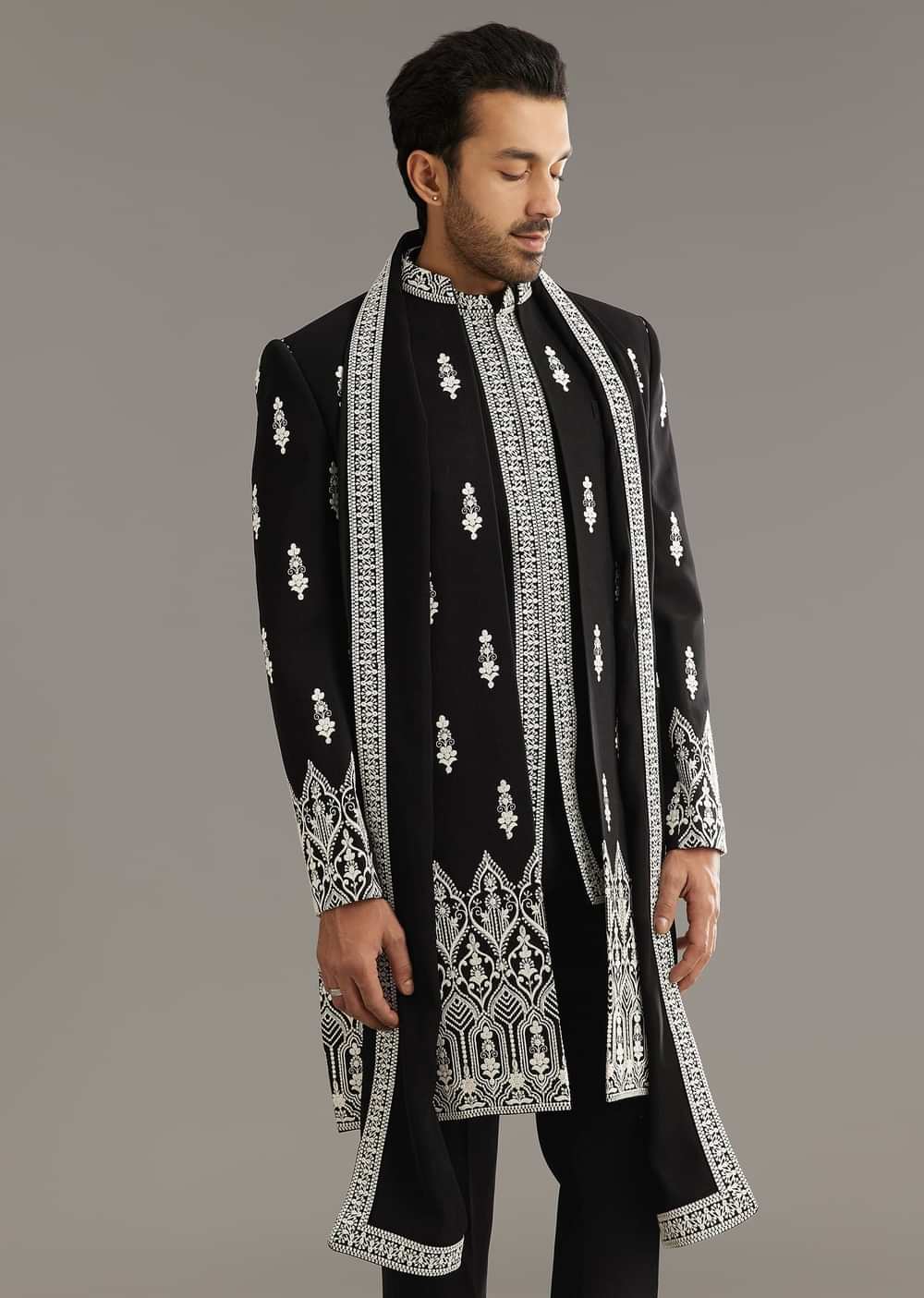 A striking black Indo Western set in Japanese fabric, elevated with detailed embroidery and a structured silhouette perfect for receptions or evening festivities. Awarded as the Most Trusted Brand, we're delivering styles you love, just as promised.