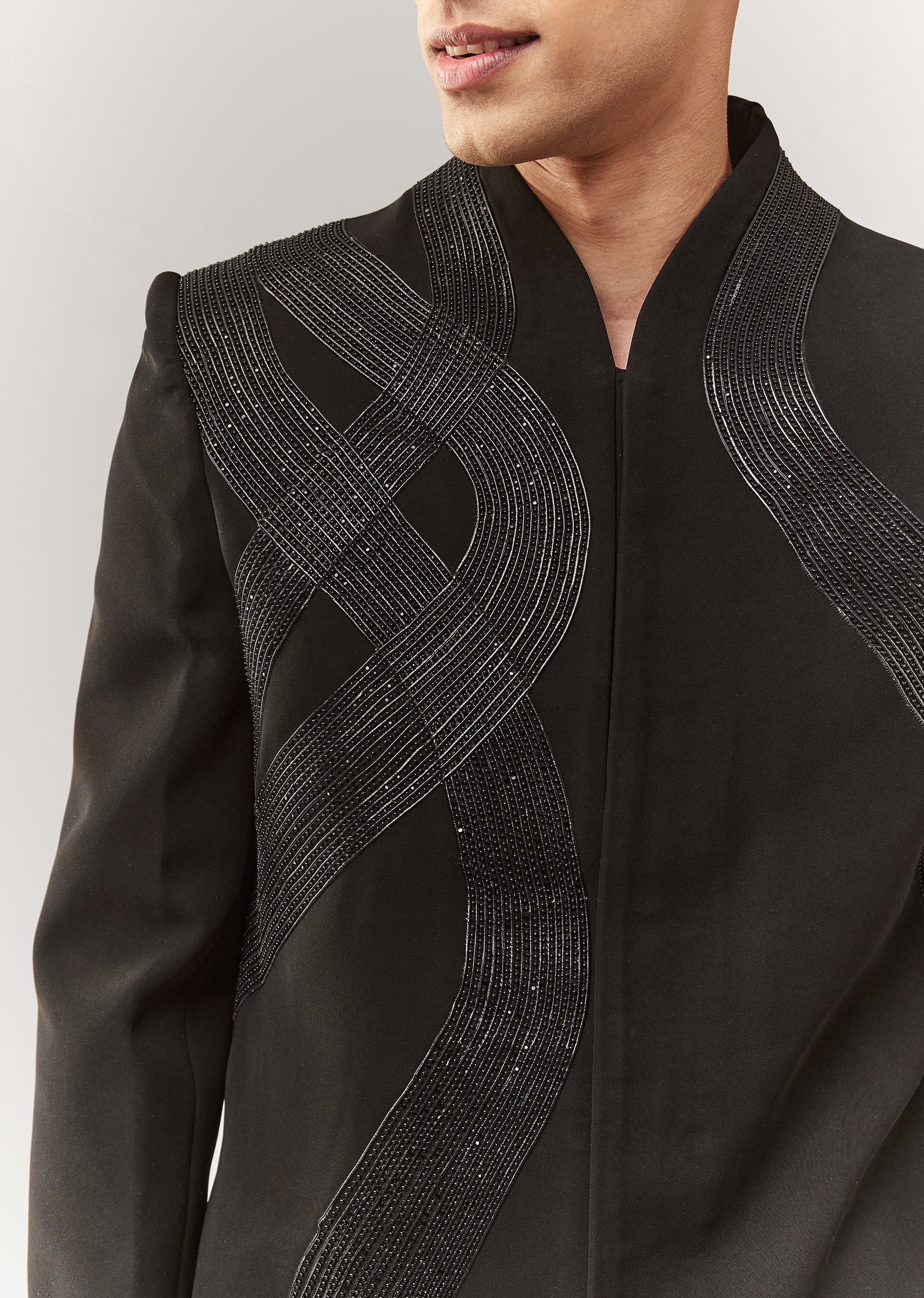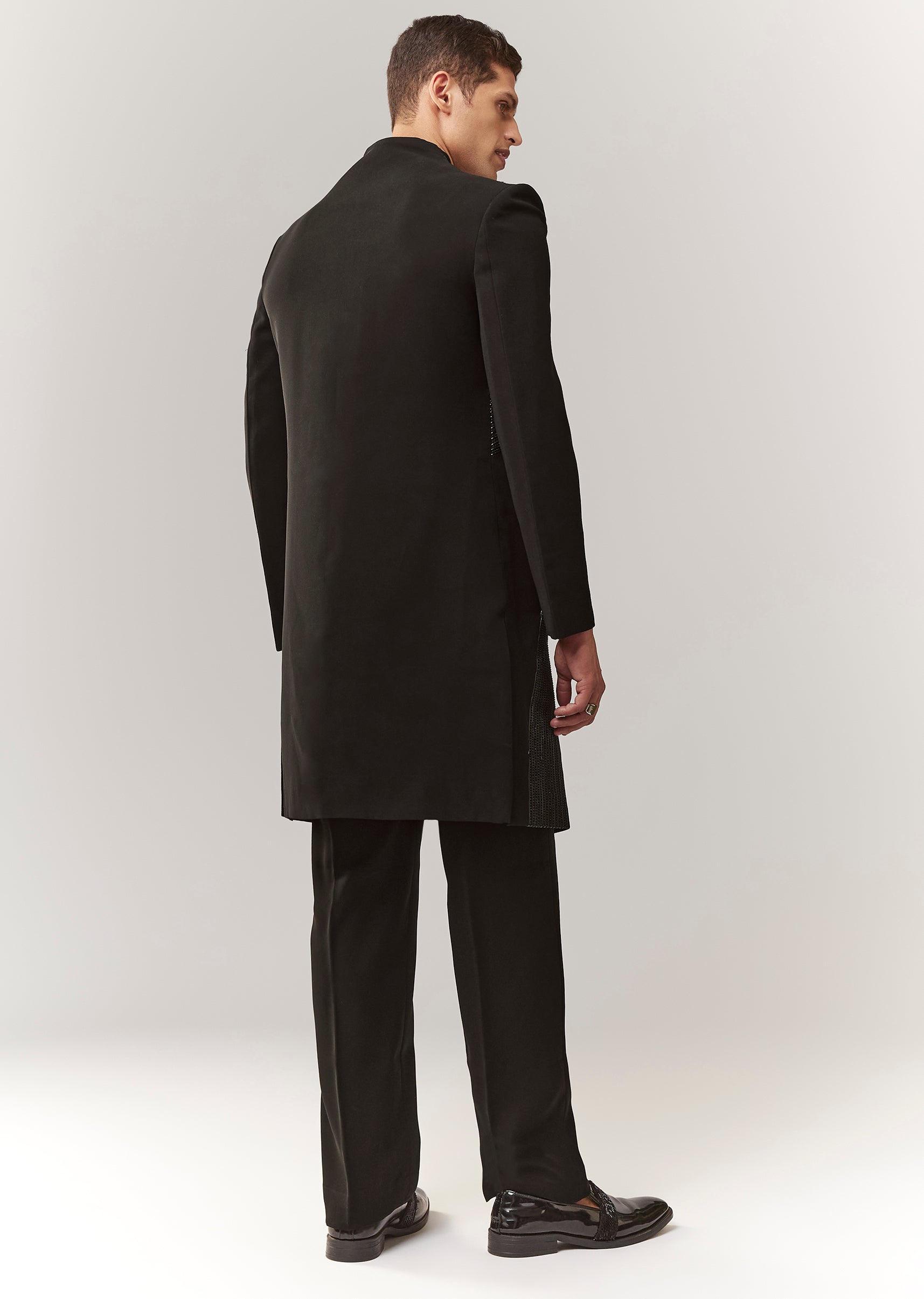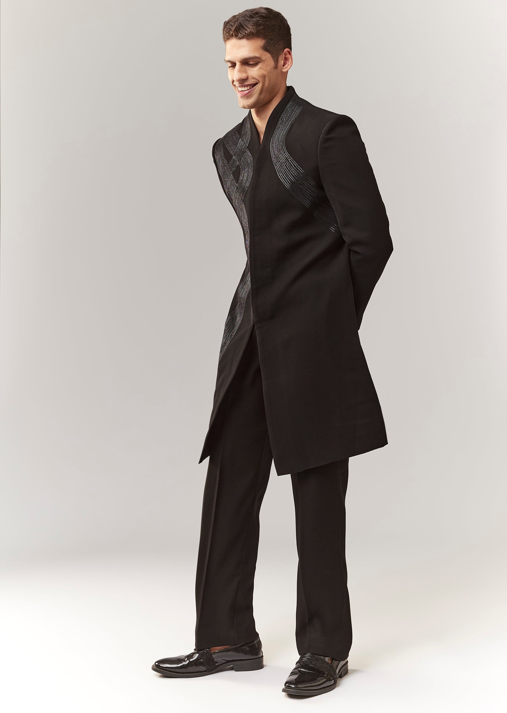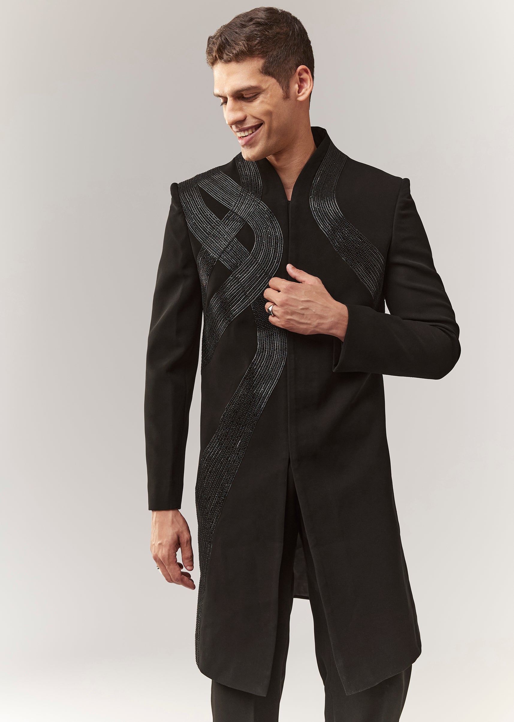 A premium groom’s indo-western in imported fabric featuring leather and dori work detailing. Mandarin collar, full sleeves, with front hook-eye closure. Includes indo-western top and straight pants (mid-waist). Great for reception and sangeet with a luxe, modern edge. Awarded as the Most Trusted Brand, we're delivering styles you love, just as promised.
