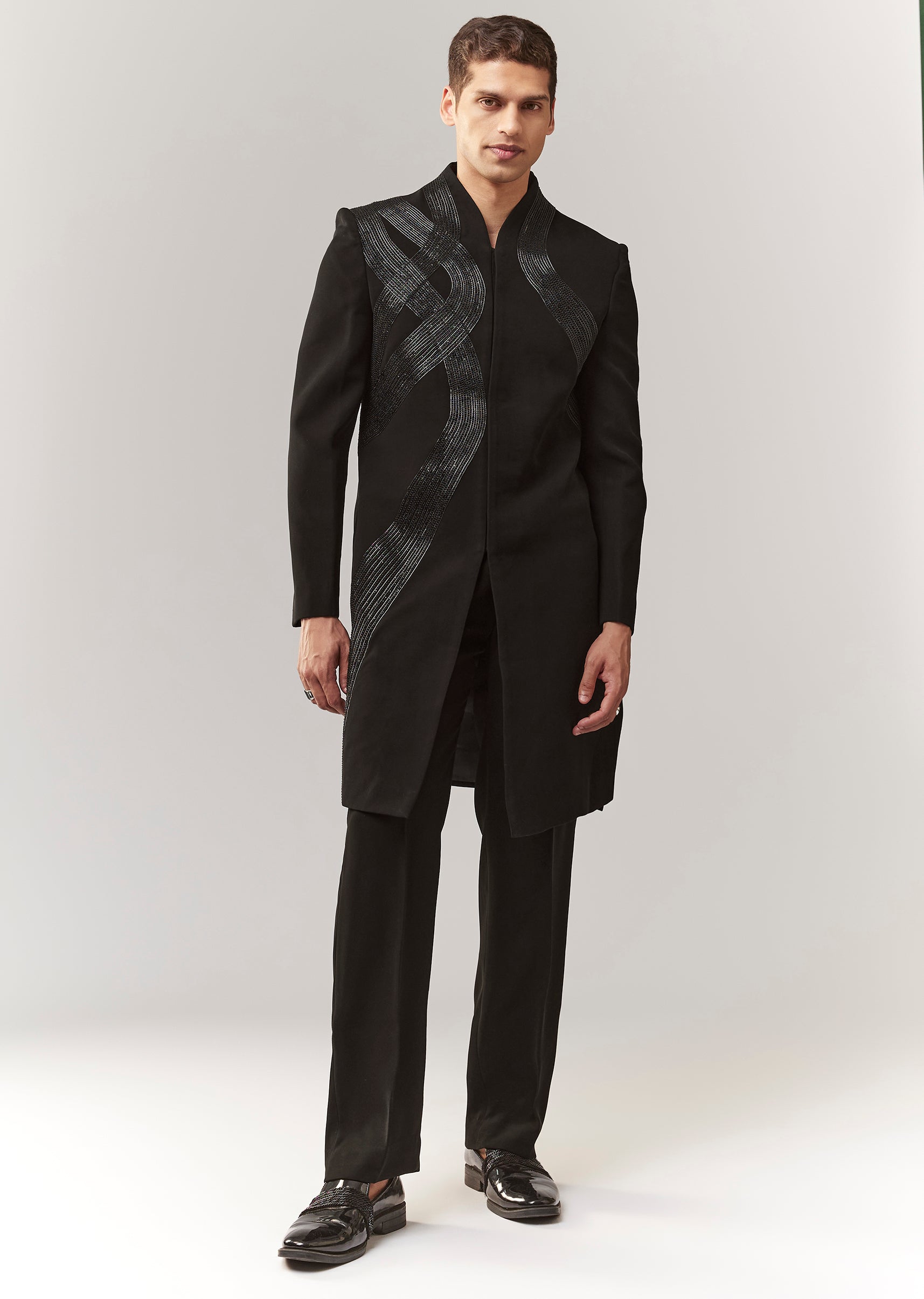 A premium groom’s indo-western in imported fabric featuring leather and dori work detailing. Mandarin collar, full sleeves, with front hook-eye closure. Includes indo-western top and straight pants (mid-waist). Great for... More Product Details
