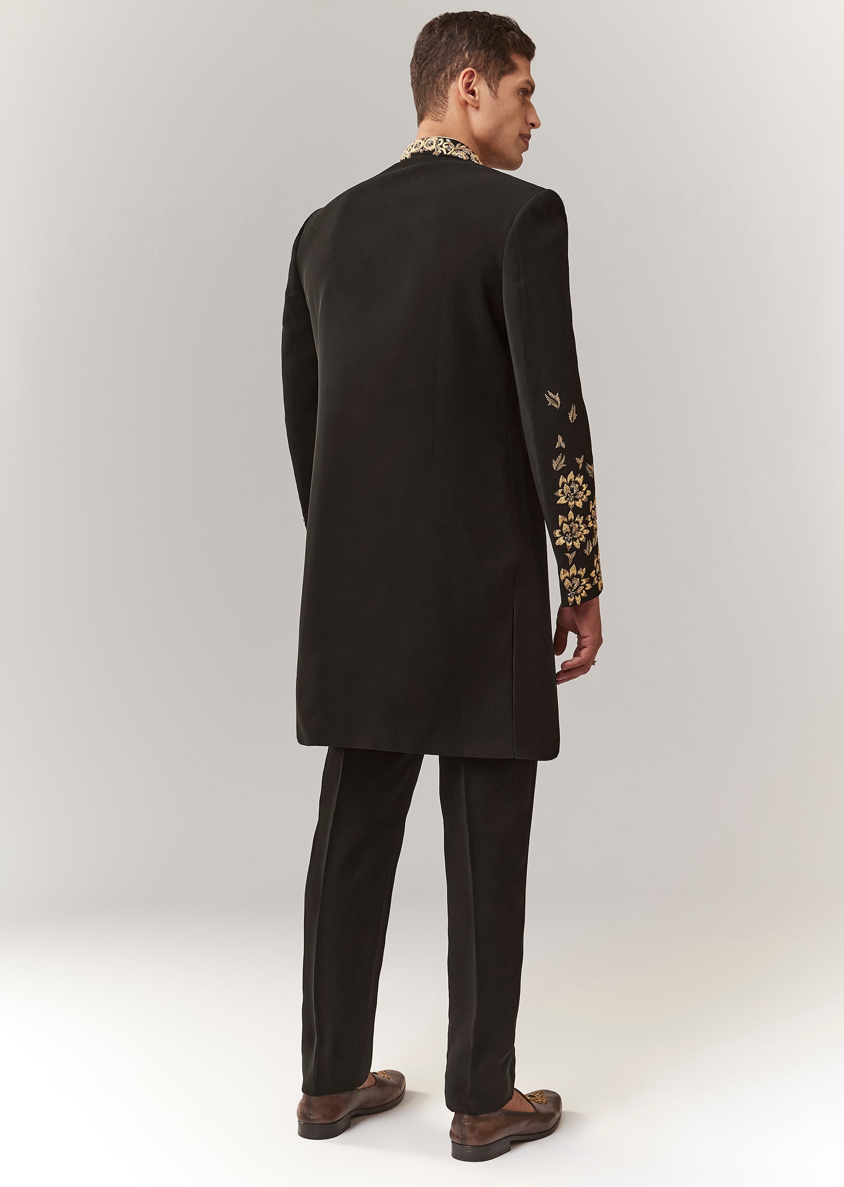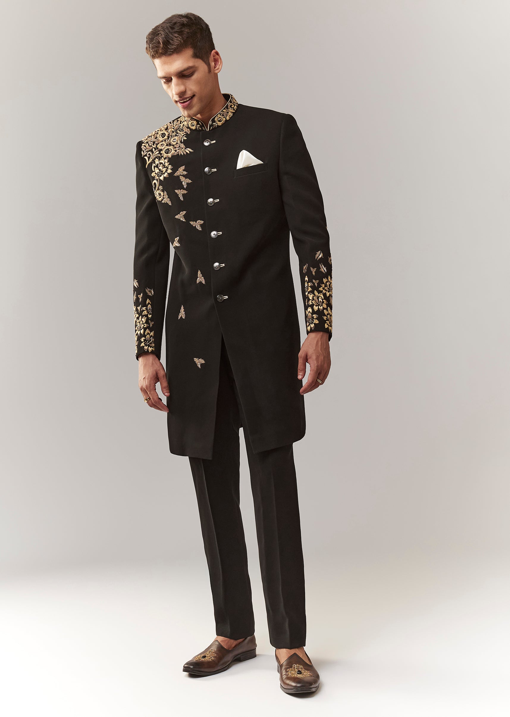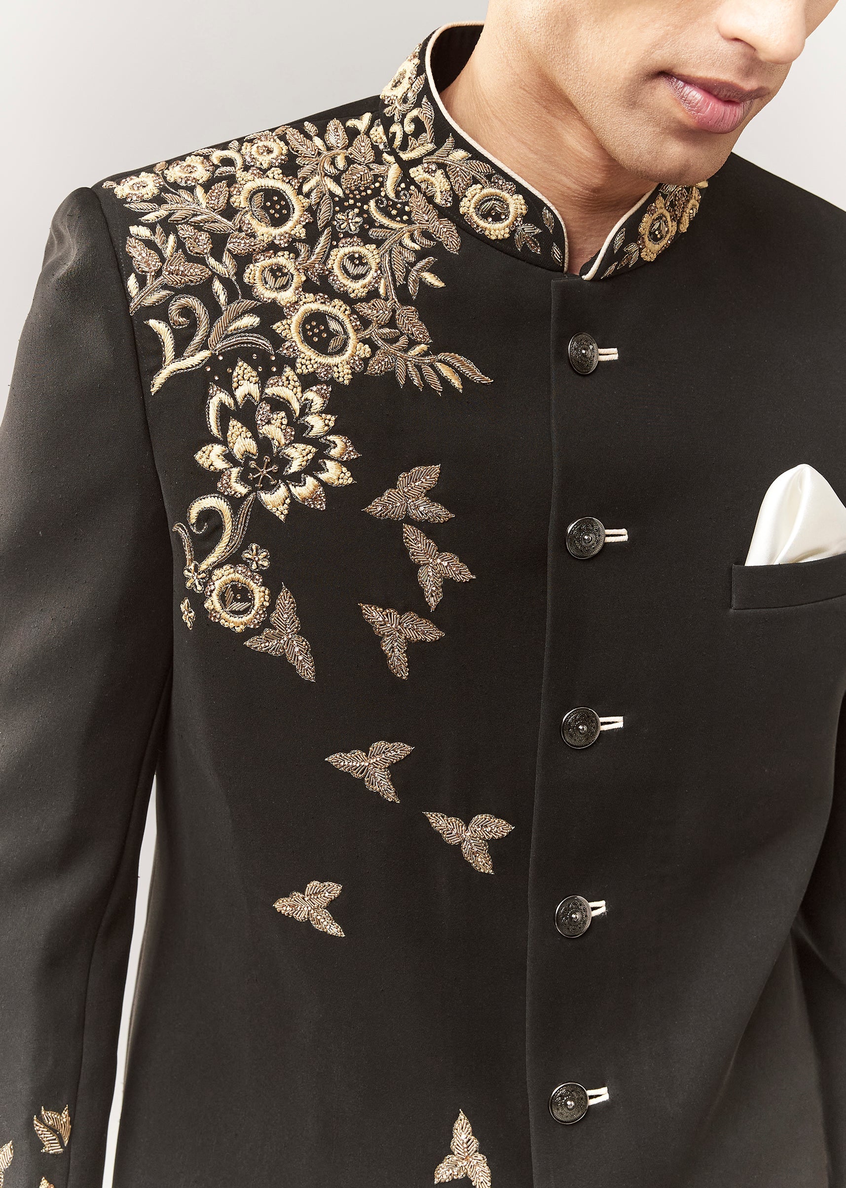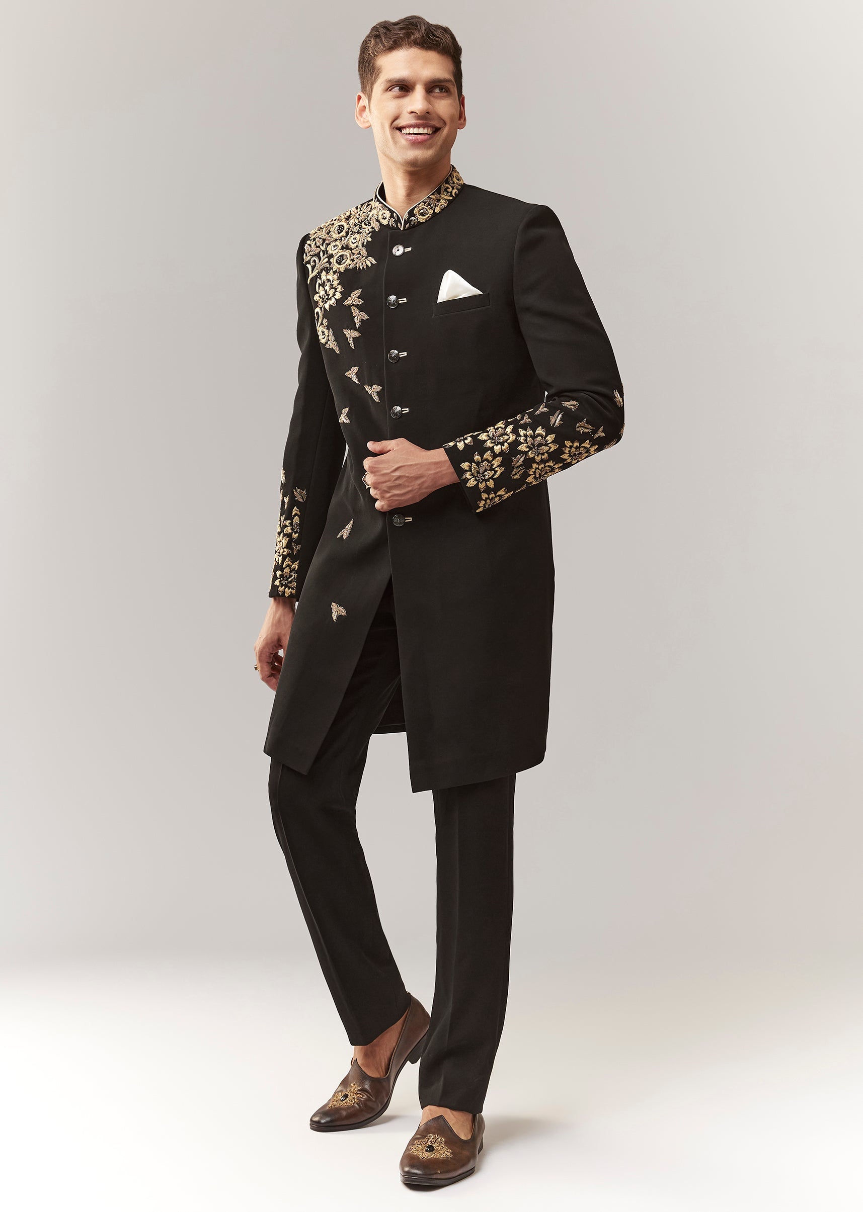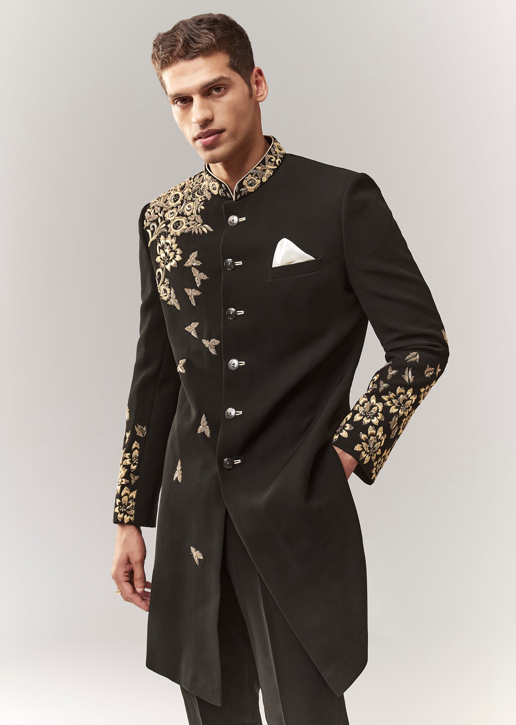A contemporary black indo-western set featuring zardosi work on imported fabric. Mandarin collar, full sleeves, and front button closure. Paired with straight pants (mid-waist). A solid groomsman pick for mehendi, sangeet, and reception. Awarded as the Most Trusted Brand, we're delivering styles you love, just as promised.