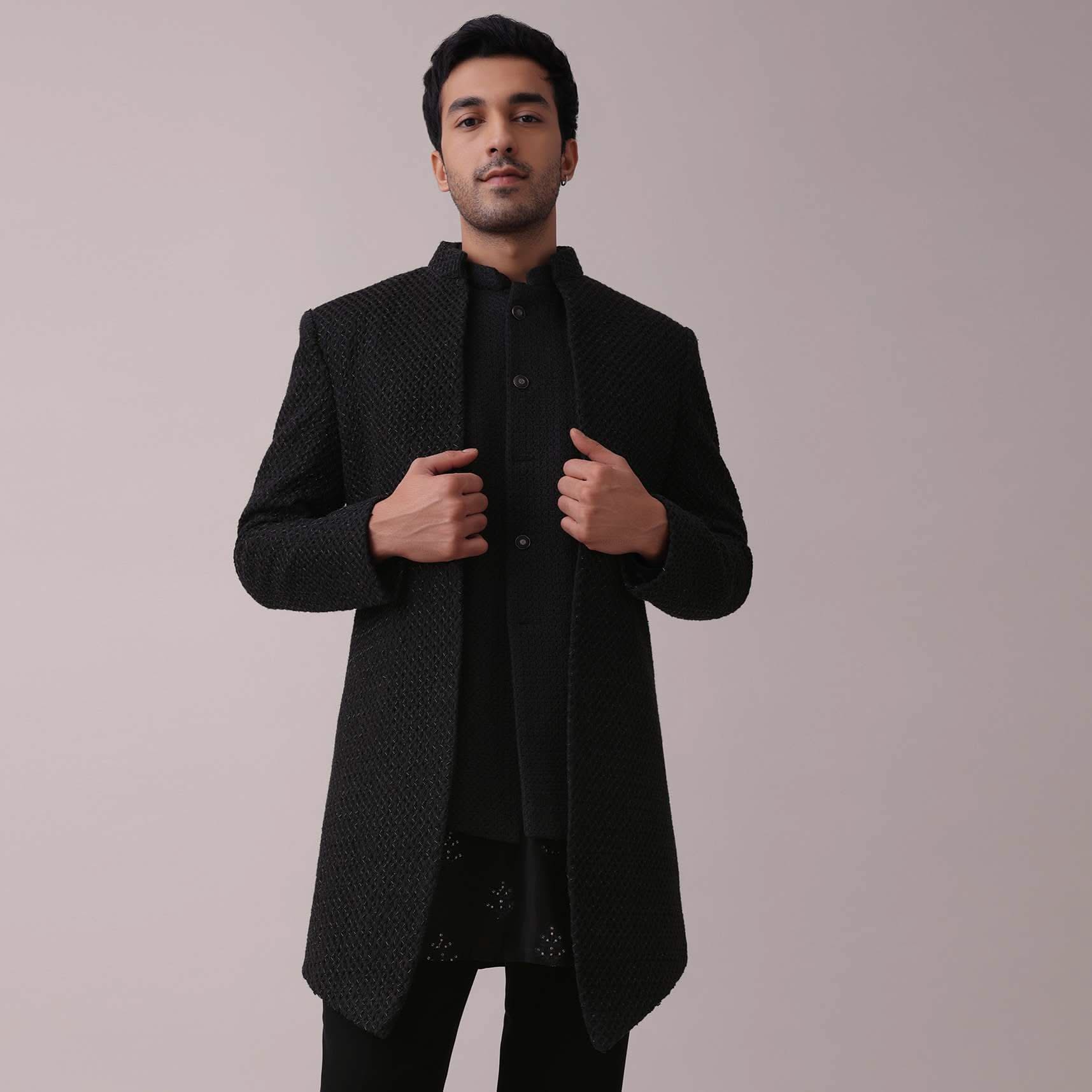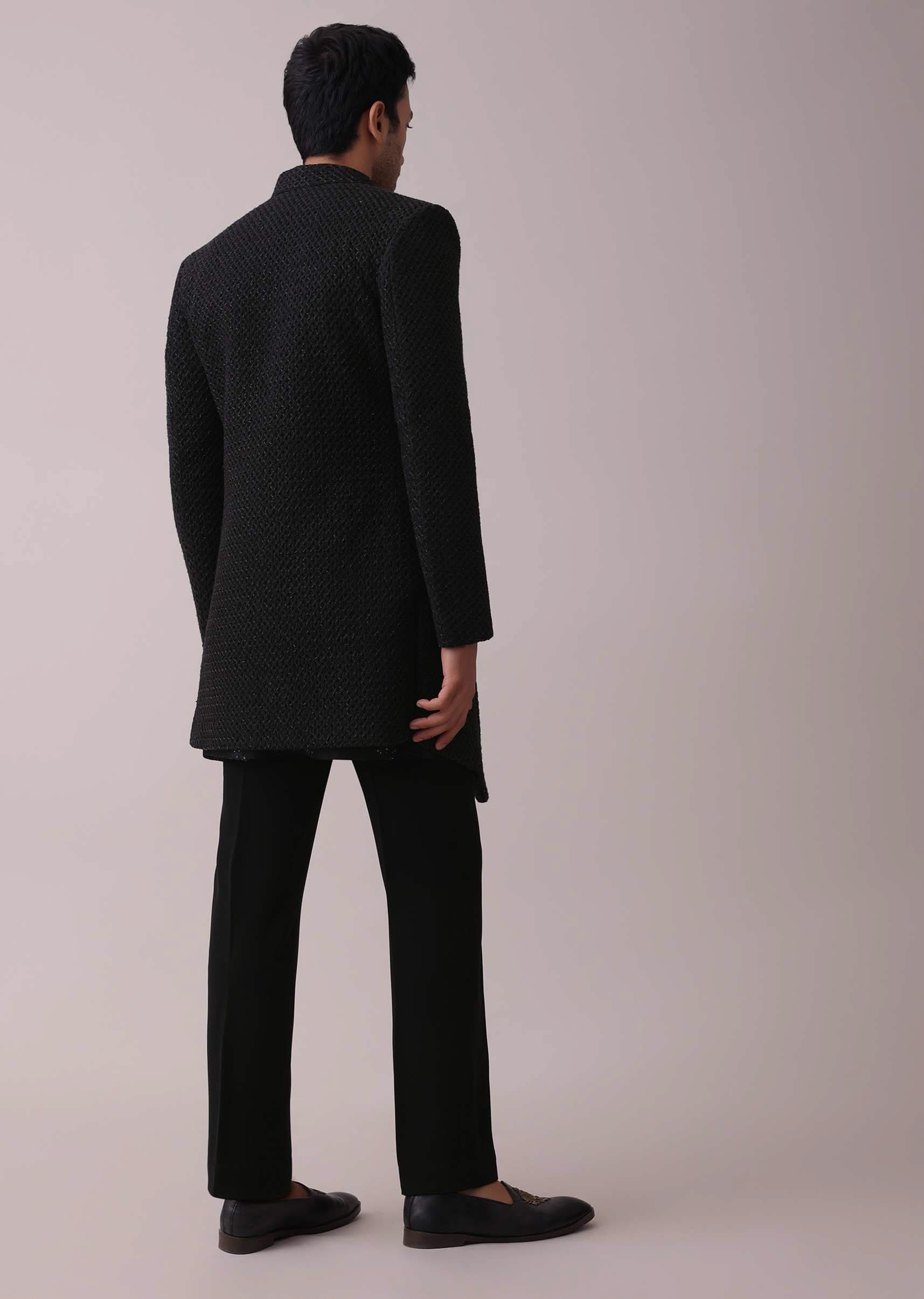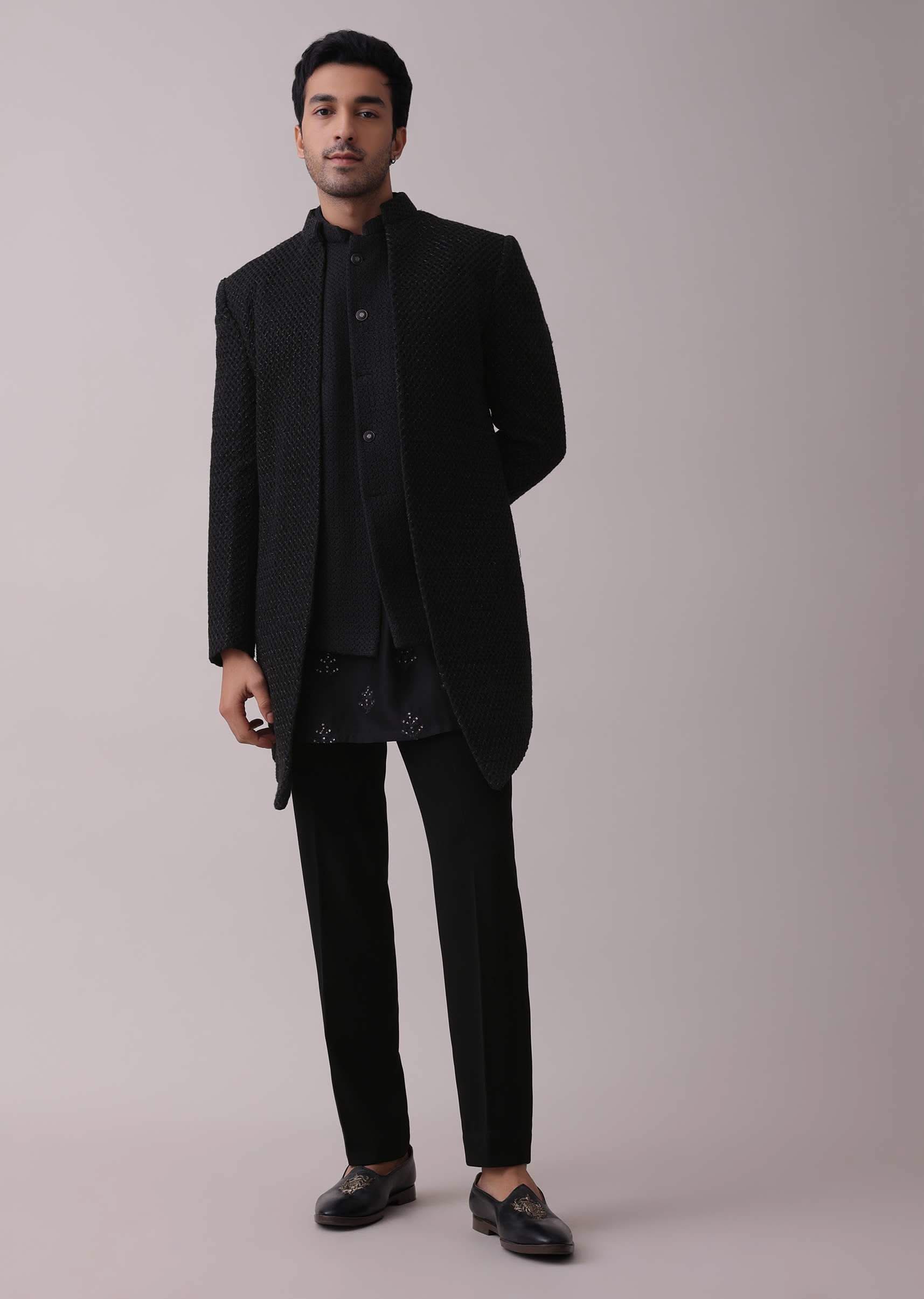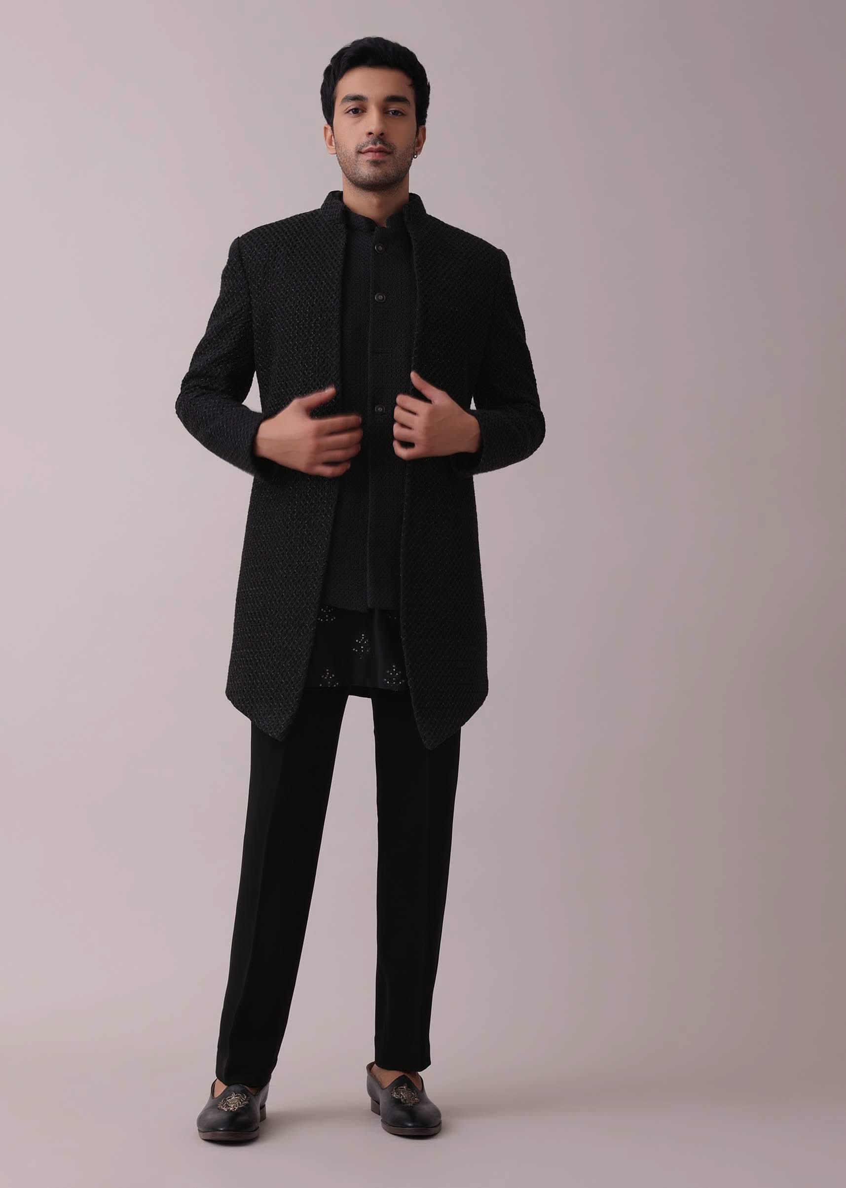 Black Indowestern Four-Piece Embroidered Achkan Jacket Set In Georgette