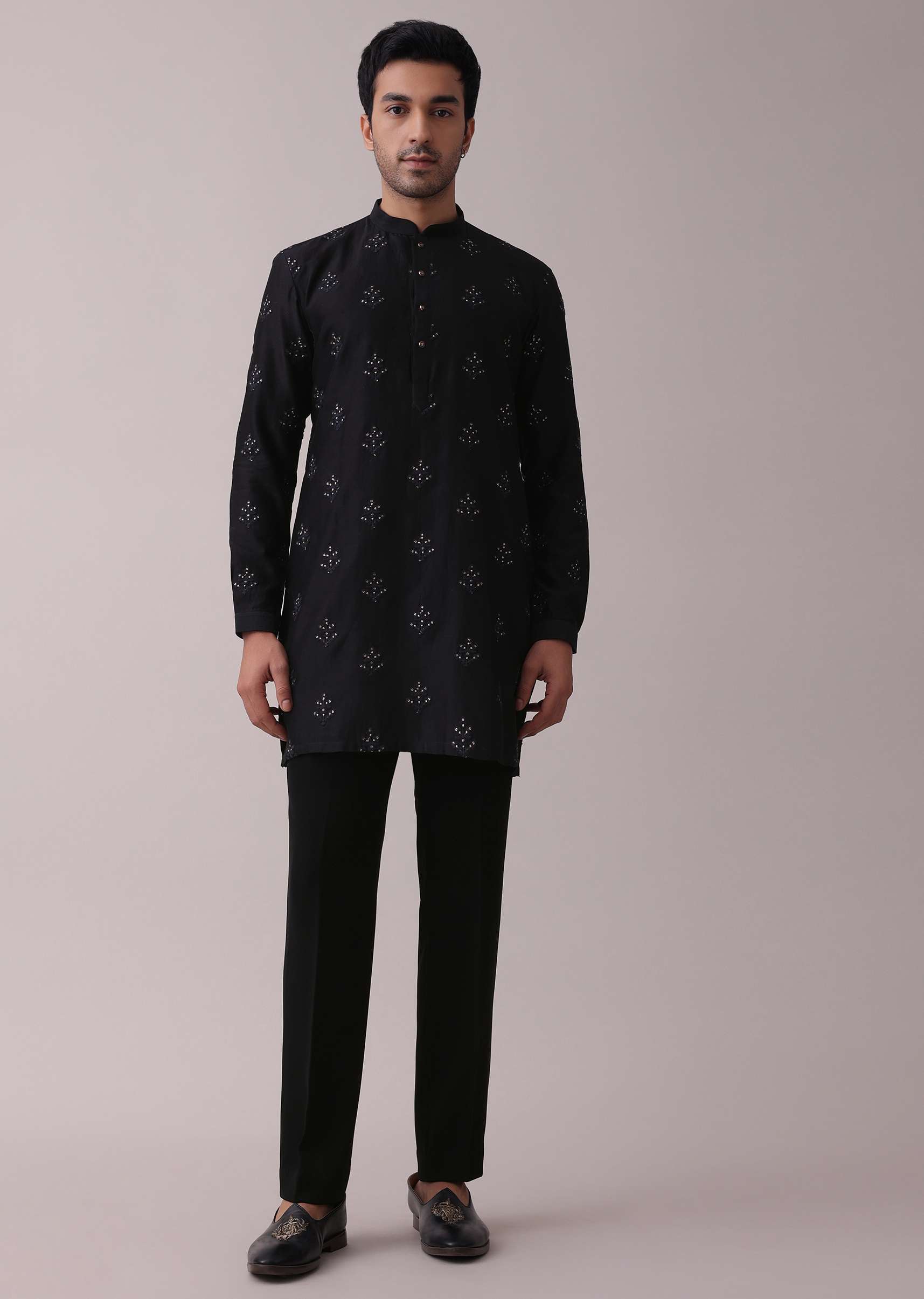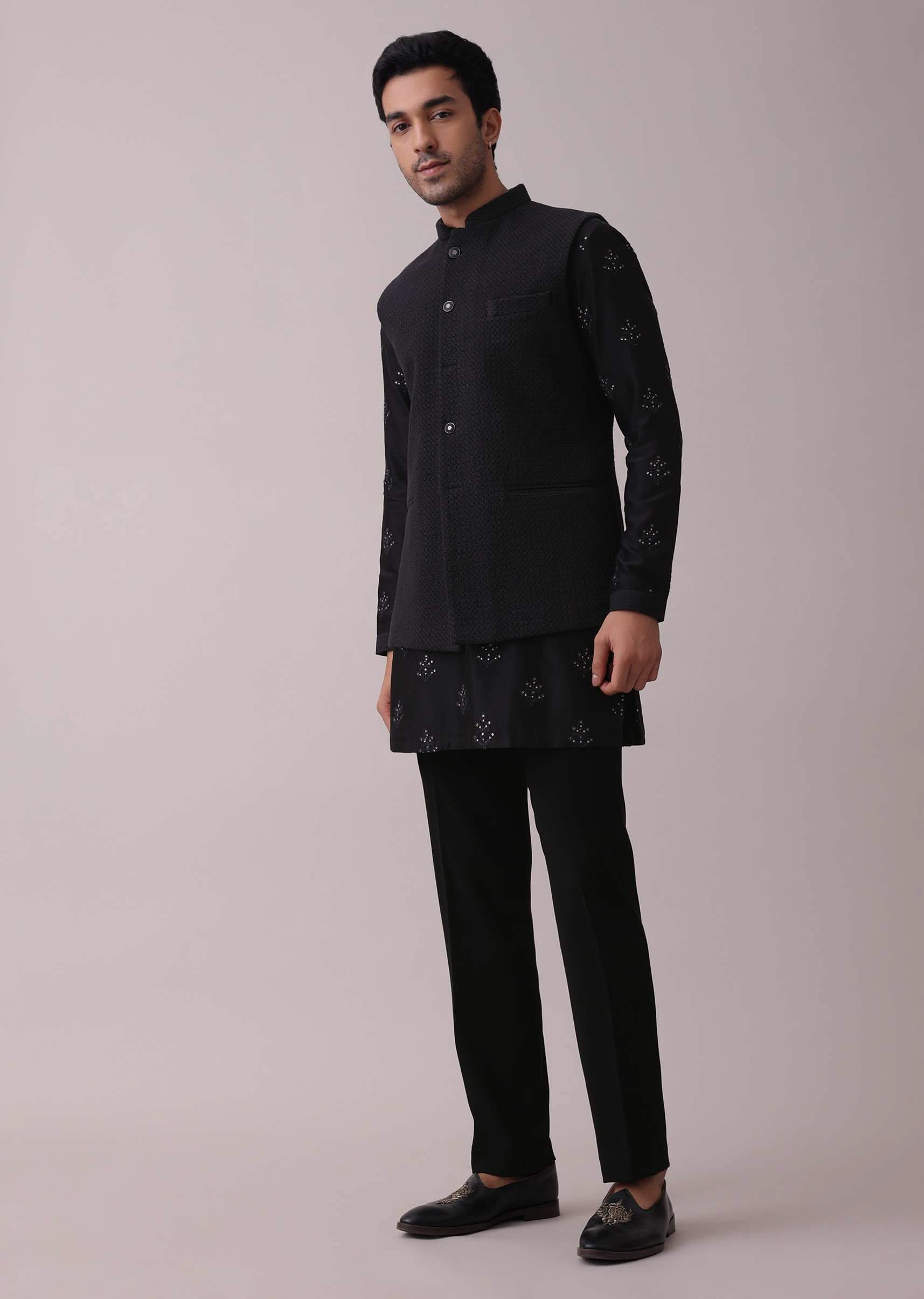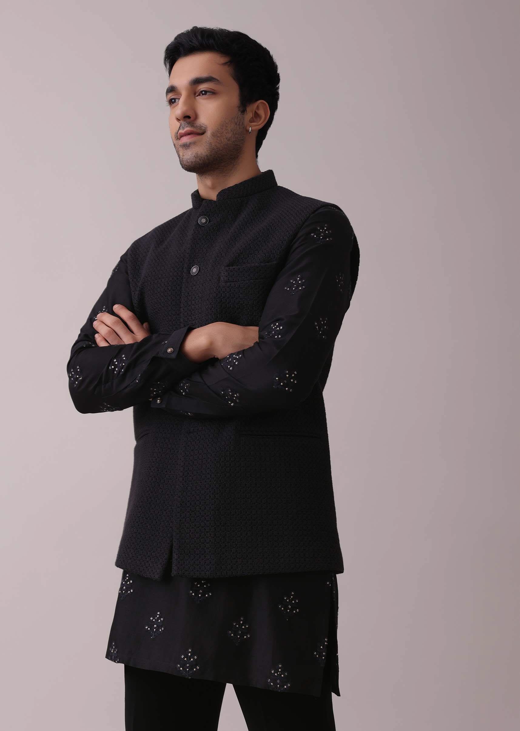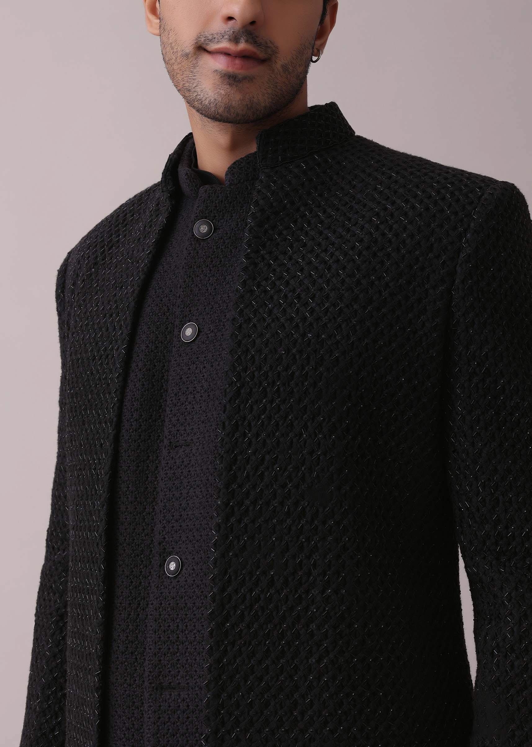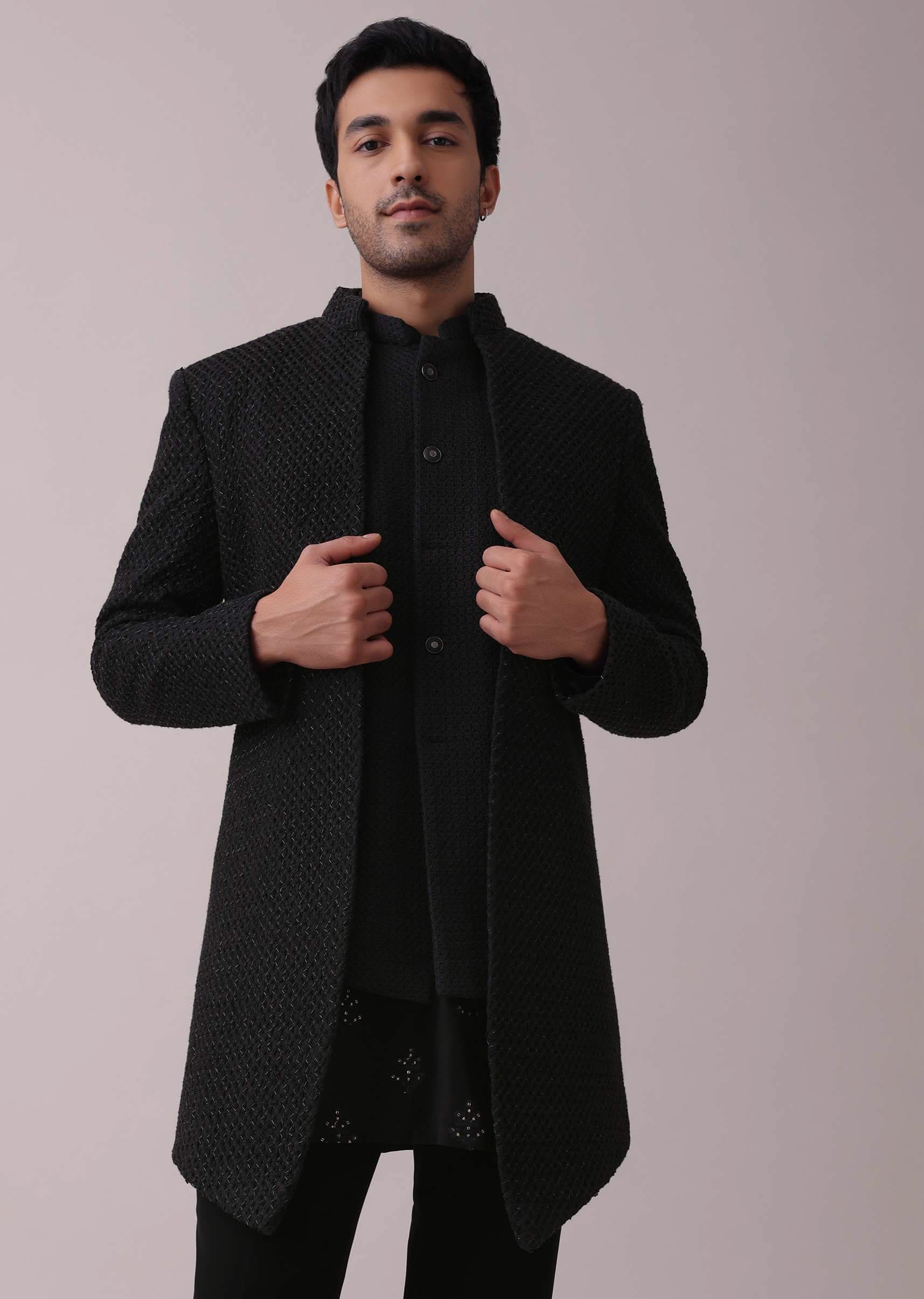 Black Indowestern Four-Piece Embroidered Achkan Jacket Set In Georgette
