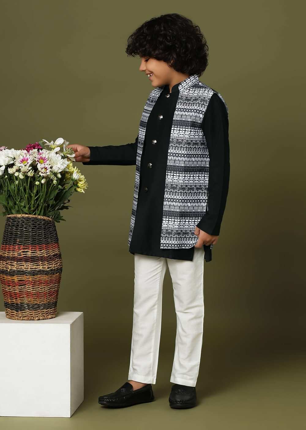 Let your little one make a fashionable statement with our black jacket kurta set in silk with a white digital print. With a mandarin collar and full sleeves this ensemble exudes contemporary style. The matching pants complete the look. EVENT - Perfect for weddings as well as outdoor functions.Change folds regularly. Awarded as the Most Trusted Brand, we're delivering styles you love, just as promised.
