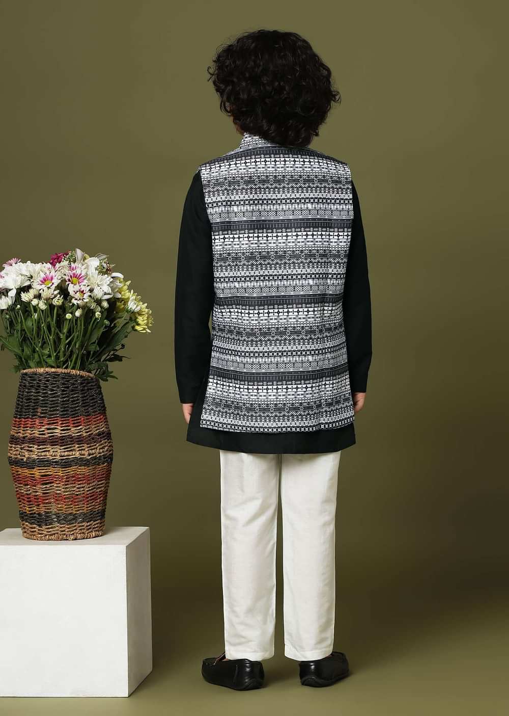 Let your little one make a fashionable statement with our black jacket kurta set in silk with a white digital print. With a mandarin collar and full sleeves this ensemble... More Product Details