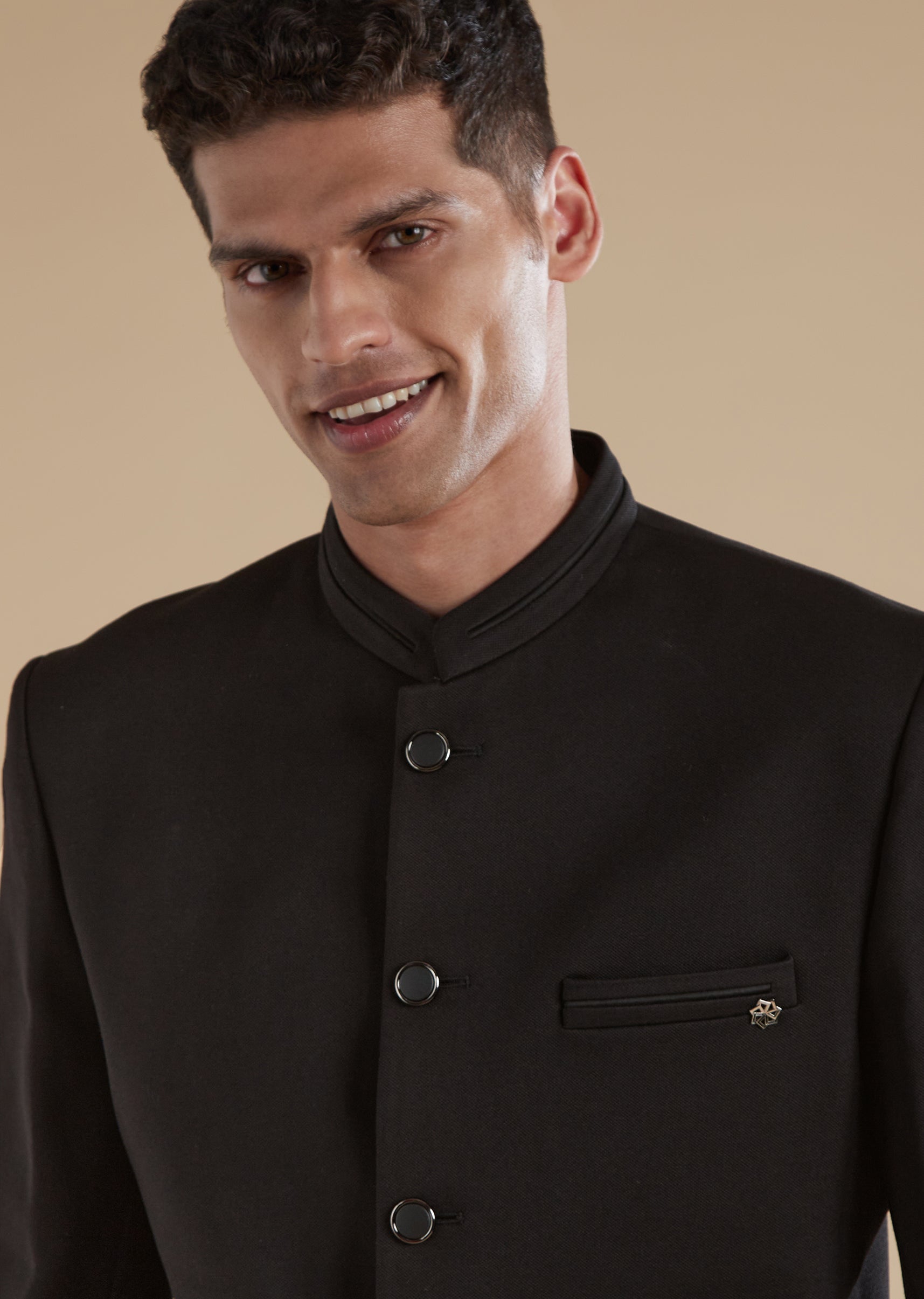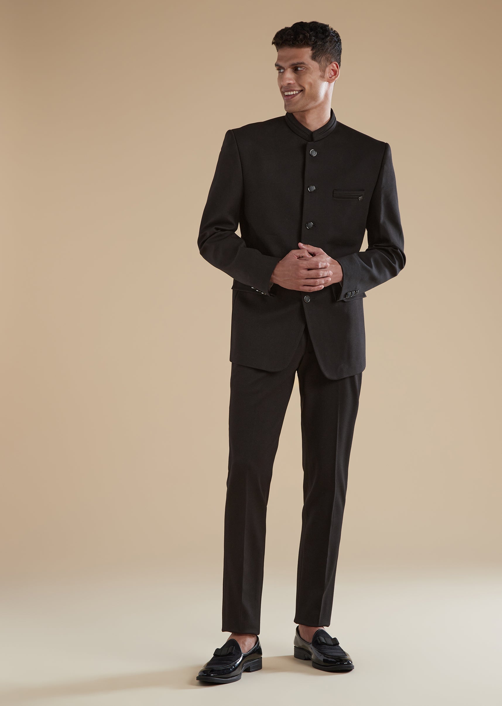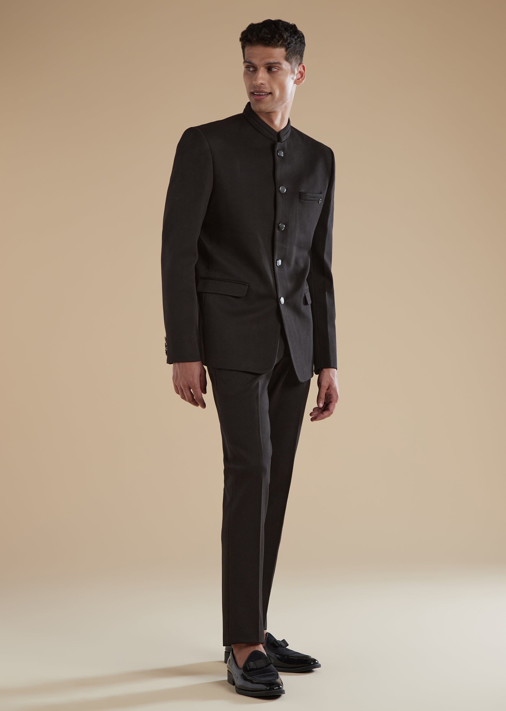 Timeless and refined, this black Jodhpuri set is designed for reception and sangeet celebrations, making it an ideal choice for a groomsman or a well-dressed wedding guest. Tailored in a premium base with polyester as the secondary fabric, it offers a clean and structured classic look. The silhouette features a mandarin collar, full sleeves, and front button closures on both the Jodhpuri jacket and the coordinating pants, ensuring a polished and cohesive finish. Minimal and elegant, this set delivers effortless sophistication for evening festivities.