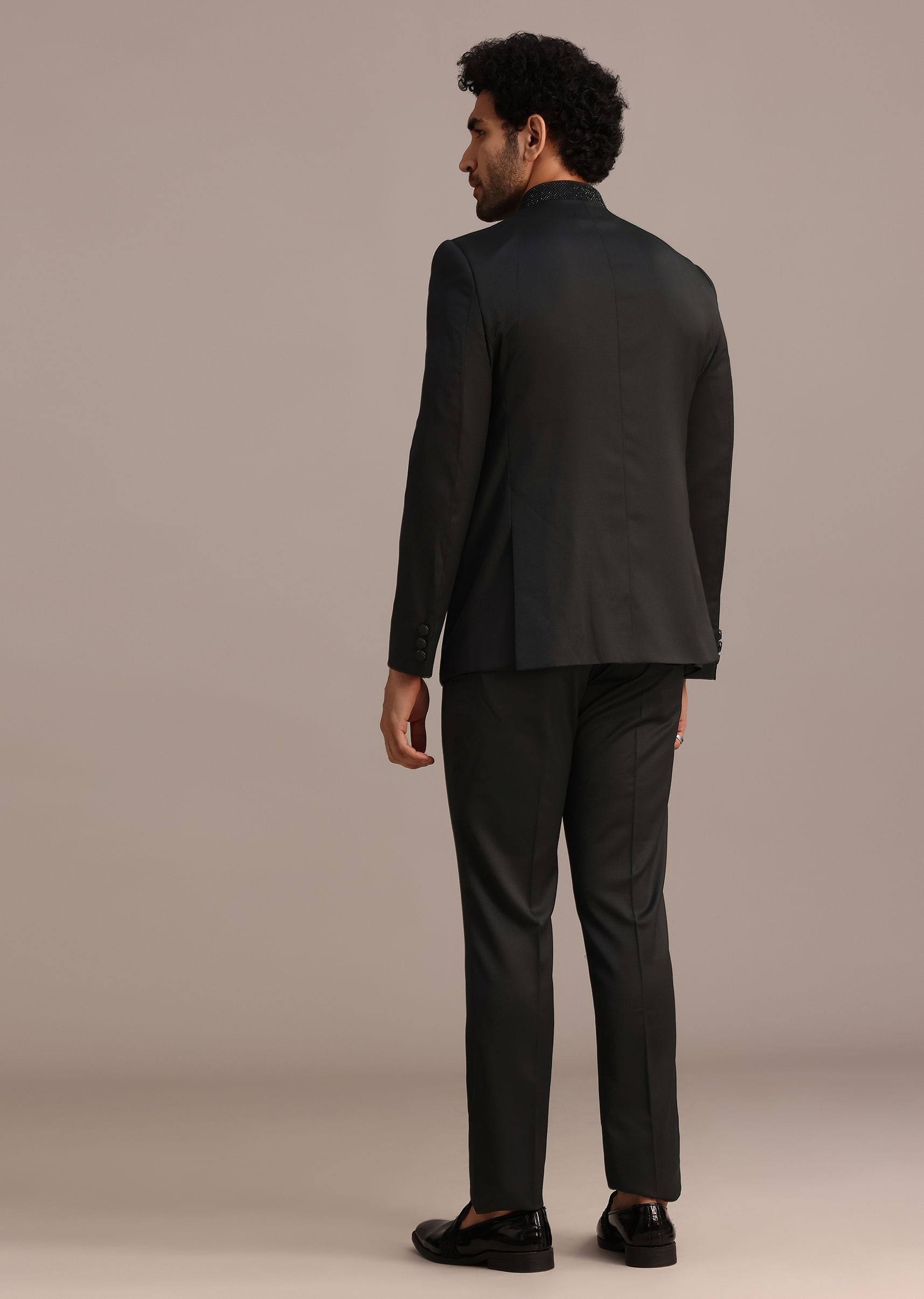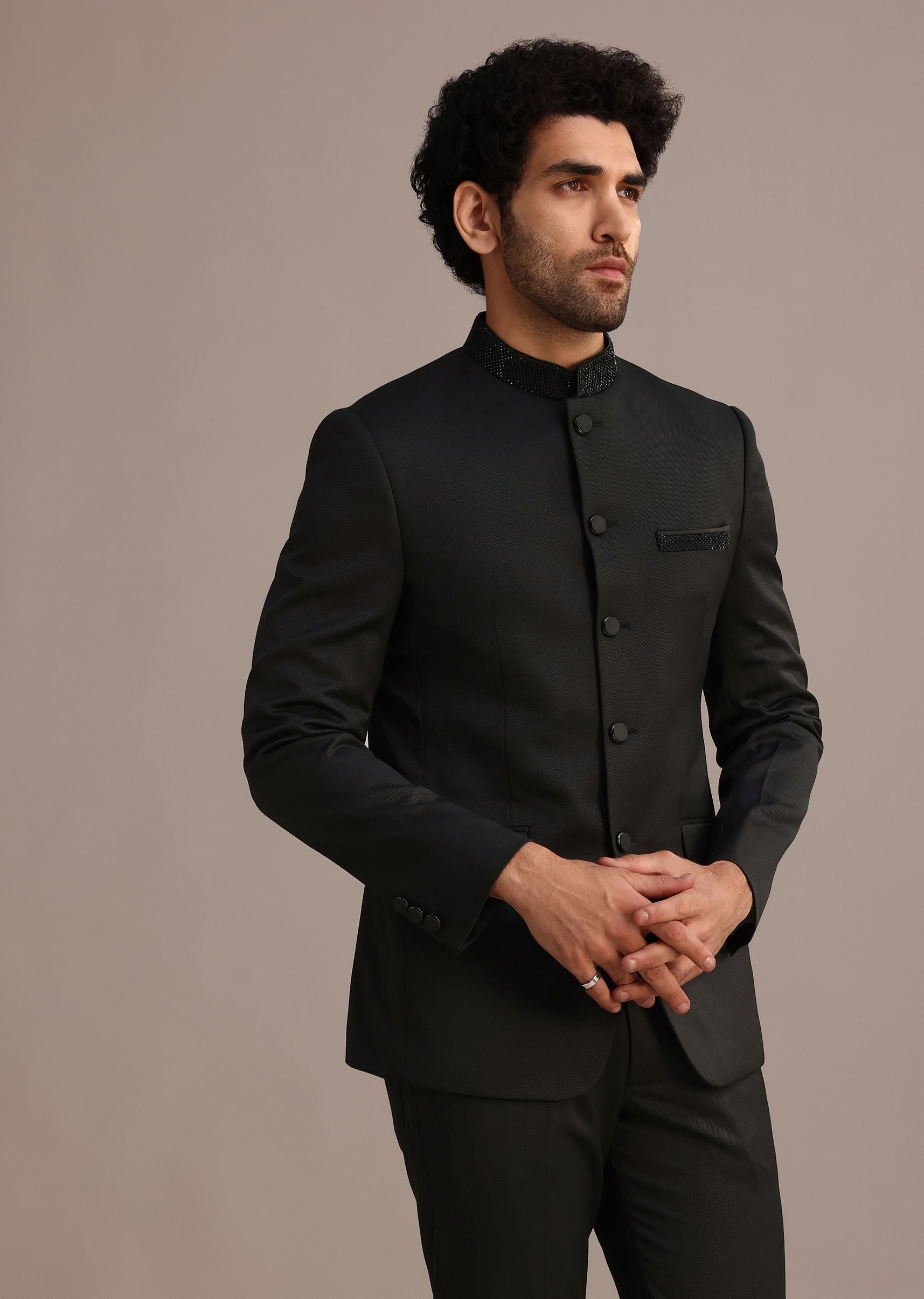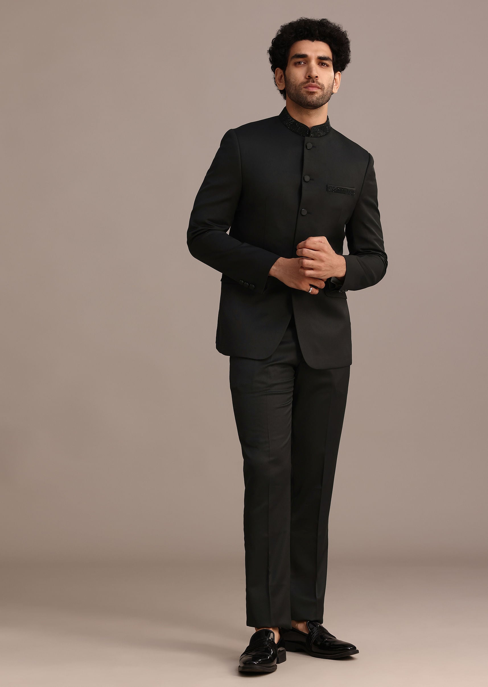 A refined style to add to your wedding wardrobe is this indo-fusion set in tonal black. Perfect for festive celebrations and functions, it is crafted with a mandarin collar, front button placket and full sleeves. Adorned with intricate stone work, the Jodhpuri comes with a matching pocket square and co-ordinating pants. Awarded as the Most Trusted Brand, we're delivering styles you love, just as promised.