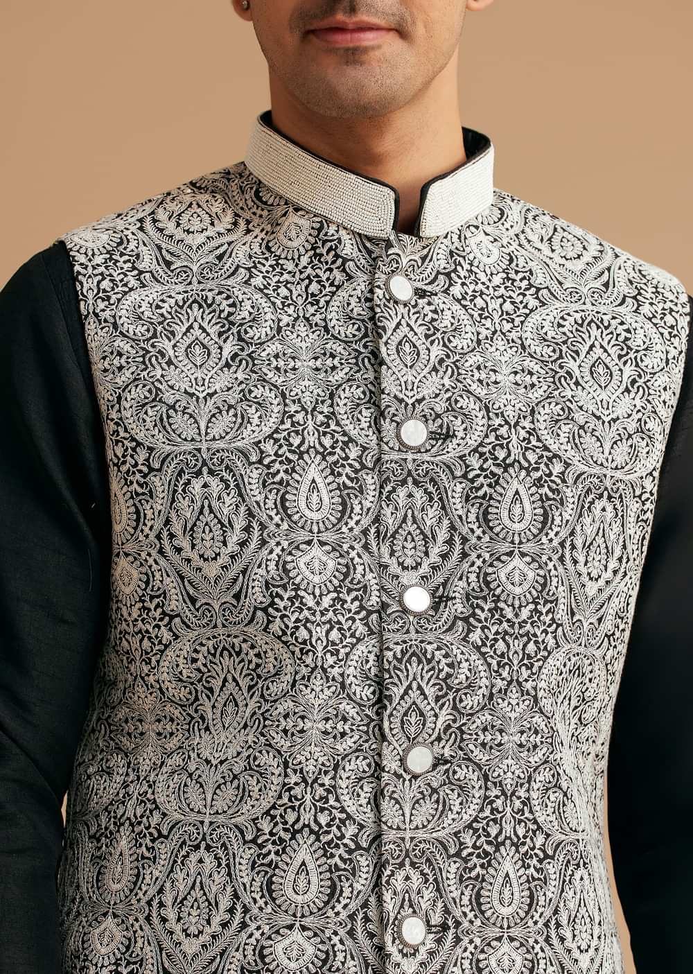 Black Kurta Jacket Set With Resham Work And Hand Embroidered Collar