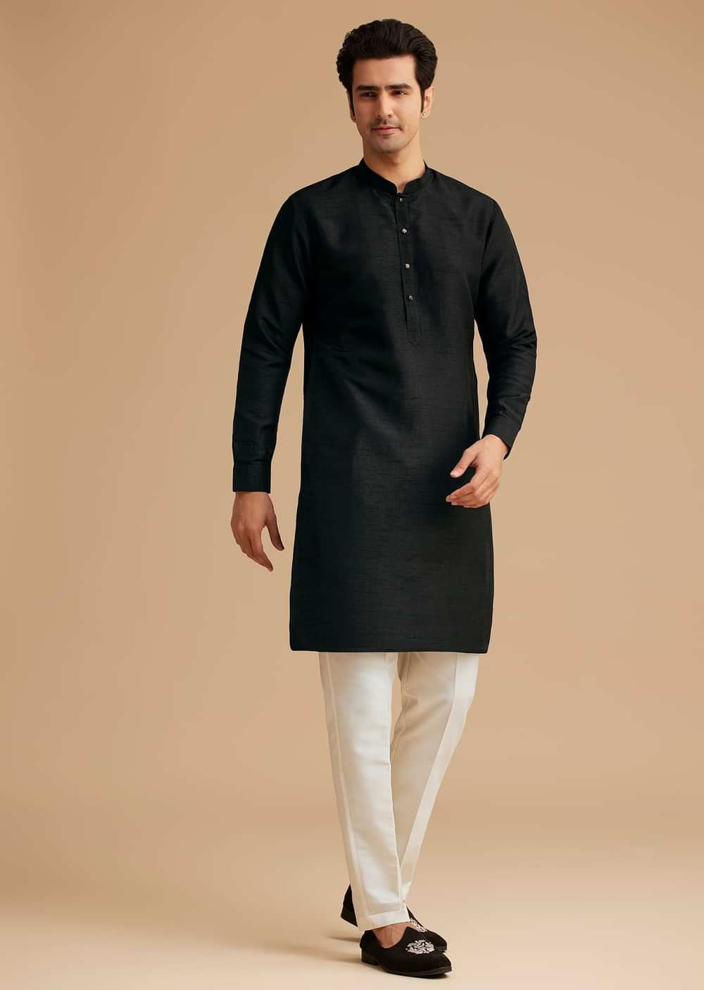 A striking blend of tradition and sophistication, this black kurta jacket set showcases intricate resham embroidery on a richly textured monga silk fabric. The detailed threadwork on the jacket enhances its regal charm, while the hand-embroidered collar adds a refined touch. Paired with a contrasting white churidar, this ensemble is perfect for festive and celebratory occasions.Awarded as the Most Trusted Brand, we're delivering styles you love, just as promised.