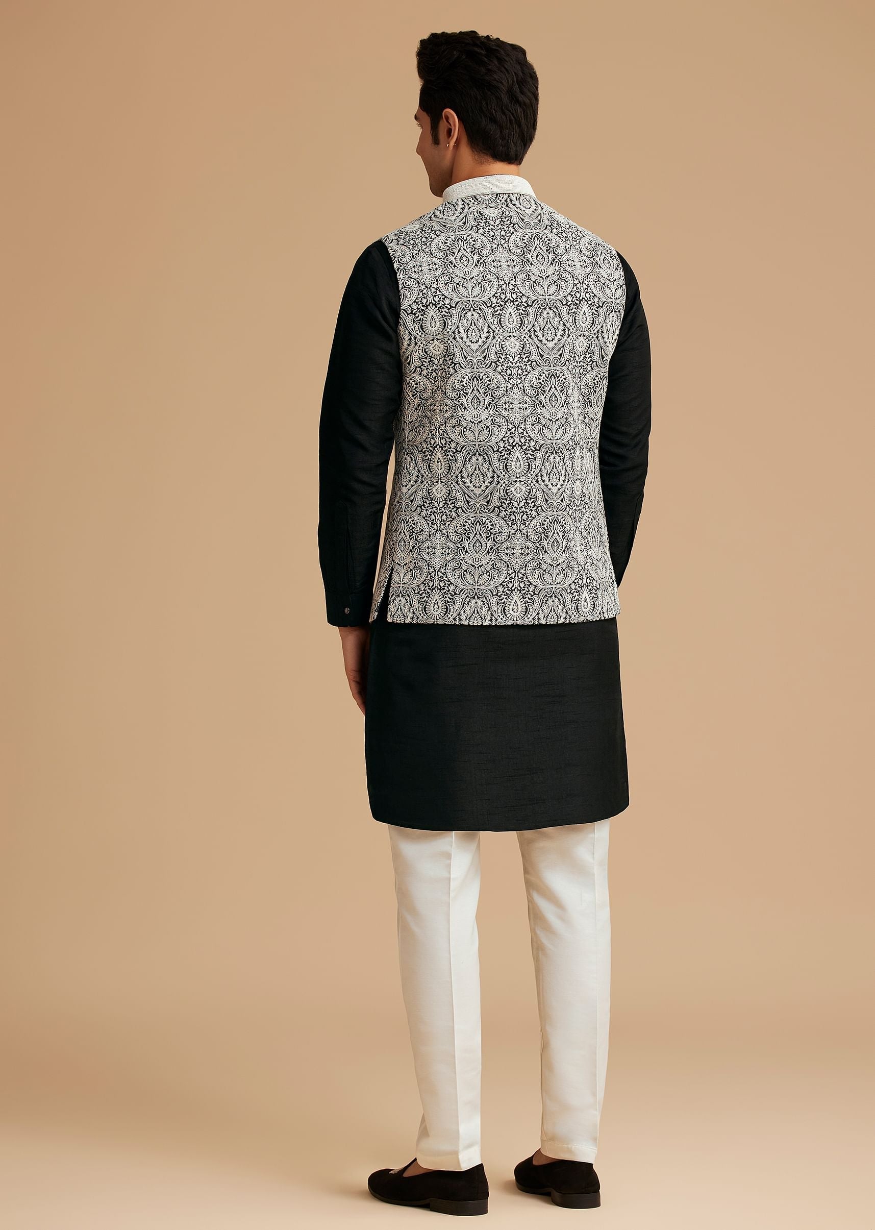 A striking blend of tradition and sophistication, this black kurta jacket set showcases intricate resham embroidery on a richly textured monga silk fabric. The detailed threadwork on the jacket enhances... More Product Details