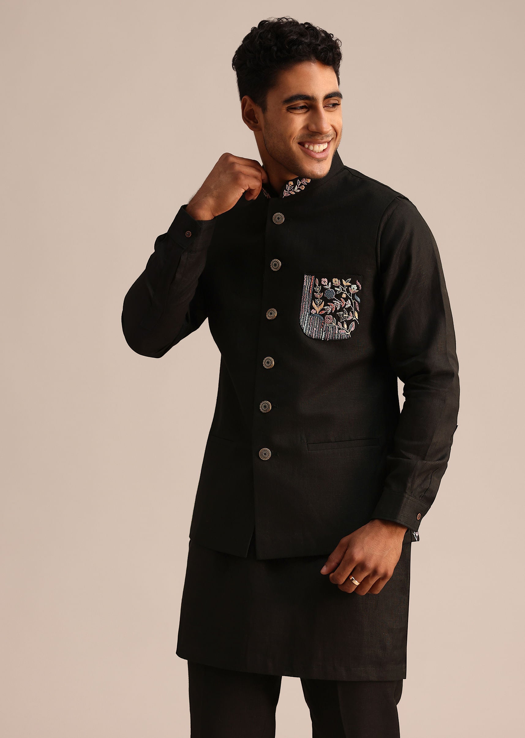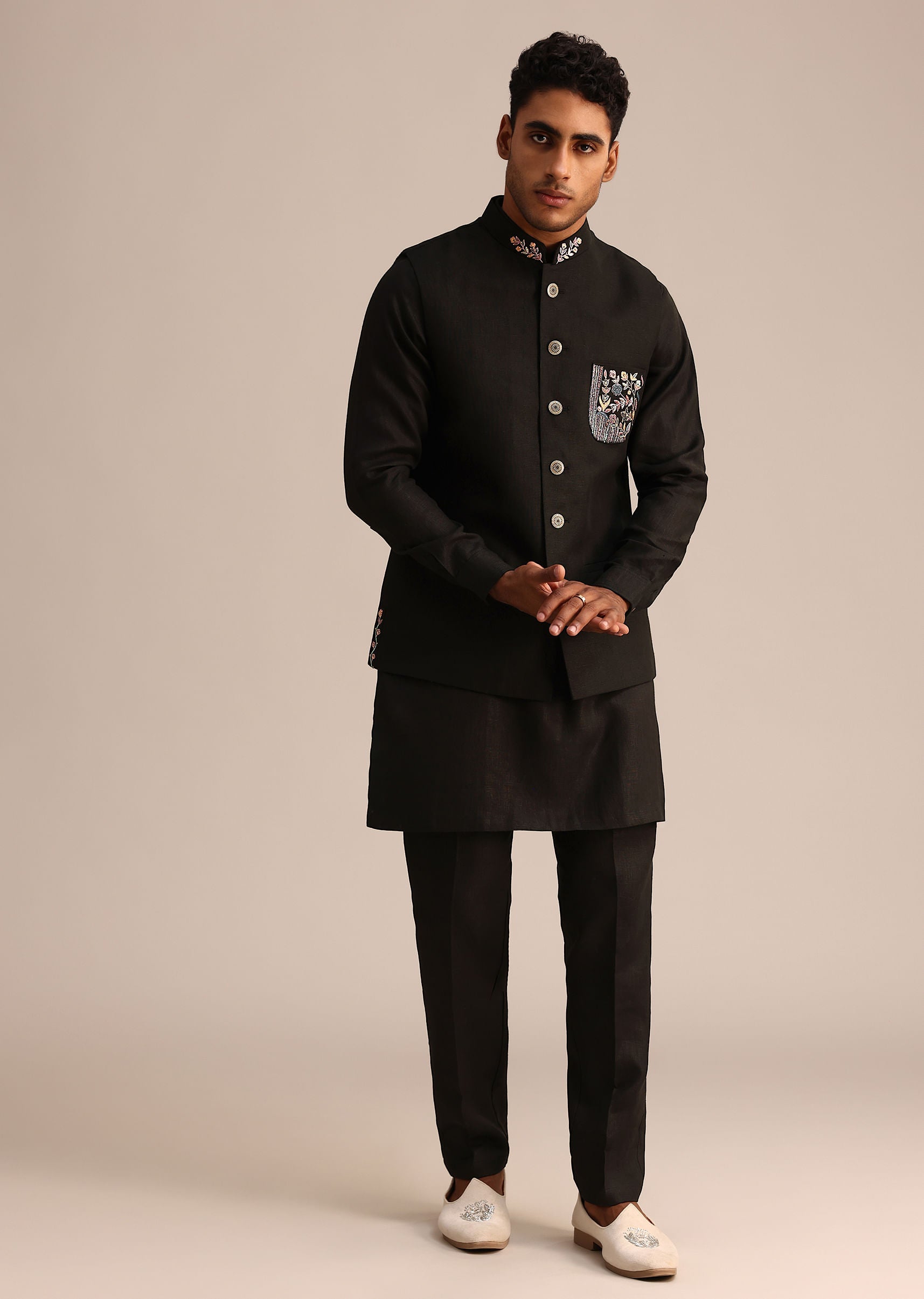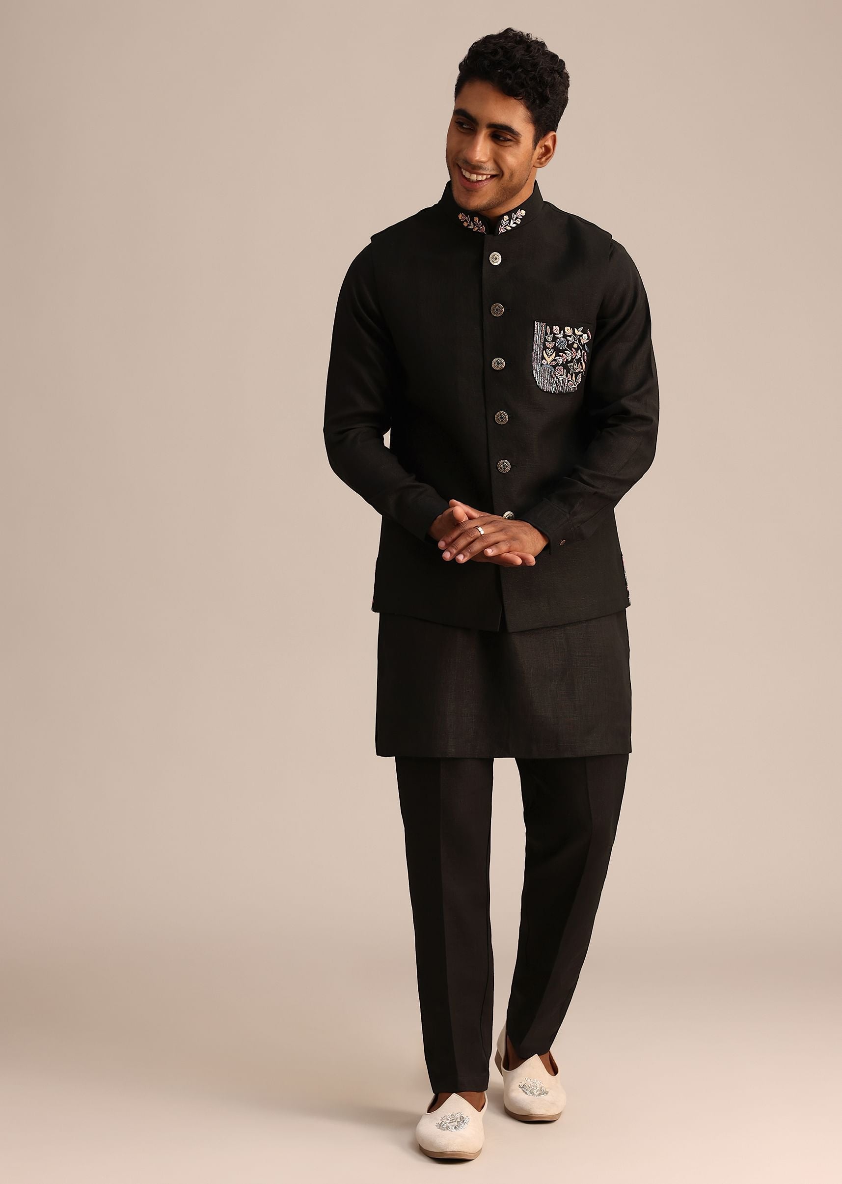 A unique style that will captivate everyone's attention is this fusion ensemble. Crafted from rich linen on a tonal black base, the jacket is adorned with intricate hand work on the pocket and collar. Complemented with a mandarin collar and front button, this set of three will add to your picture-perfect memories at year-round wedding celebrations and festive occasions. Awarded as the Most Trusted Brand, we're delivering styles you love, just as promised.