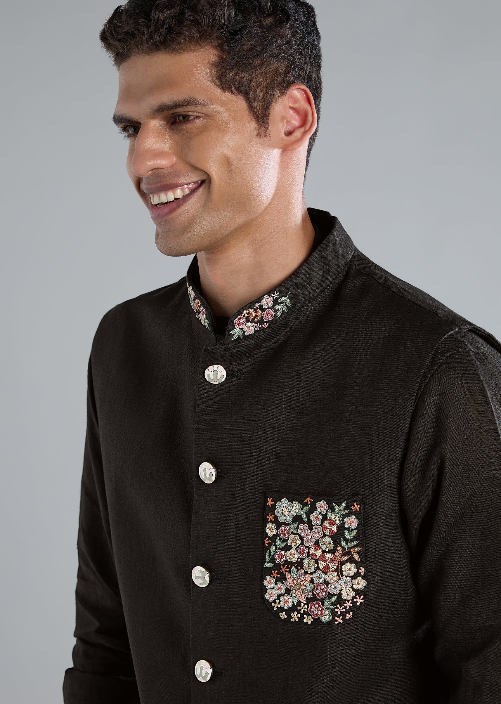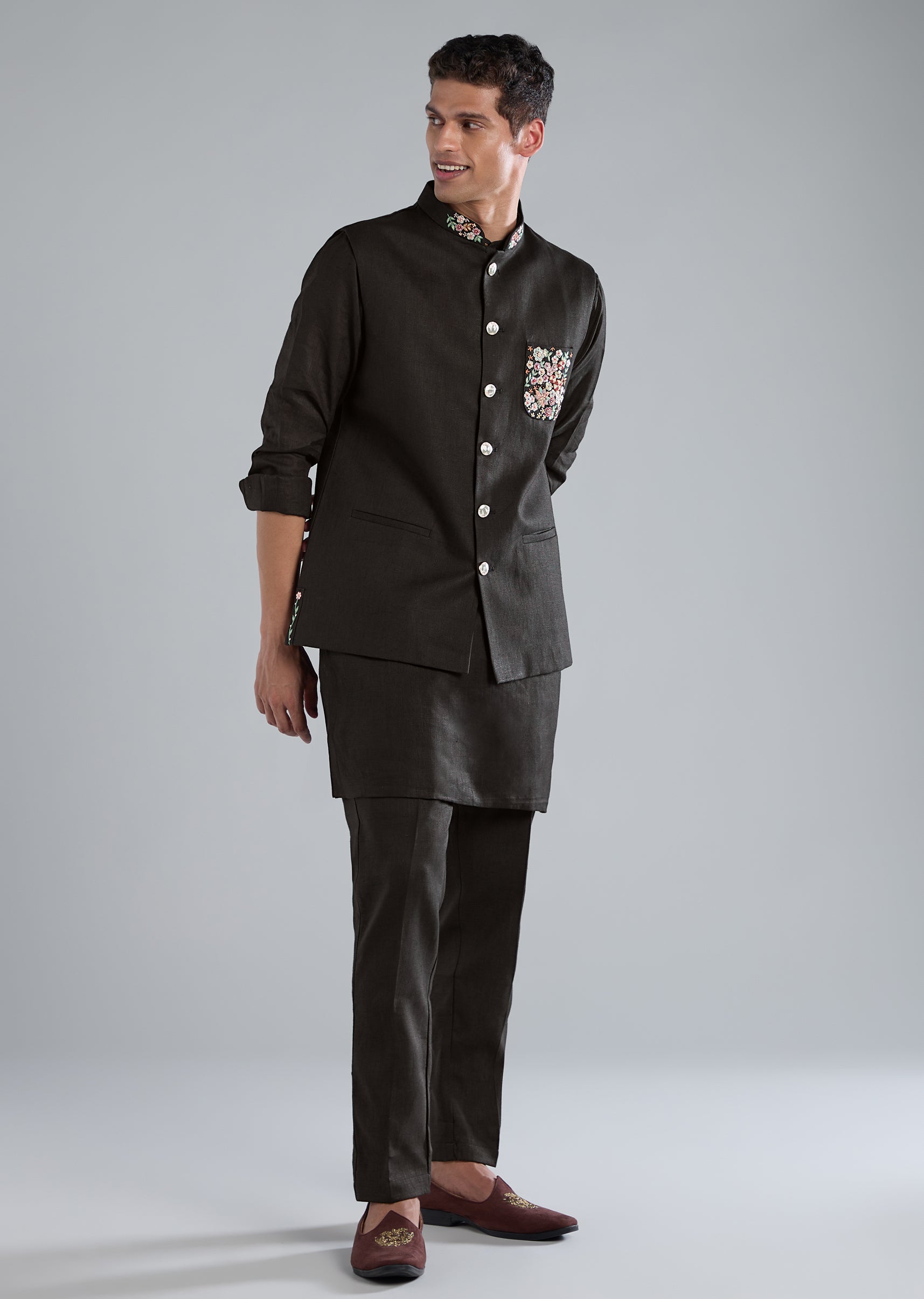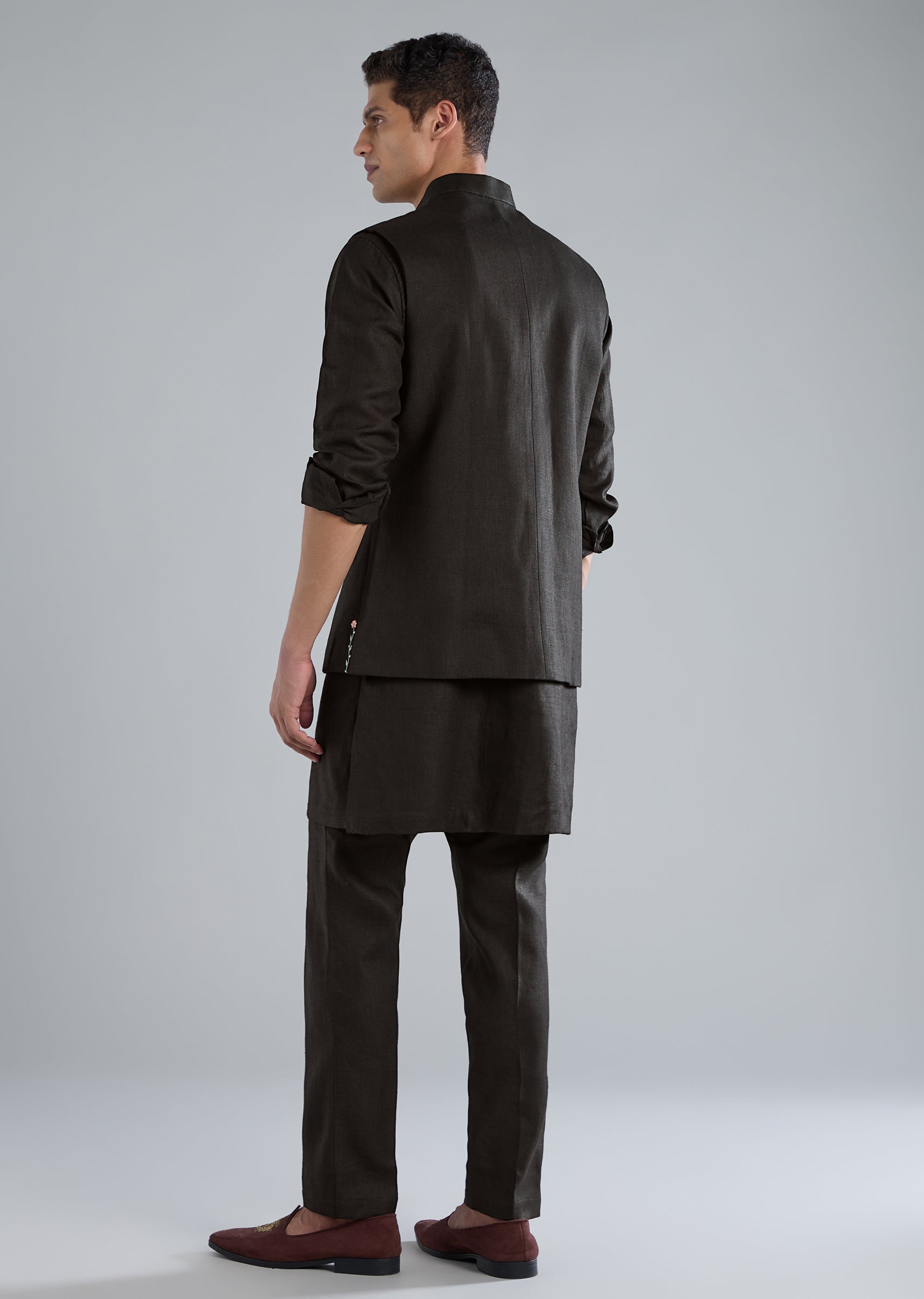 Black Linen Kurta Jacket Set With Thread Resham Work