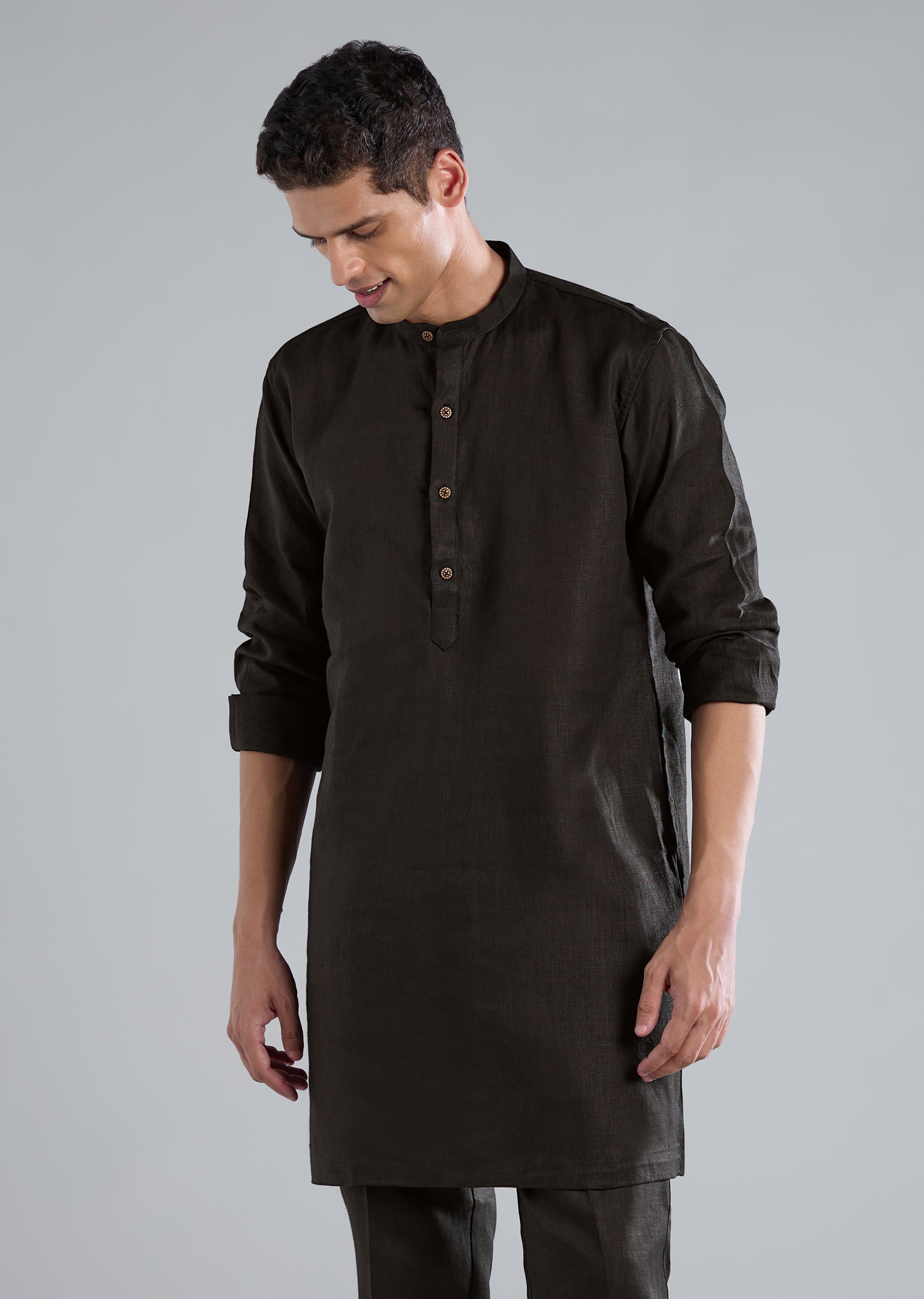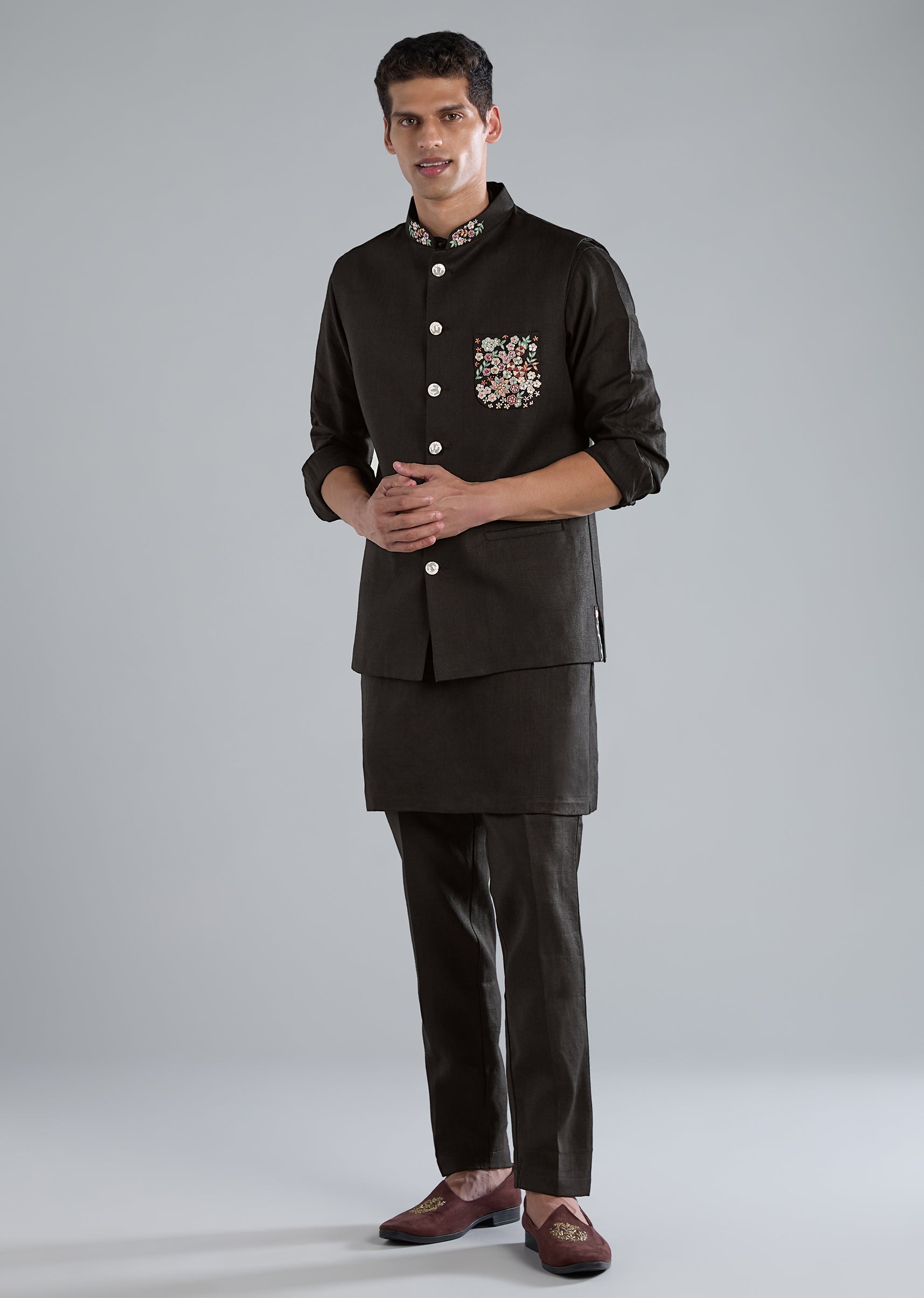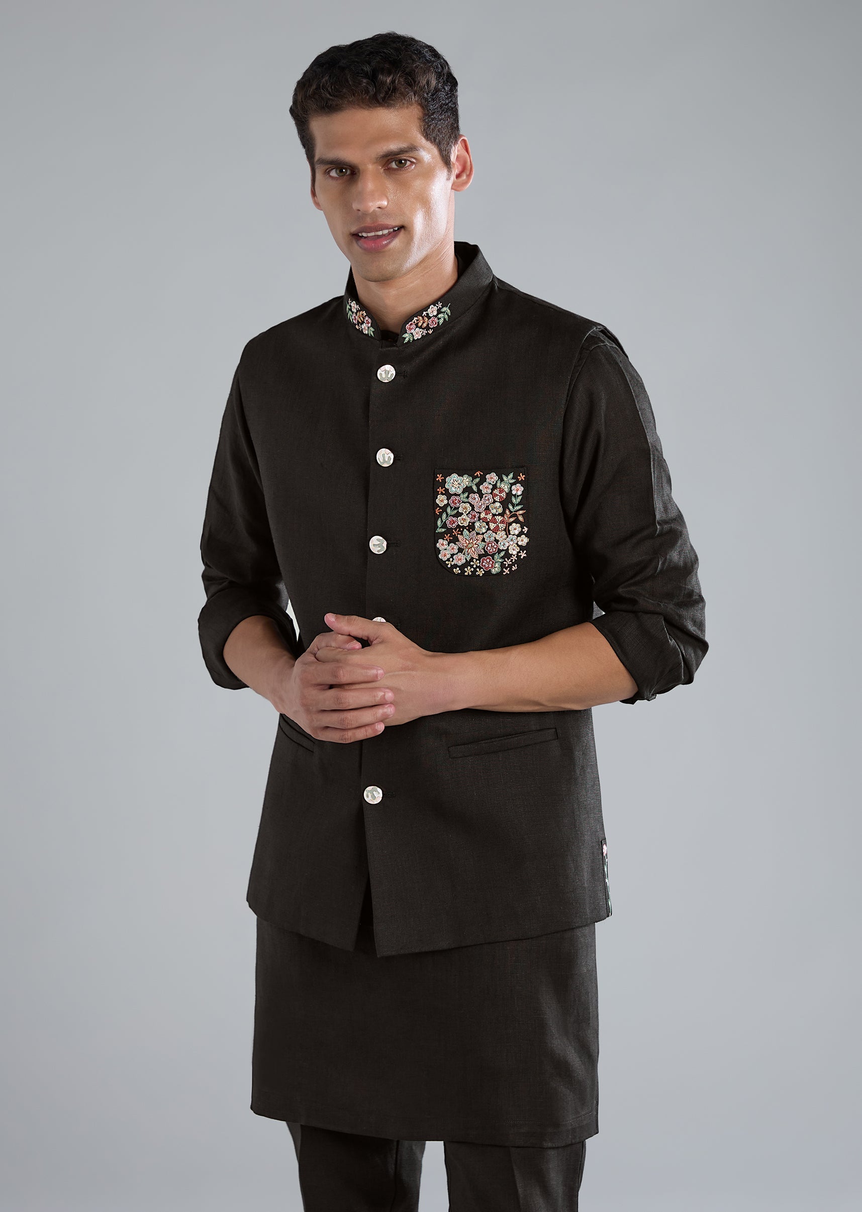 Black Linen Kurta Jacket Set With Thread Resham Work
