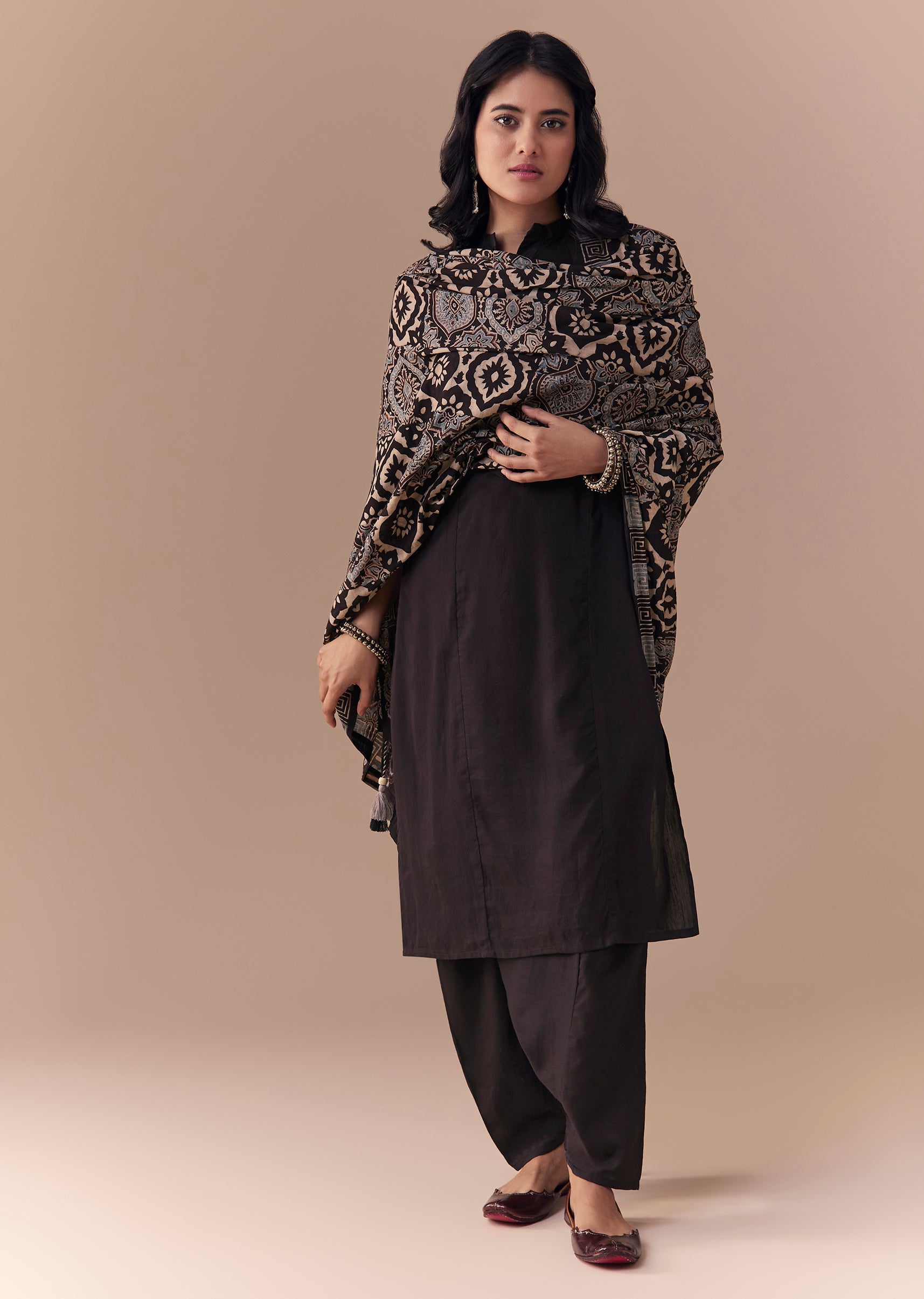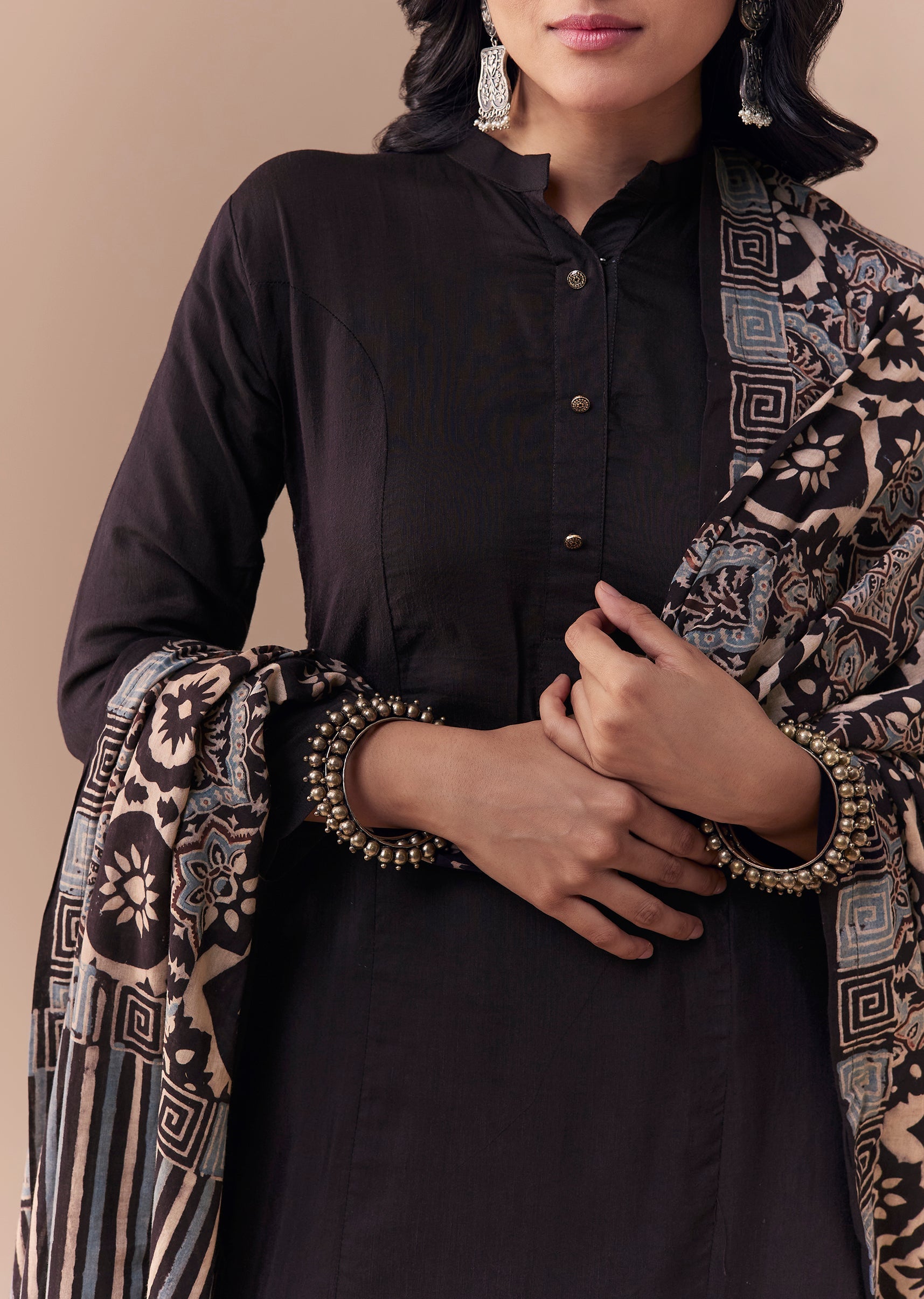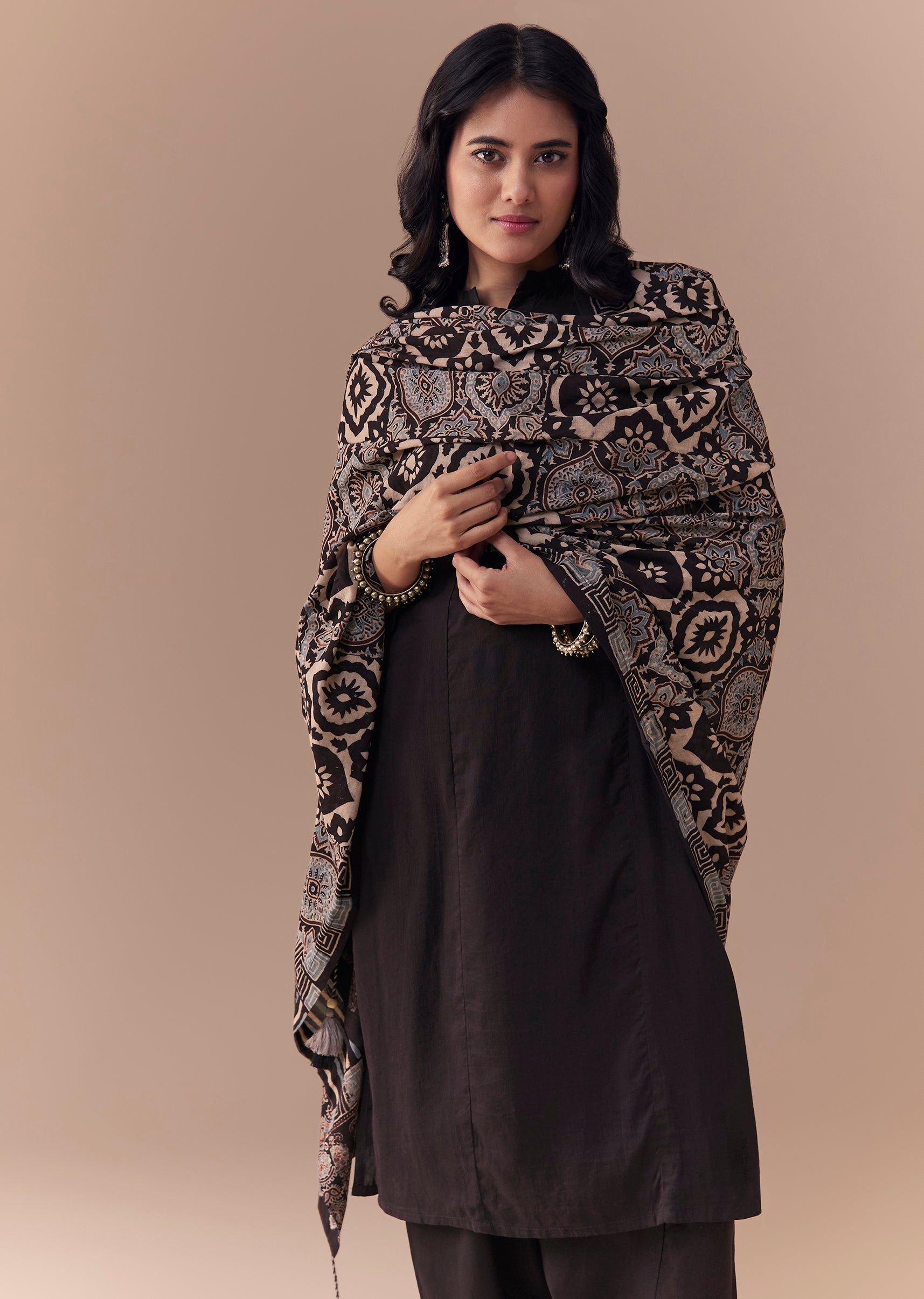 Exquisite Ajrakh artistry breathes life into this black linen kurta set. Bold handblock motifs turn the dupatta into a statement piece of craft and character. The sleek kurta-pant silhouette adds... More Product Details