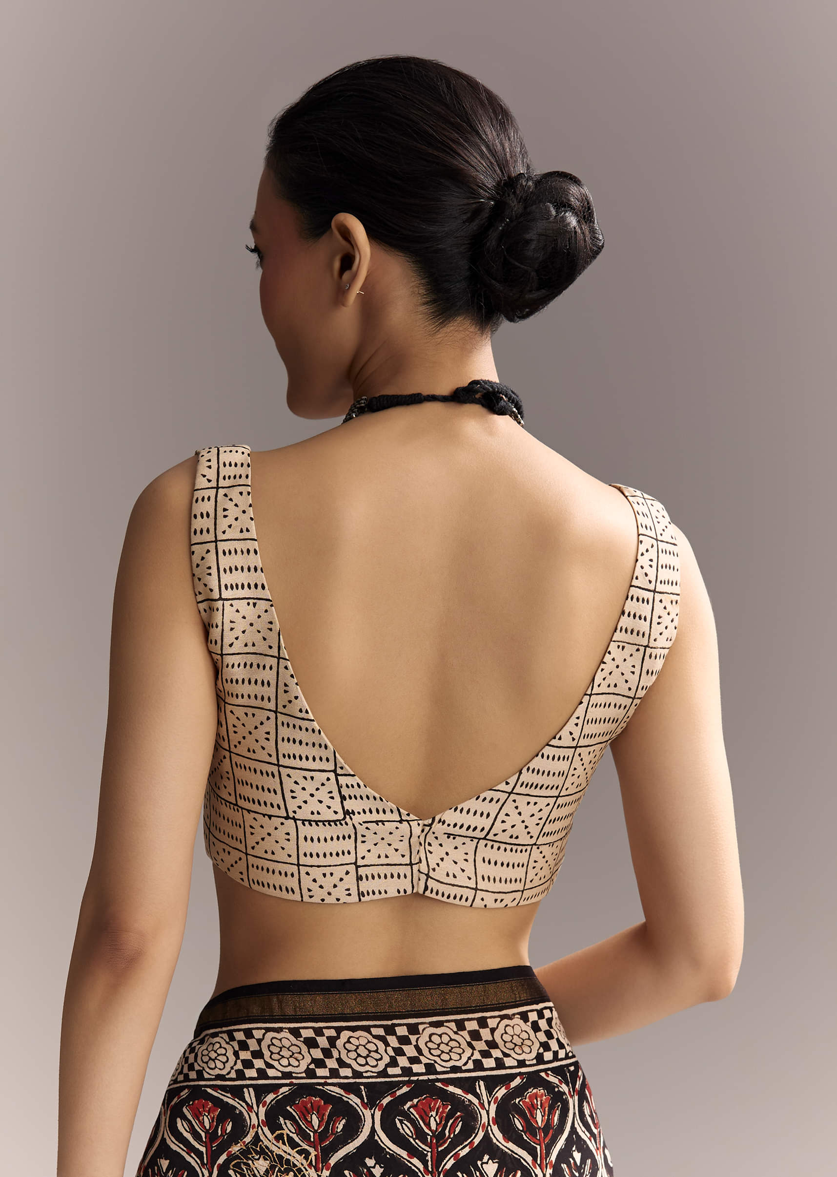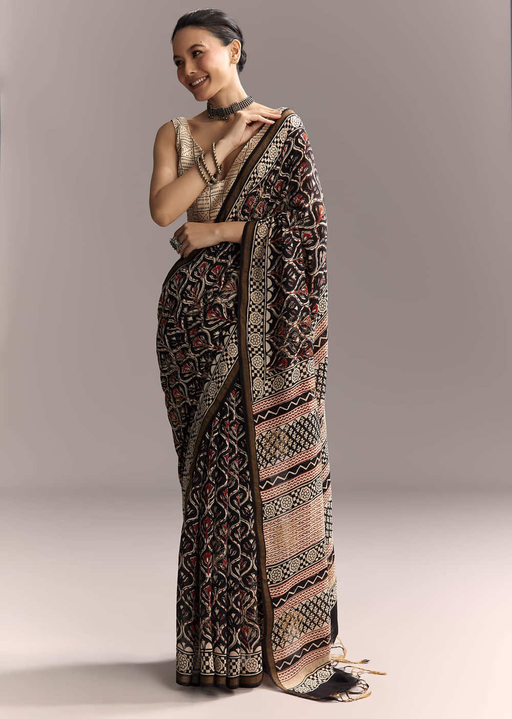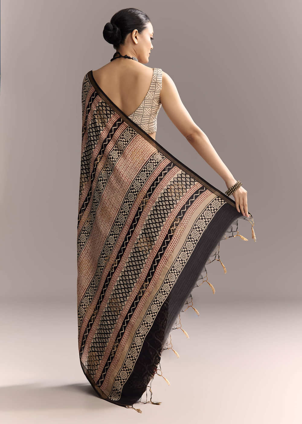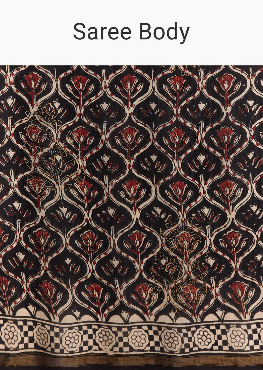 Black Linen Saree With Authentic Ajrakh Print And Maroon Border