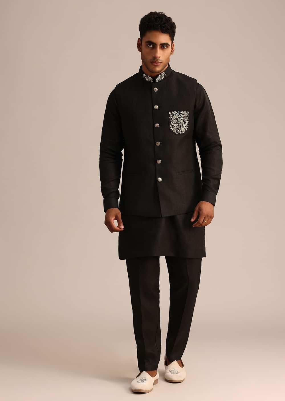 Black Linen Zardosi Embroidered Jacket Kurta Set
