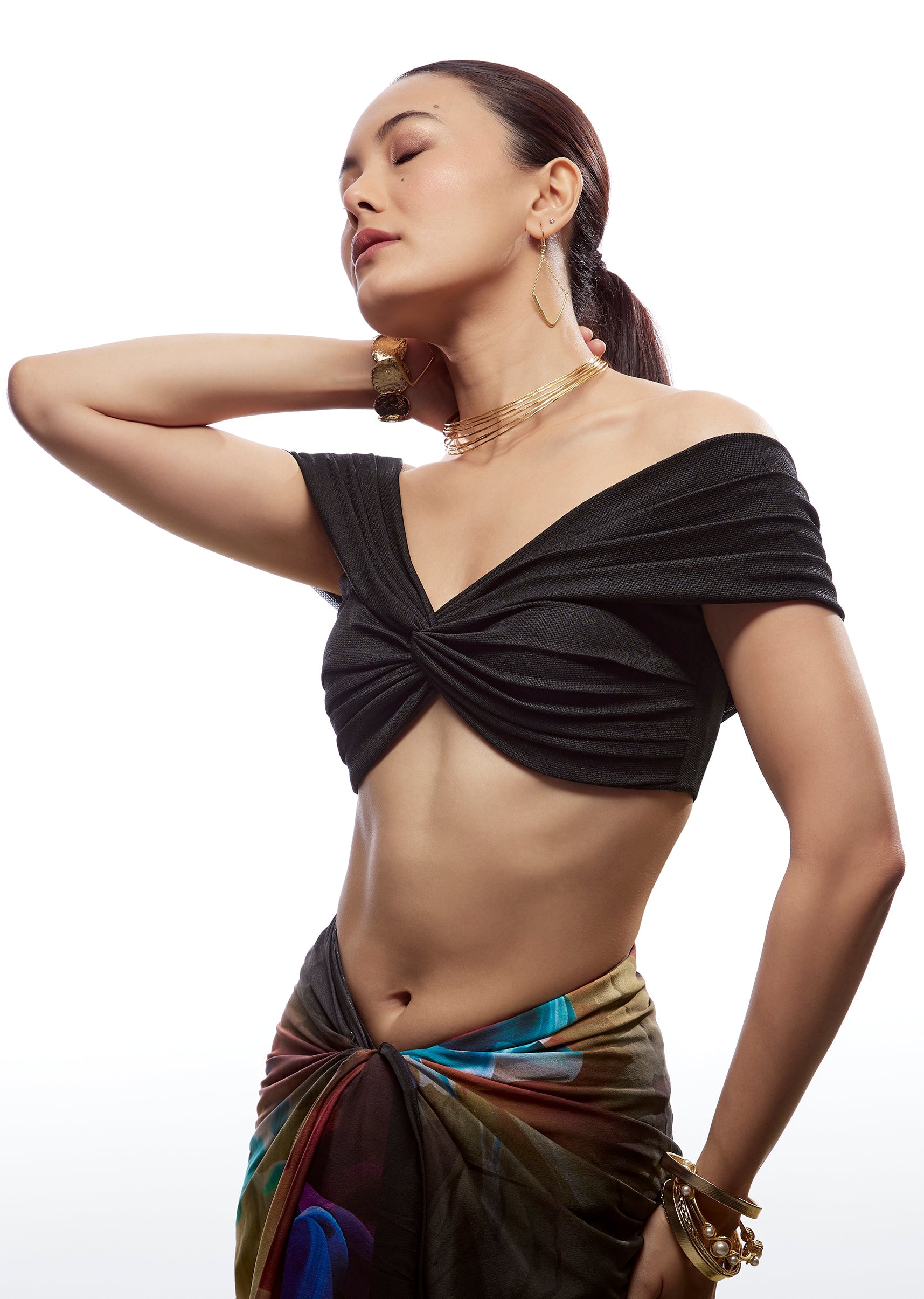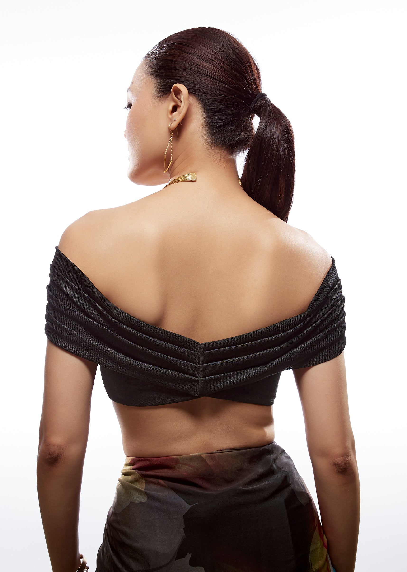Made in stretch lycra, this ruched off-shoulder blouse enhances the neckline beautifully while offering comfort and flexibility. The back hook-eye closure ensures secure wear, making it ideal for cocktail sarees... More Product Details