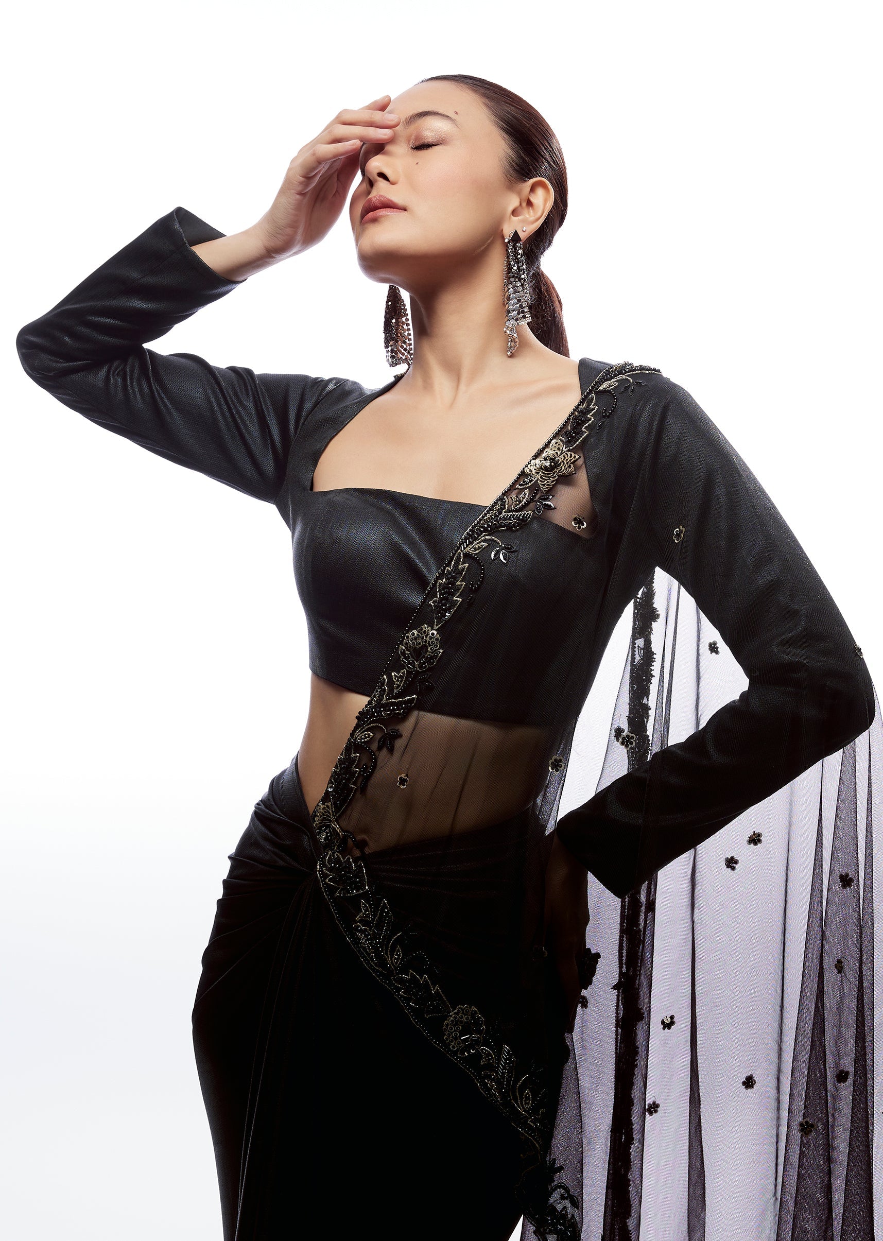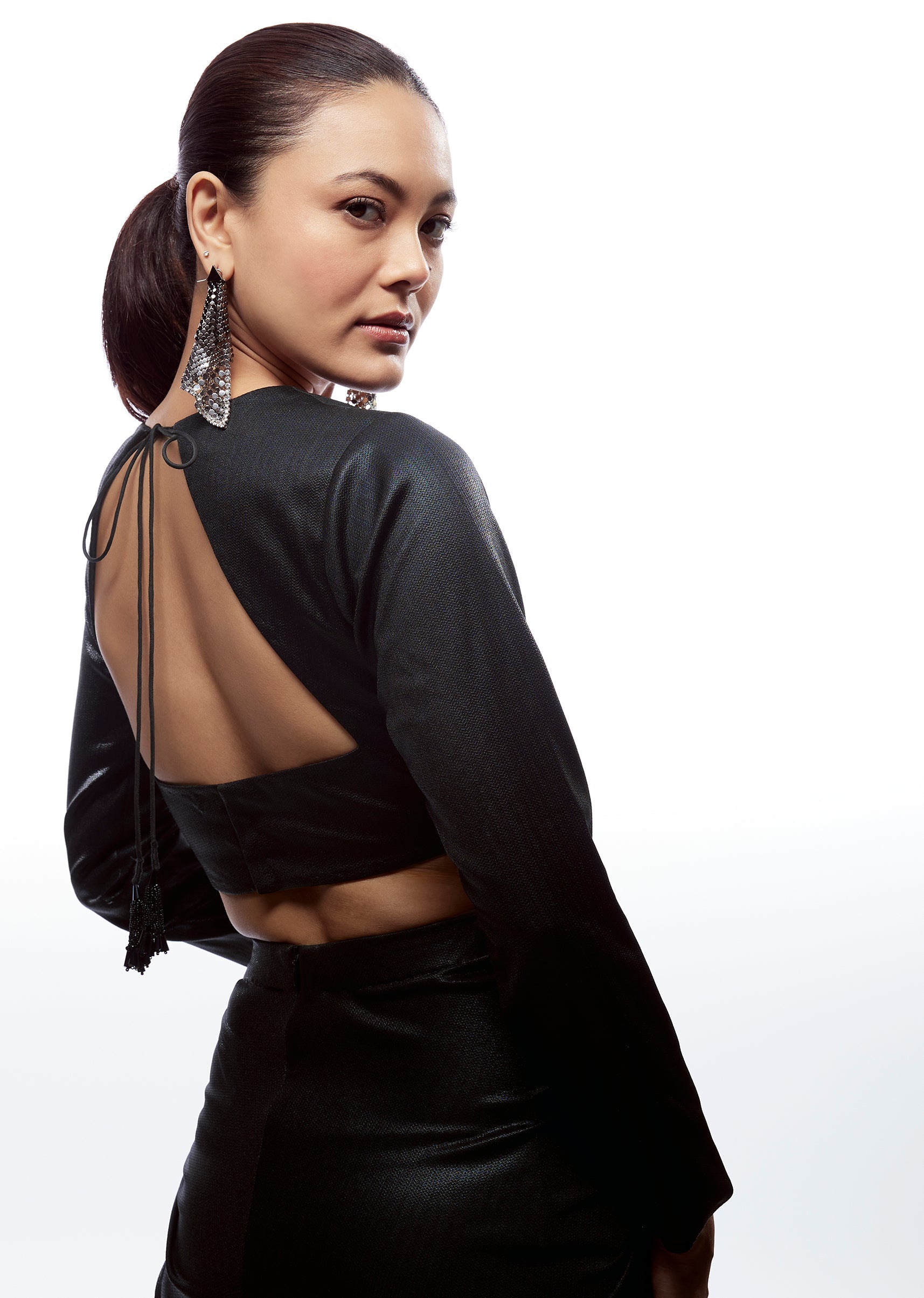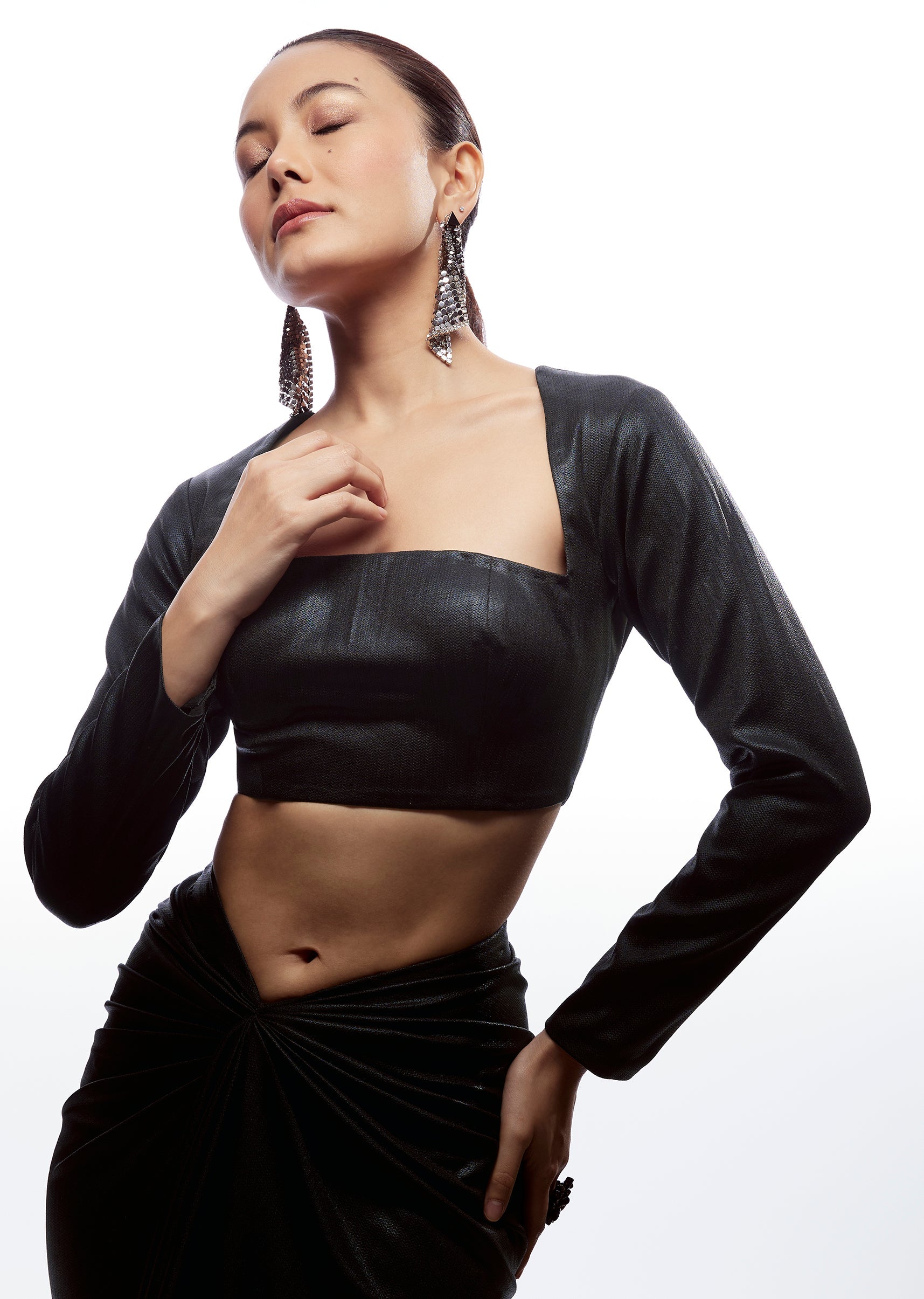 Made in stretch lycra, this blouse features a square neckline and full sleeves for a clean, modern look. Side zip closure makes it easy to wear while keeping the fit... More Product Details