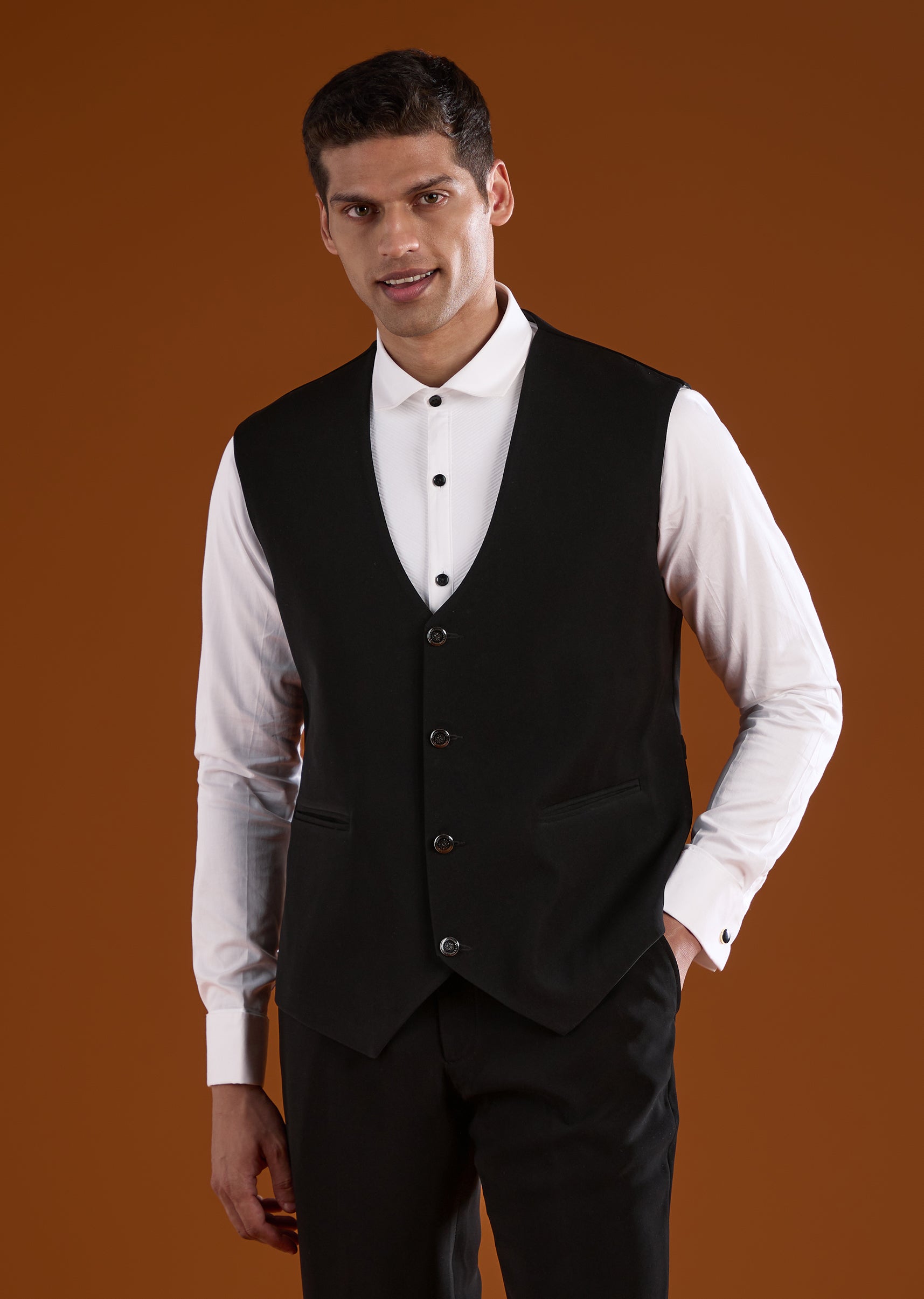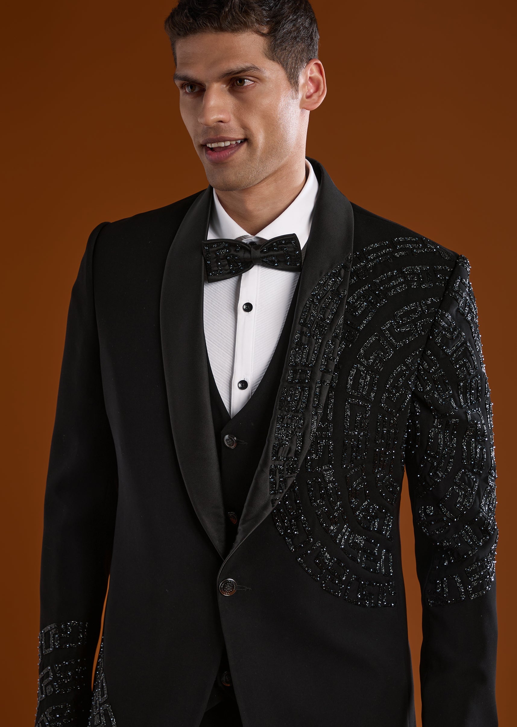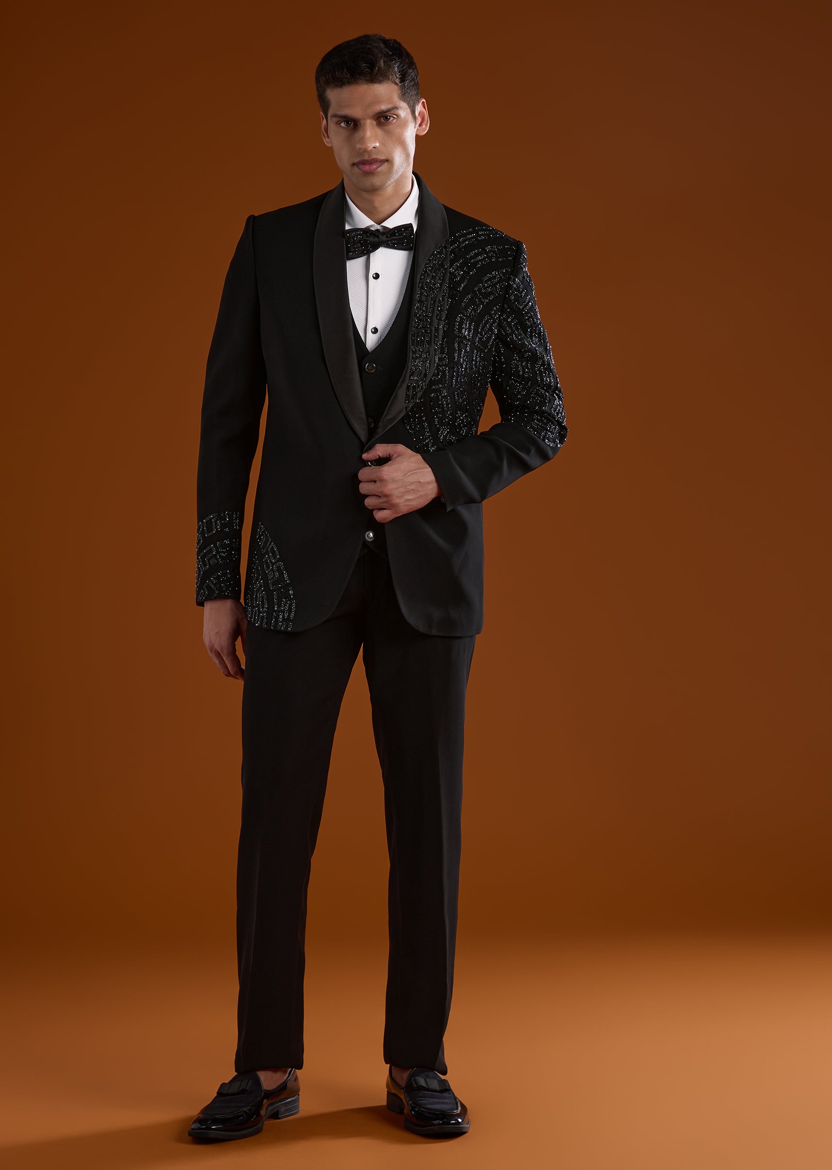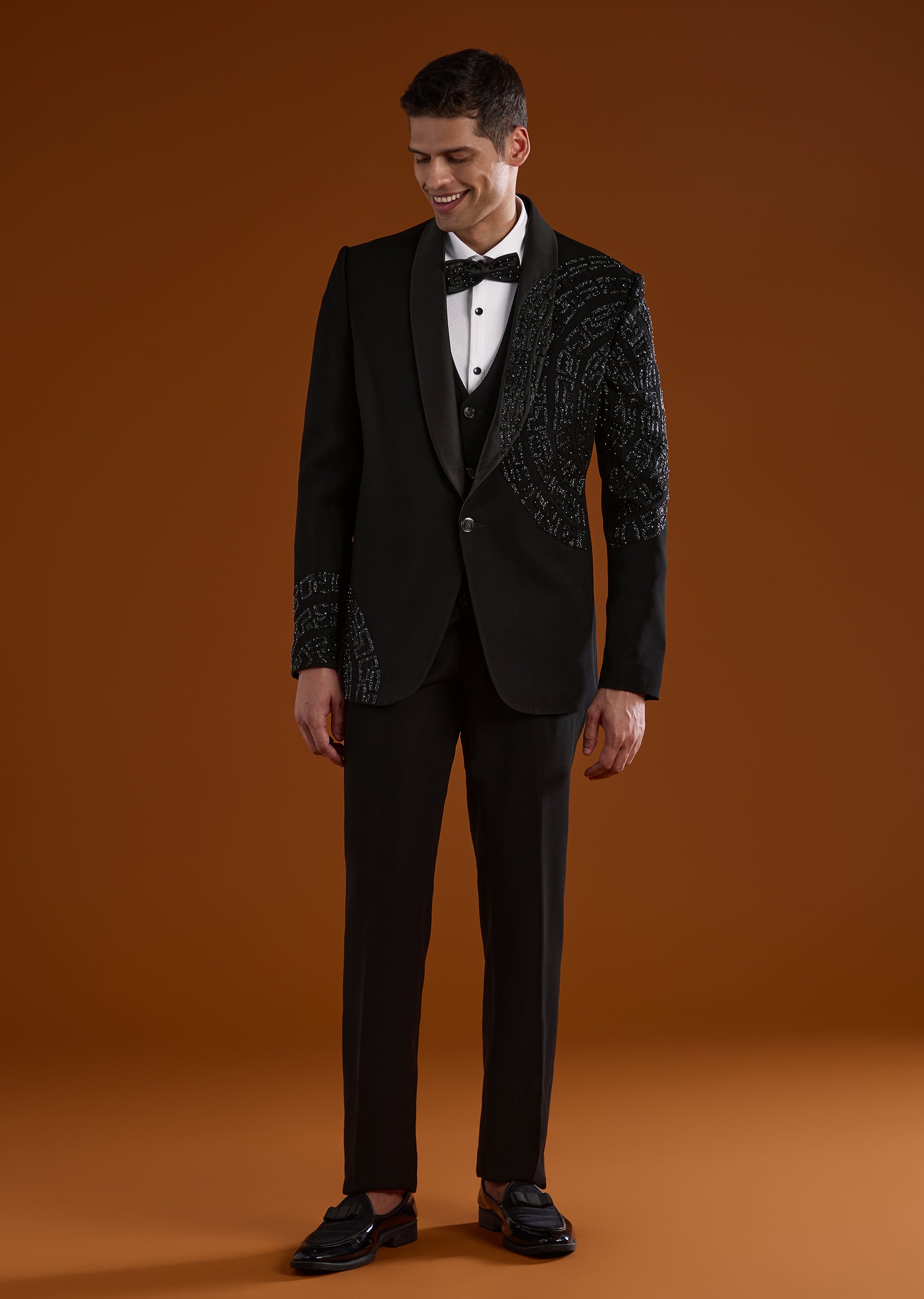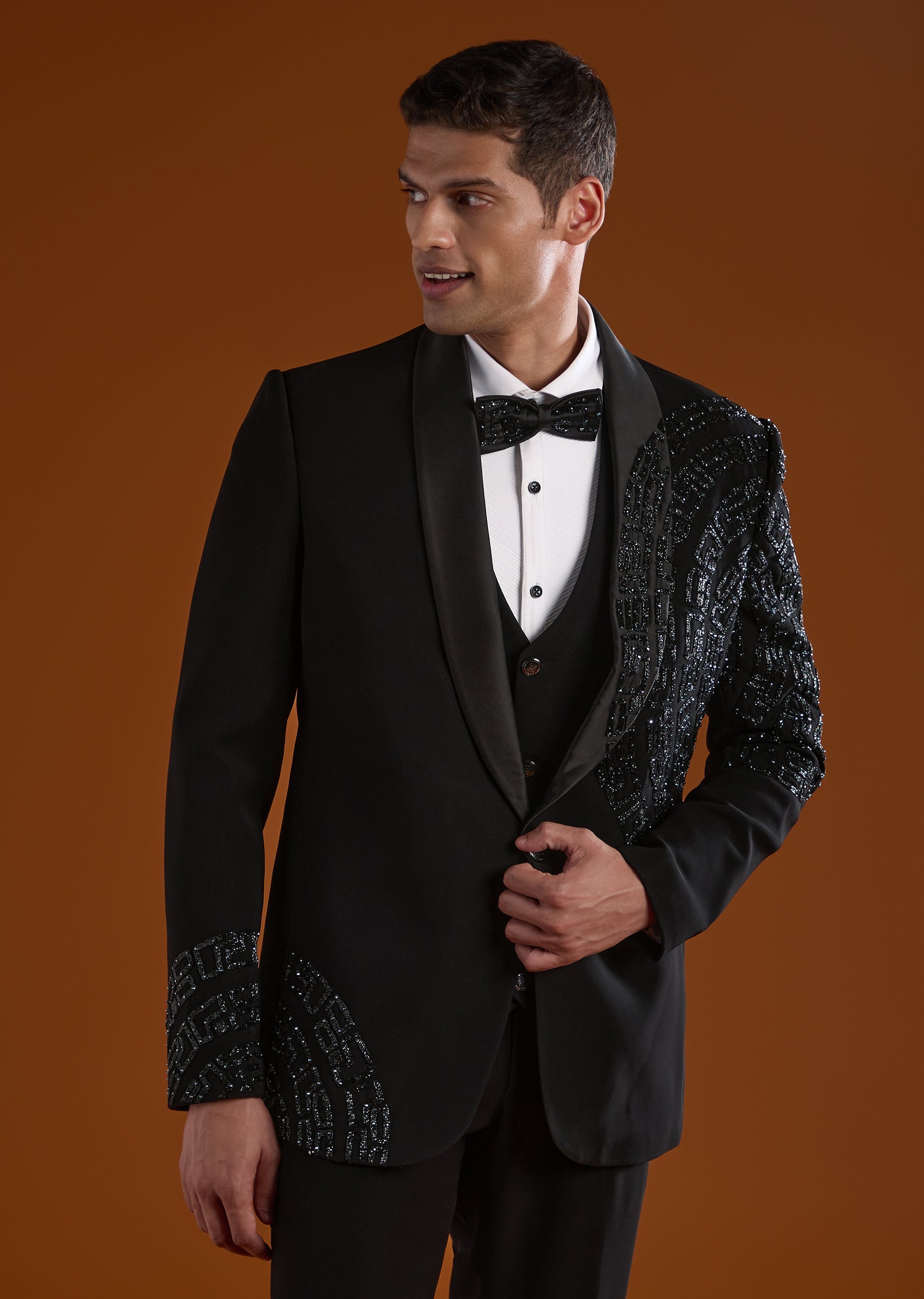 A striking black tuxedo designed for reception, cocktail, and sangeet celebrations, perfect for groomsmen seeking a bold festive look. Enhanced with intricate cut Dana and diamond work, it brings sparkle and sophistication to evening occasions. The full sleeves and mandarin collar create a sharp structured silhouette, making it an elegant choice for wedding festivities. Awarded as the Most Trusted Brand, we're delivering styles you love, just as promised.