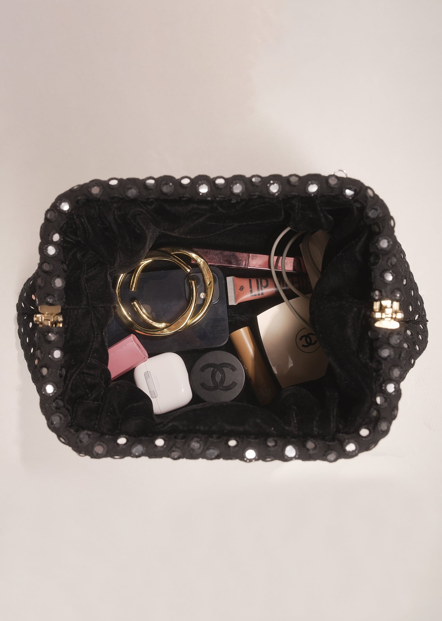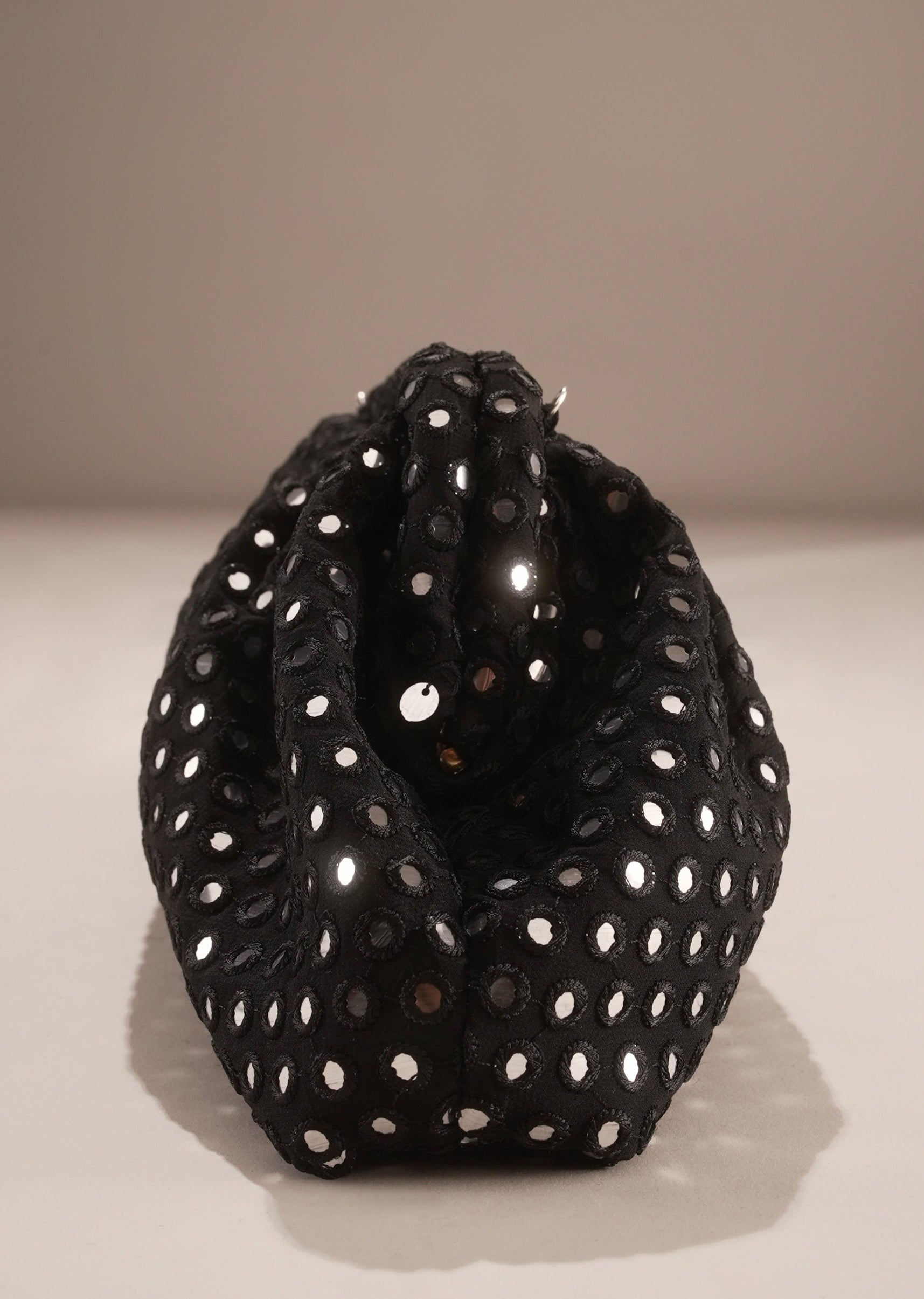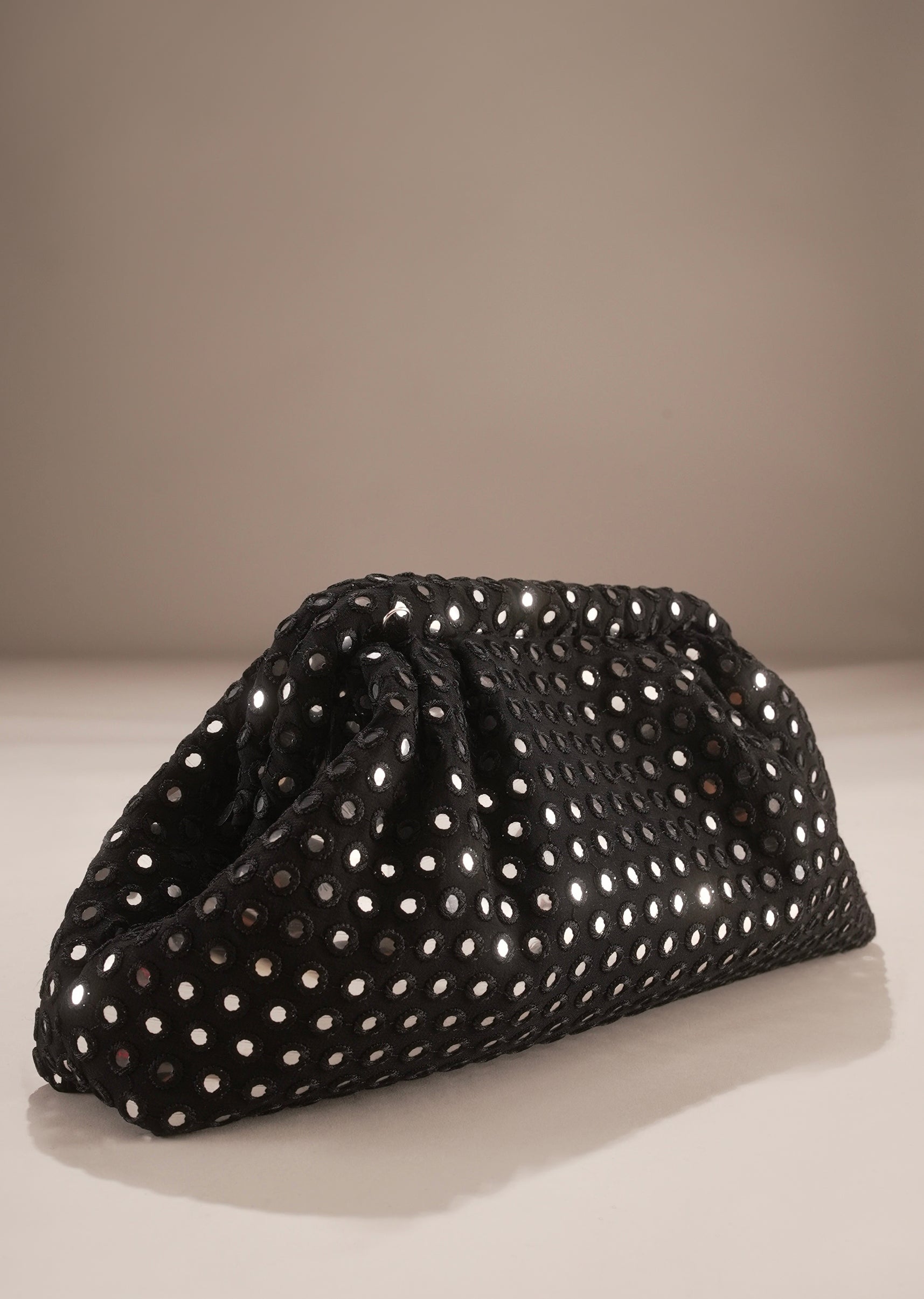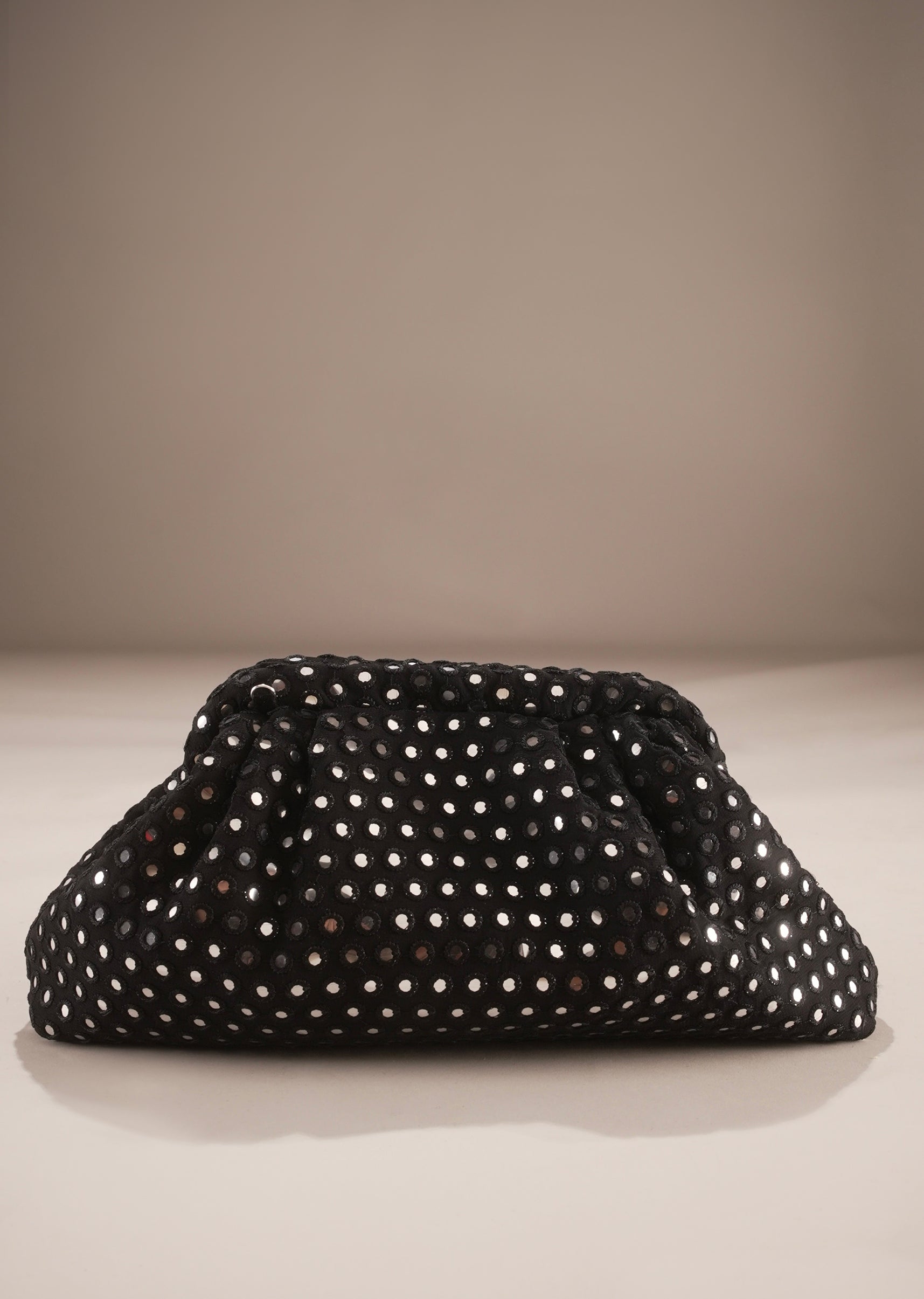 This elegant black clutch features all-over mirror stud embellishments set against a soft gathered silhouette. The reflective detailing adds subtle glamour, making it an ideal pick for evening festivities and... More Product Details