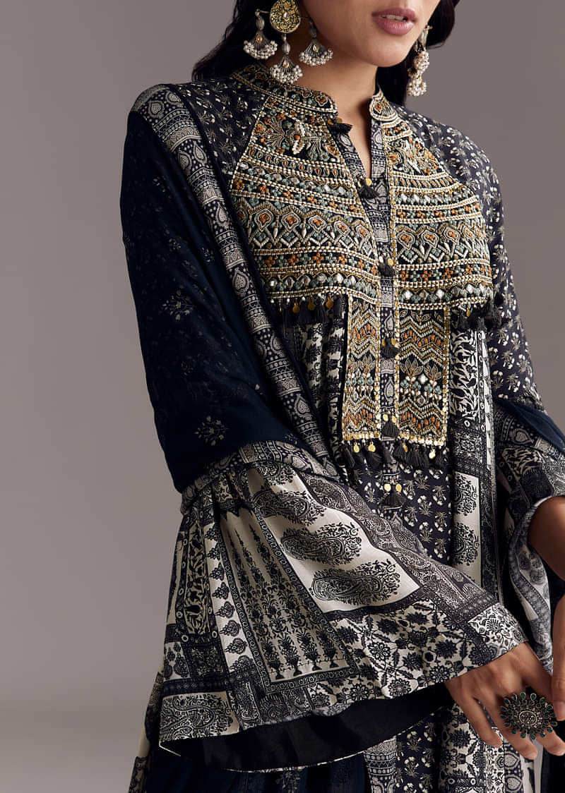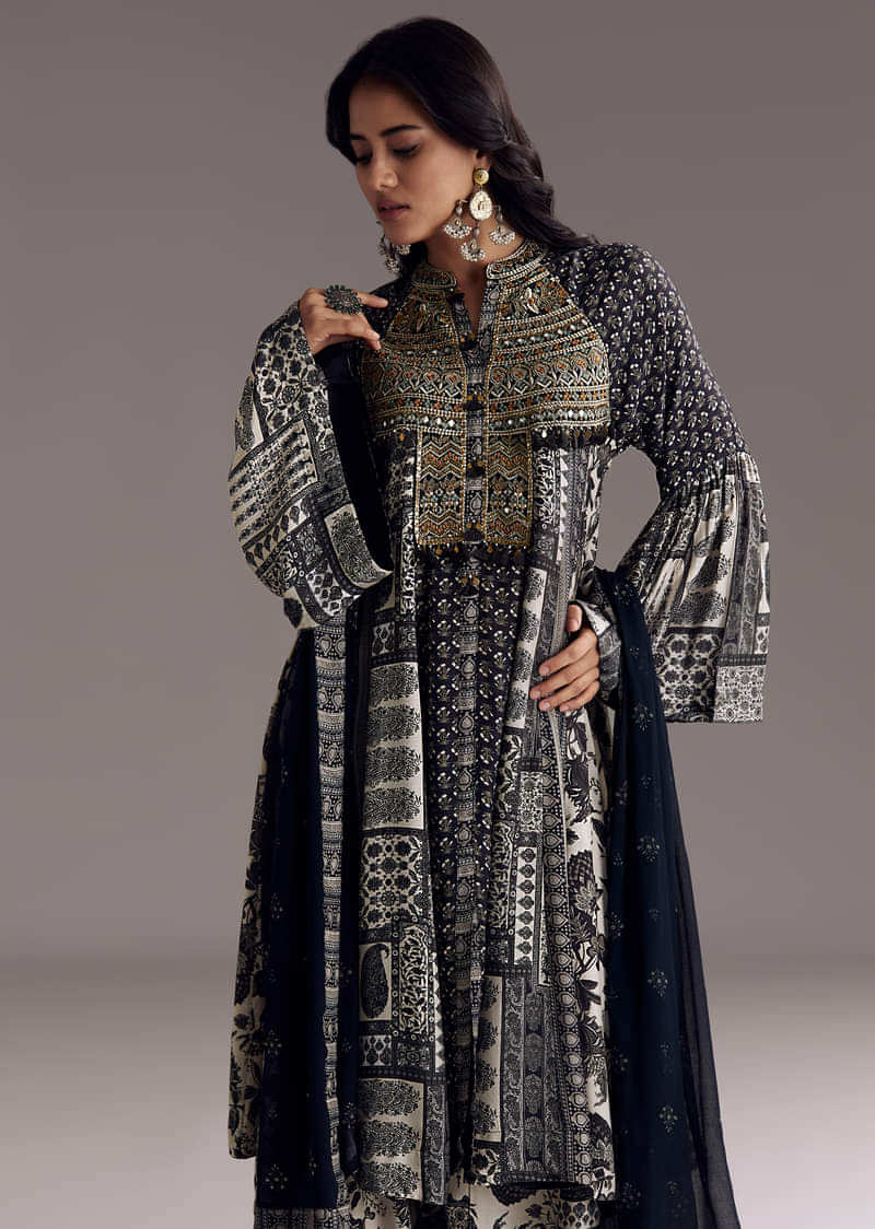 Black Mixed Print Muslin Palazzo Set With Resham Work