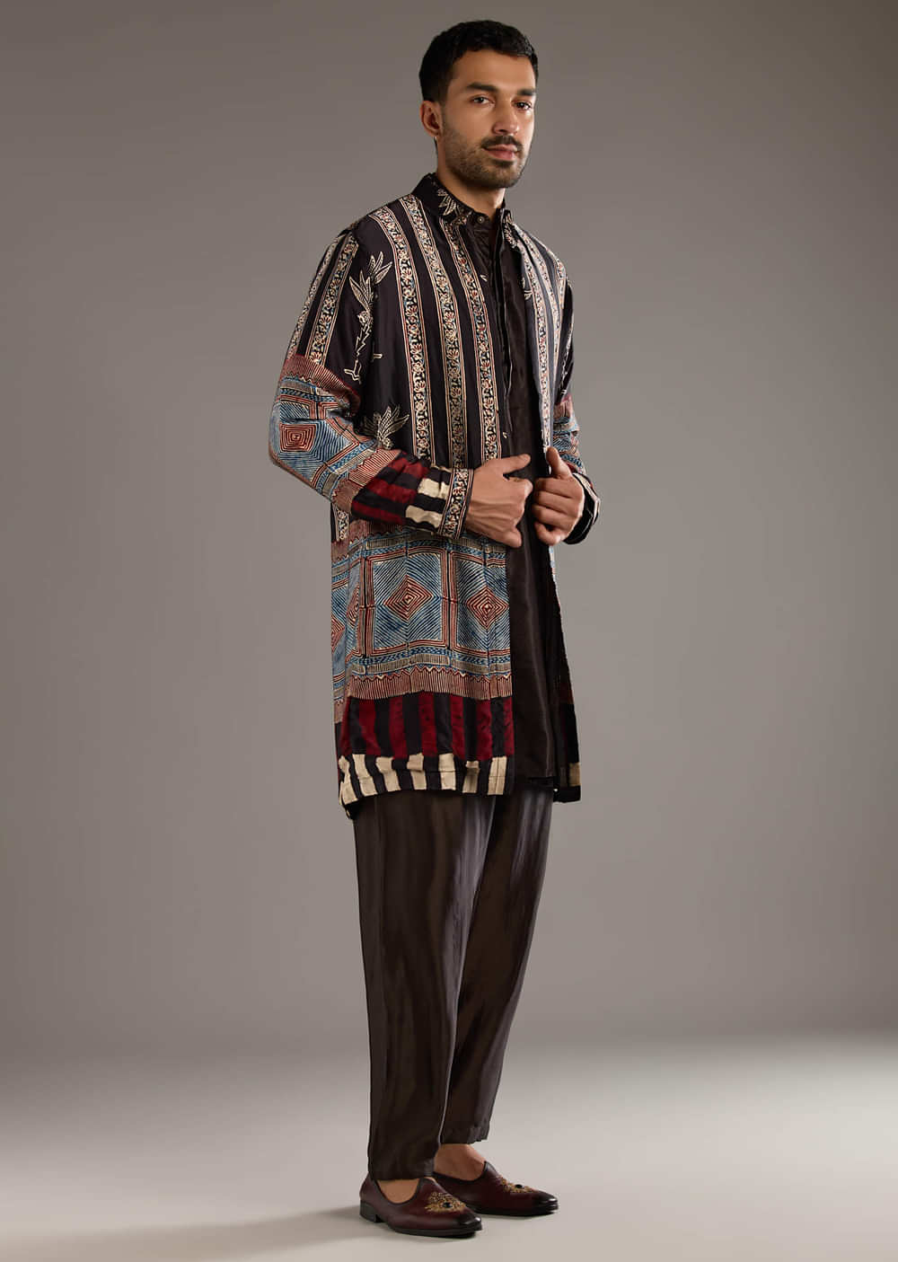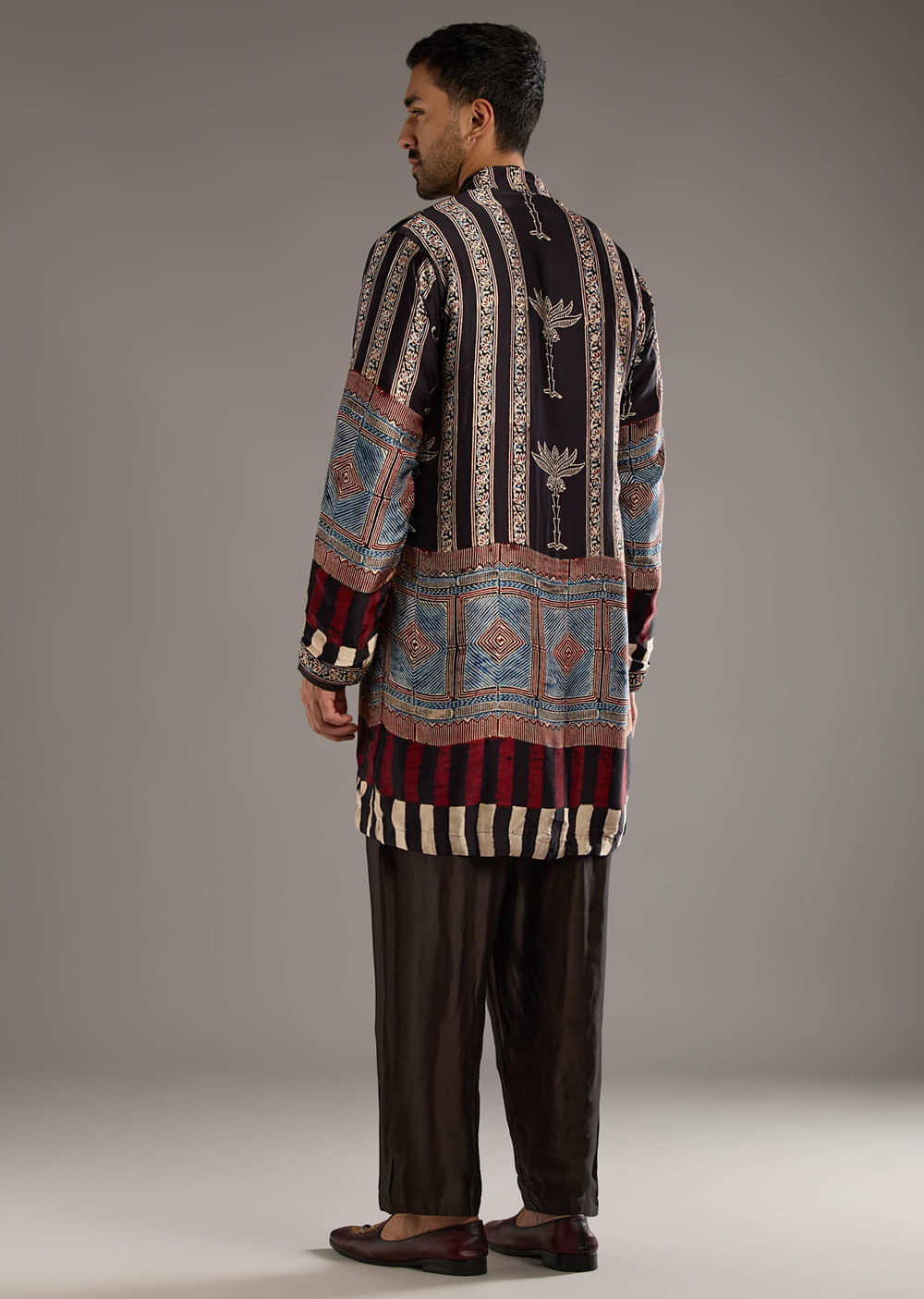 Black Modal Linen Kurta Jacket Set For Men With Hand Block Ajrakh Print