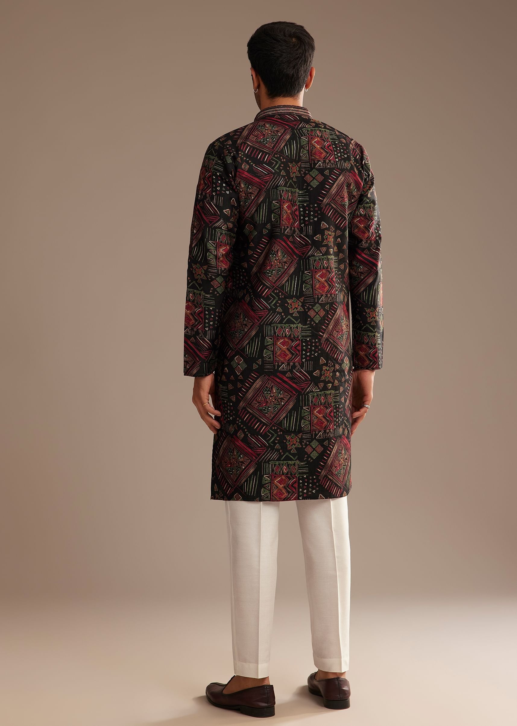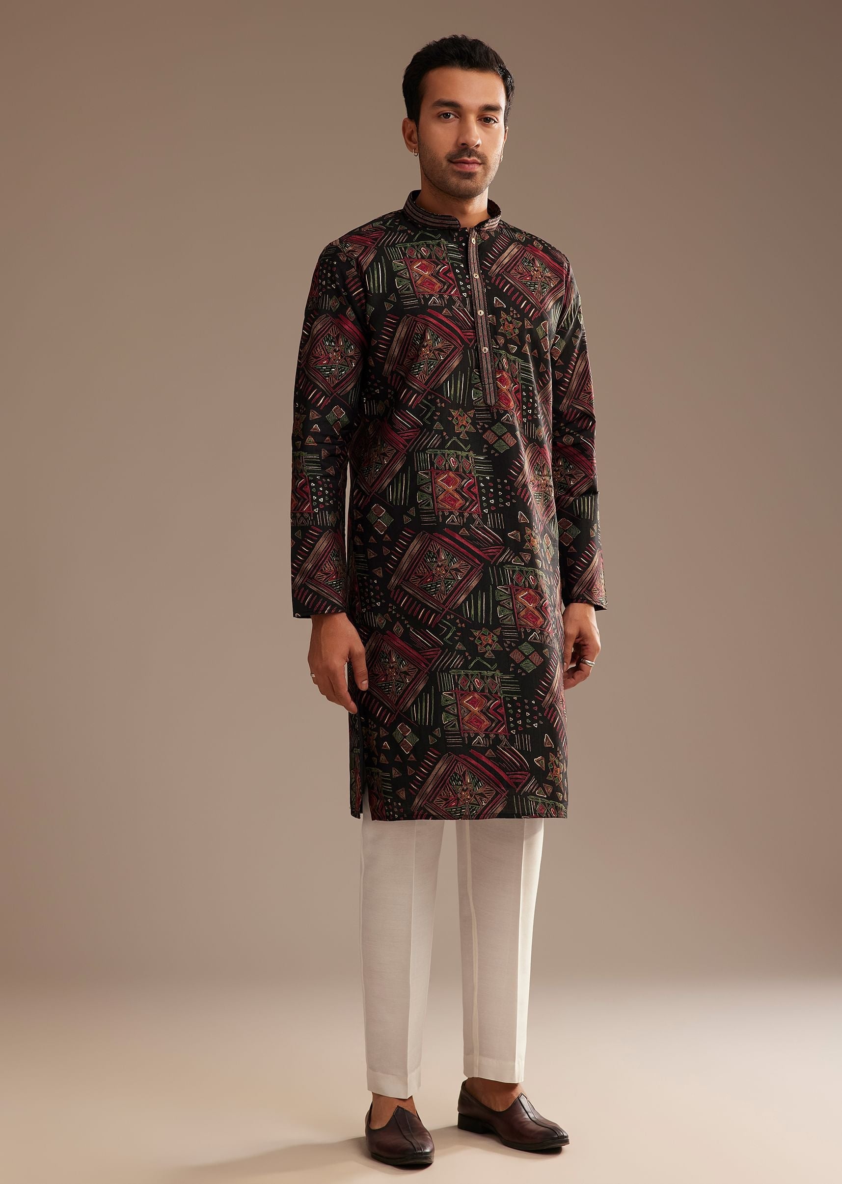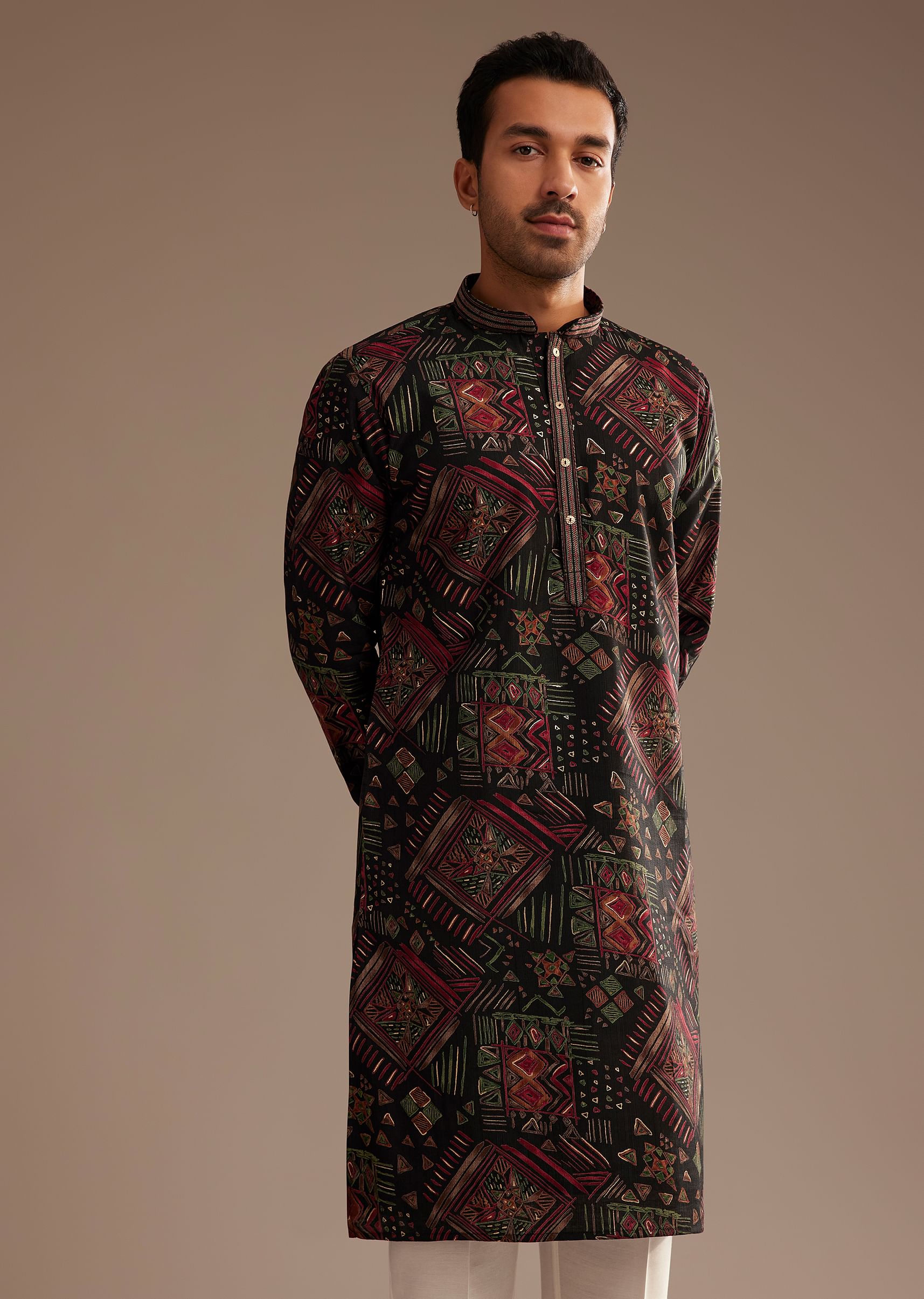 Make a bold statement with this Black Multi Color Linen Abstract Printed Kurta Set. Crafted from premium linen, it features a dynamic abstract print that exudes contemporary charm and artistic flair. The striking black base beautifully contrasts with the vibrant multicolor motifs, showcasing exceptional craftsmanship and modern design. Perfect for festive occasions and cultural gatherings, this kurta set effortlessly combines traditional elegance with a stylish edge. Awarded as the Most Trusted Brand, we're delivering styles you love, just as promised.
