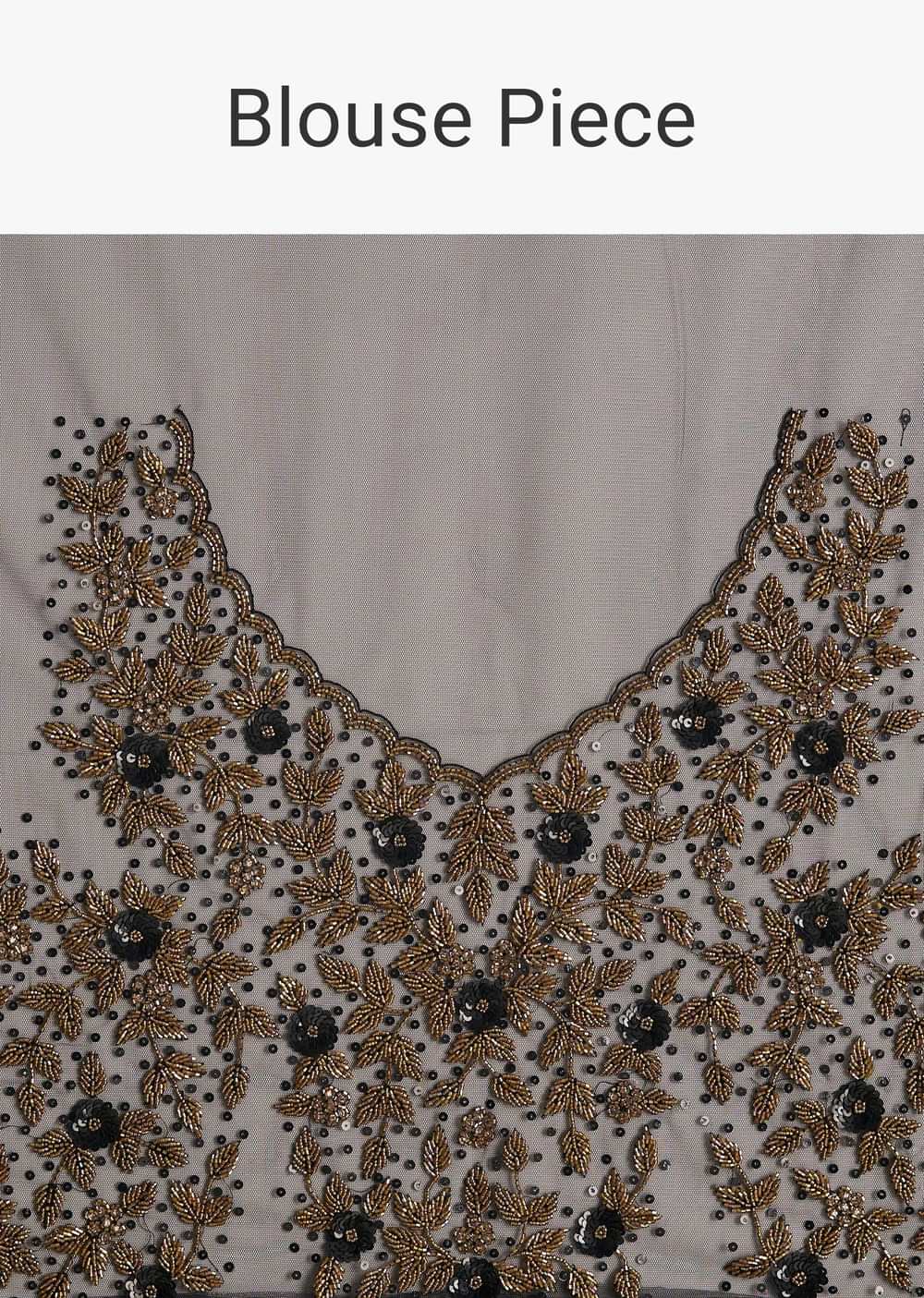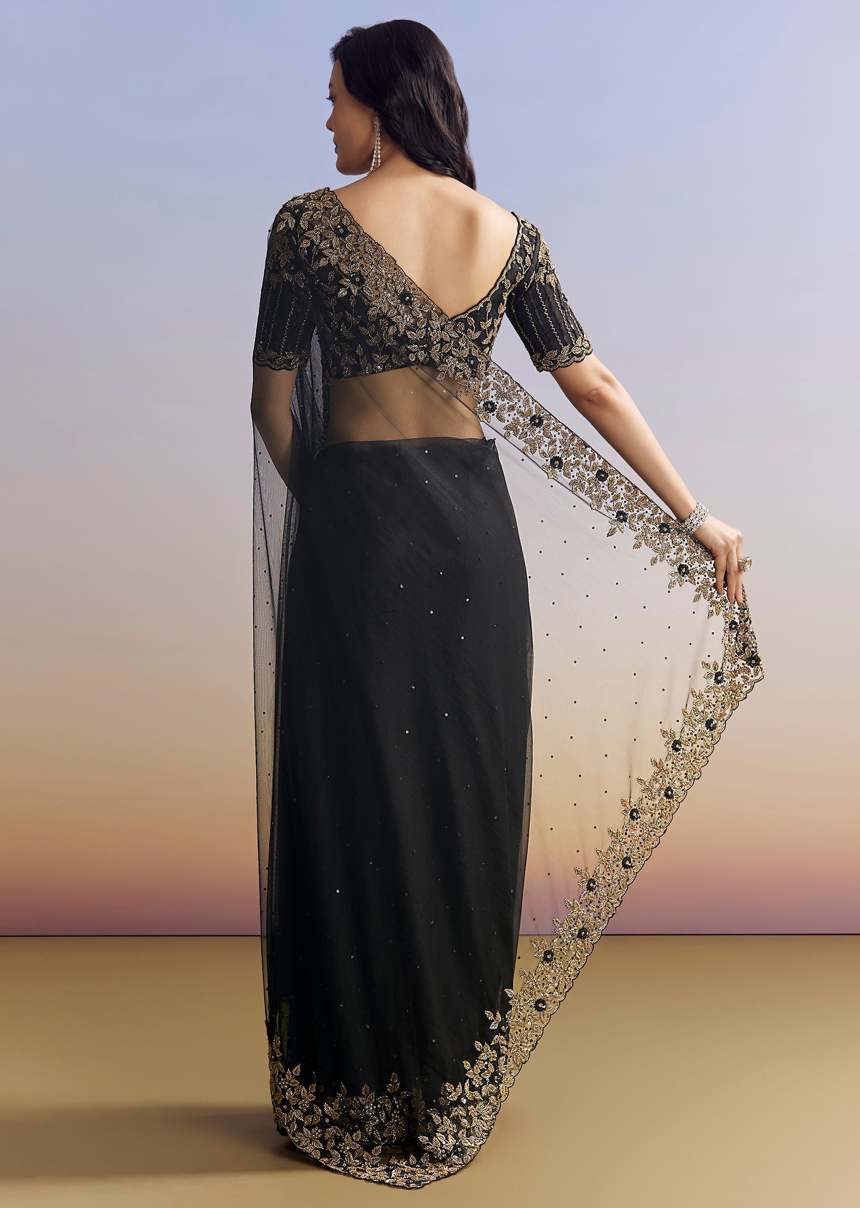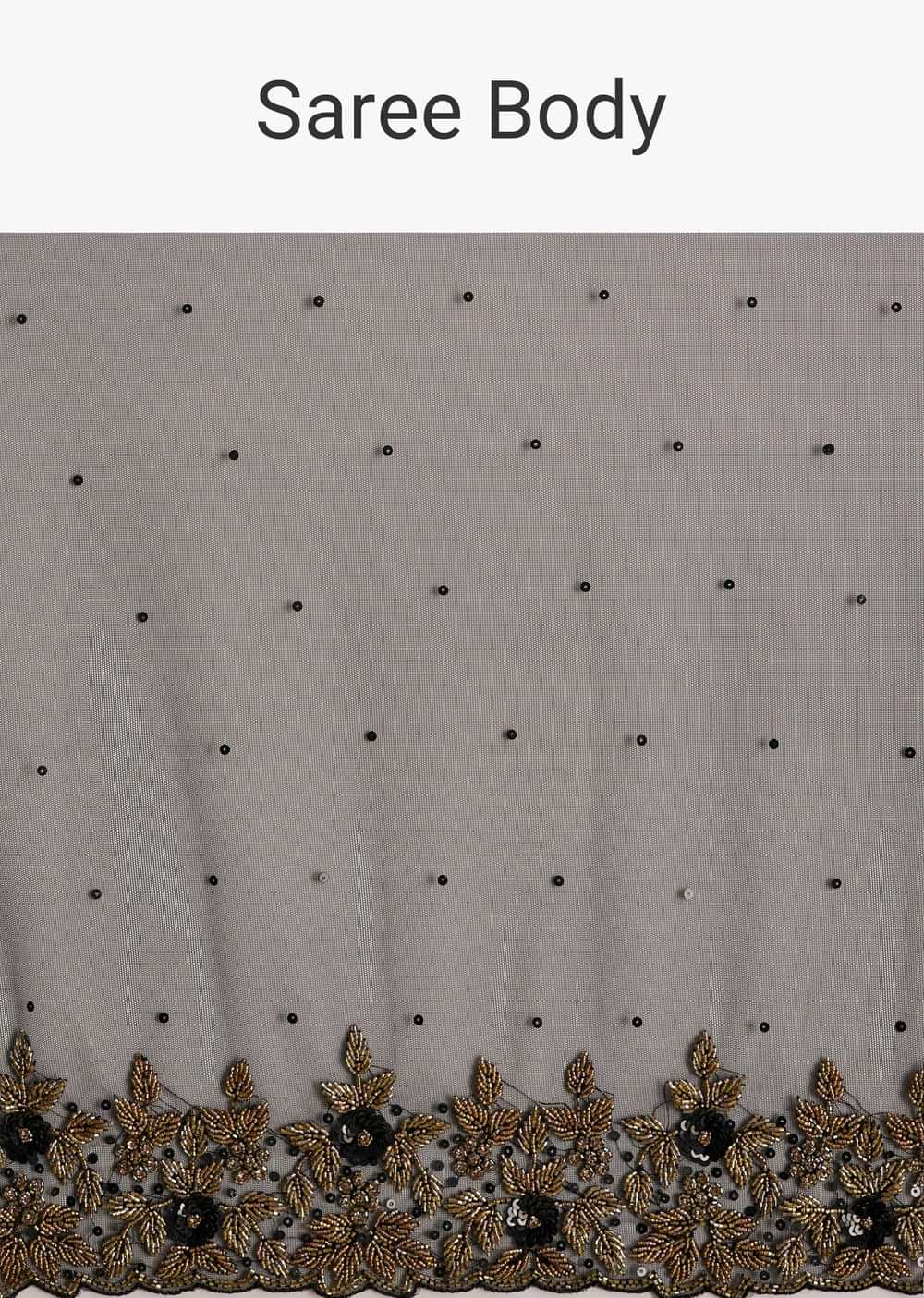 Elegant black net saree adorned with a heavily embroidered border and blouse using cutdana, sequins, and beads. Includes an unstitched blouse. Ideal for Engagement and Sangeet celebrations. Awarded as the Most Trusted Brand, we're delivering styles you love, just as promised.