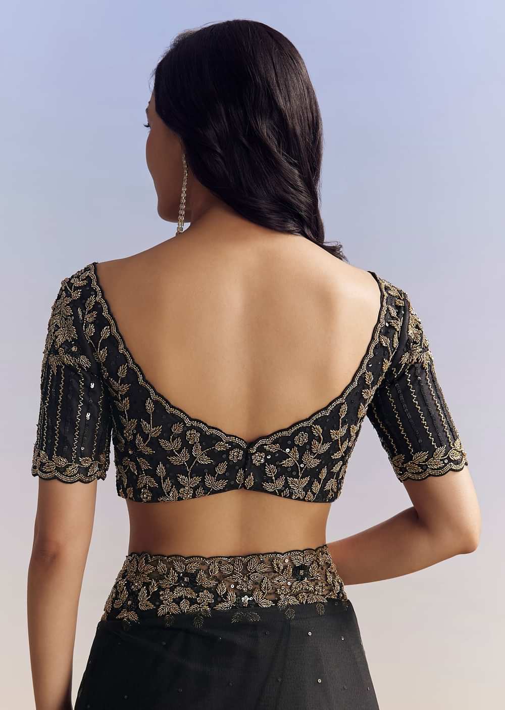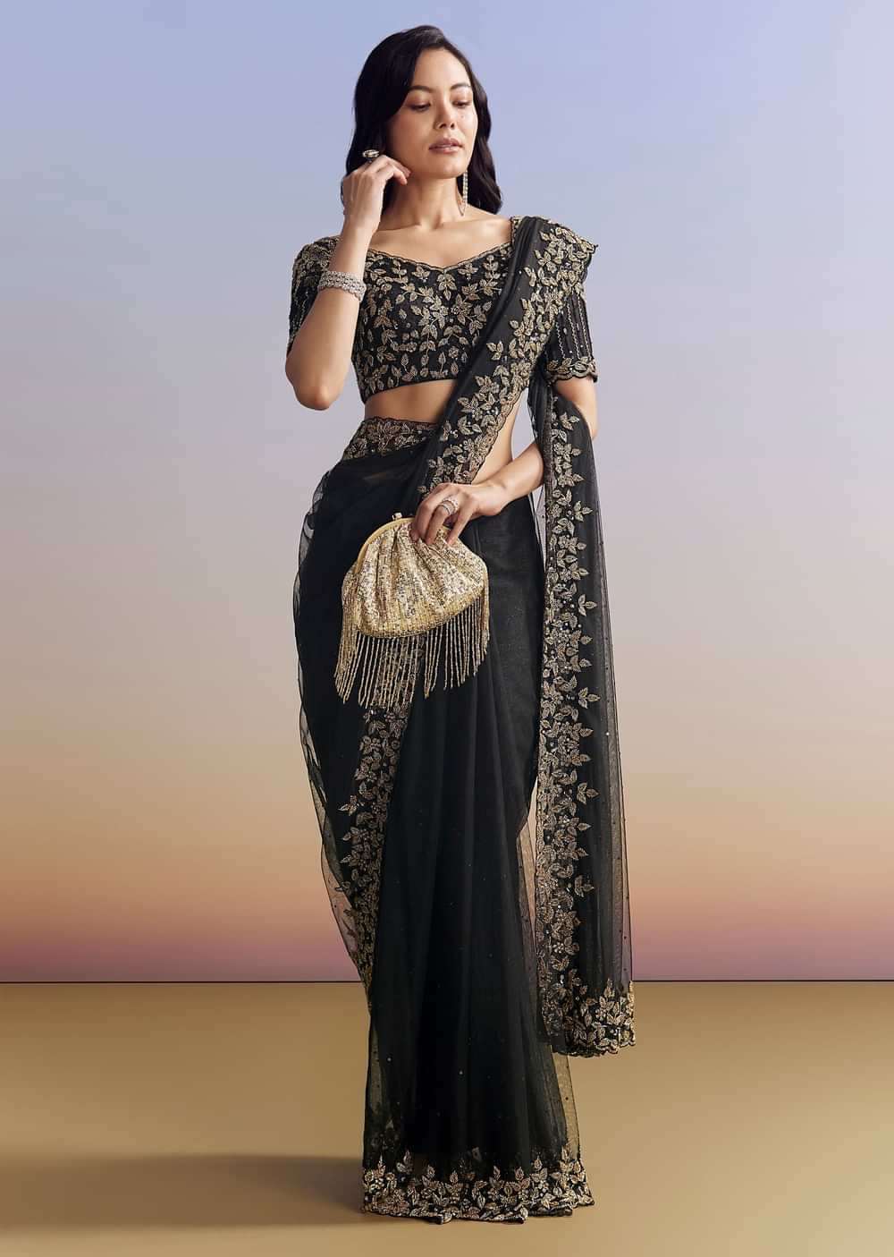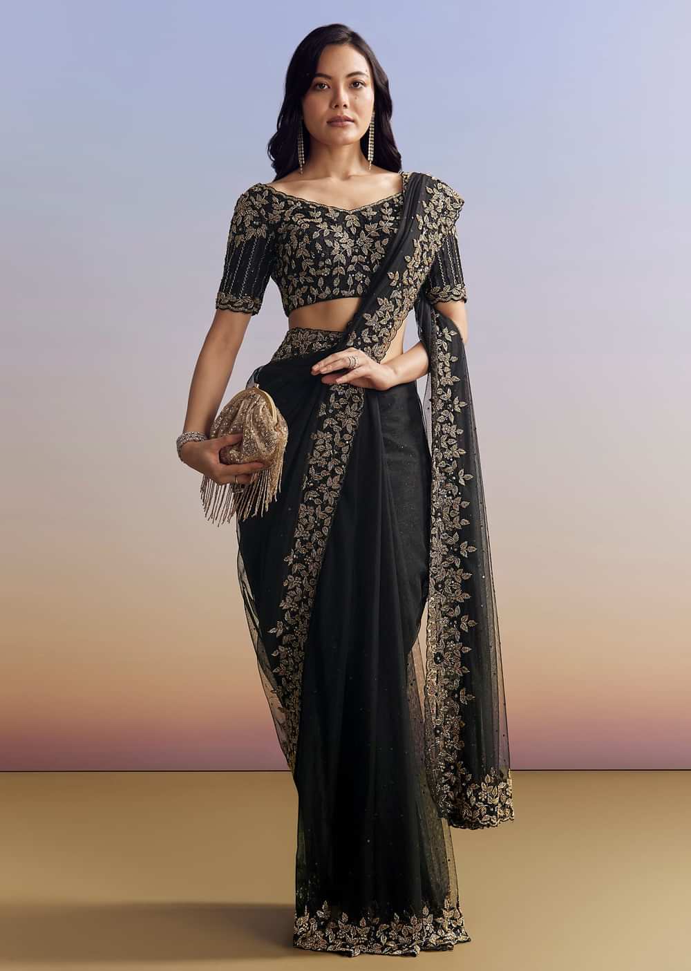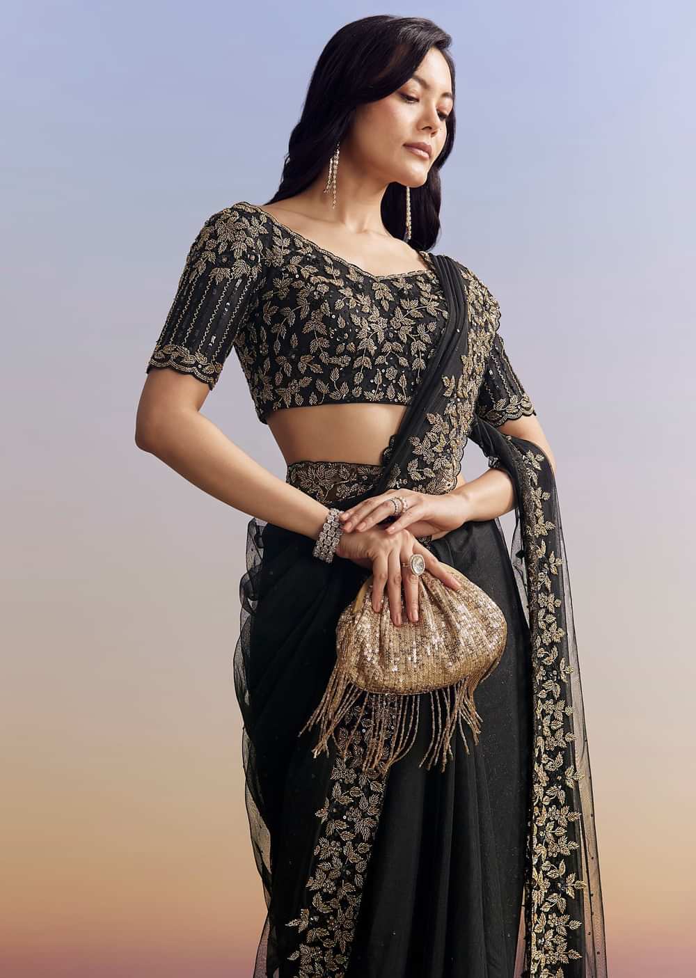 Elegant black net saree adorned with a heavily embroidered border and blouse using cutdana, sequins, and beads. Includes an unstitched blouse. Ideal for Engagement and Sangeet celebrations. Awarded as the Most Trusted Brand, we're delivering styles you love, just as promised.