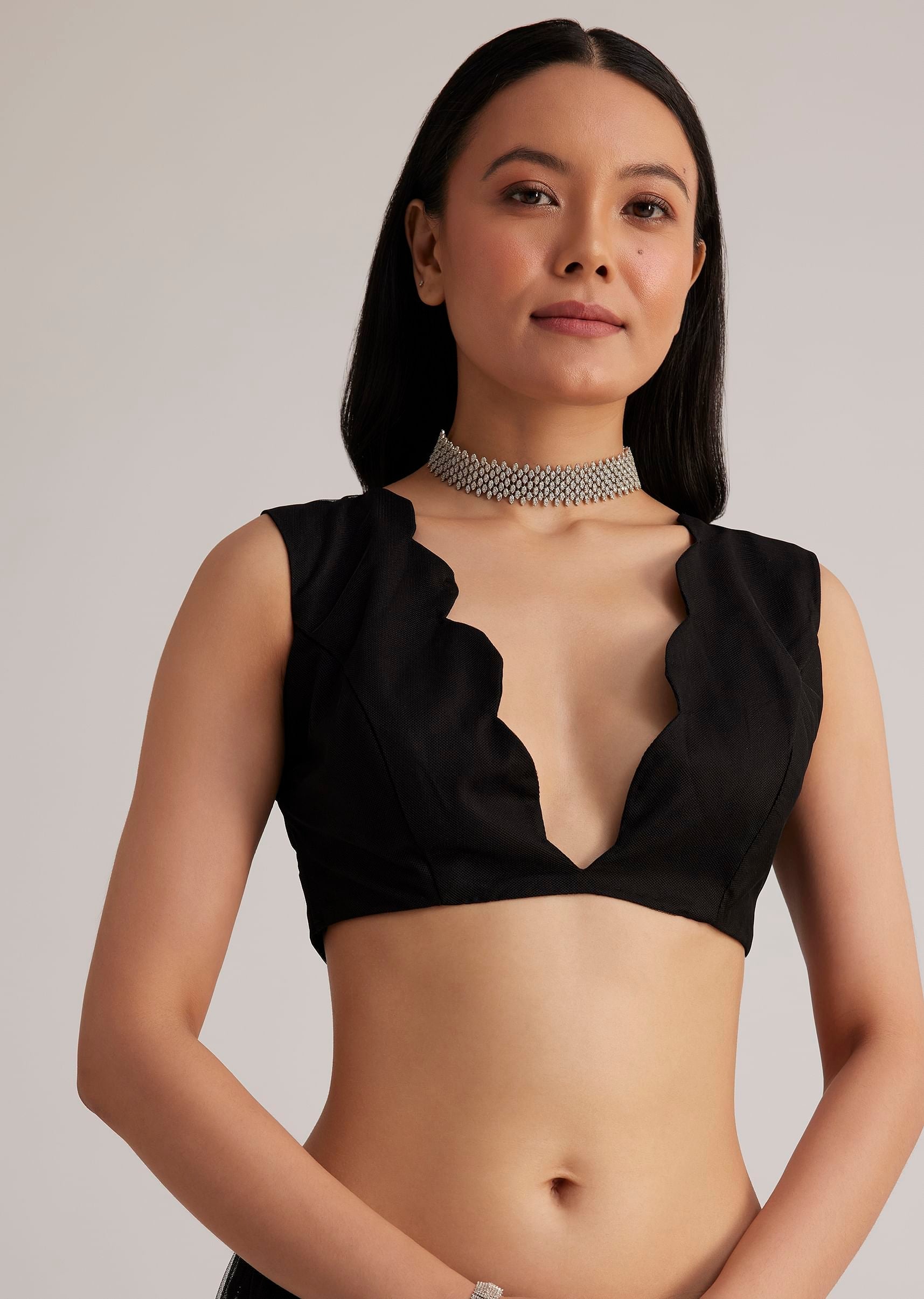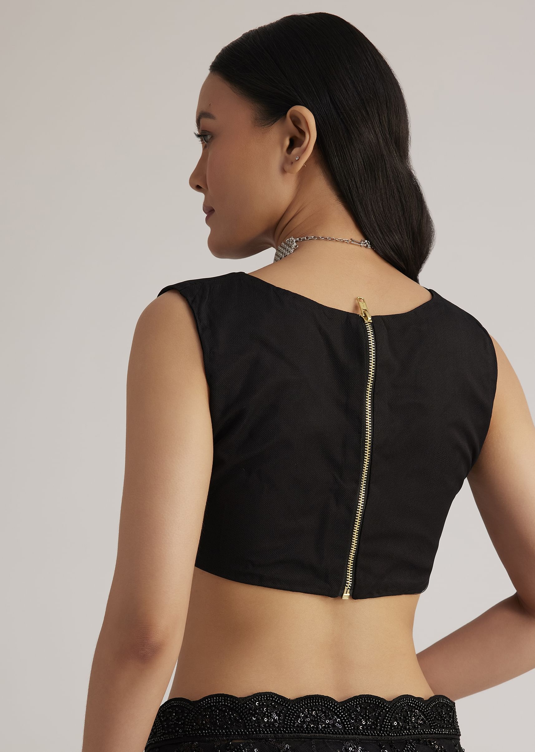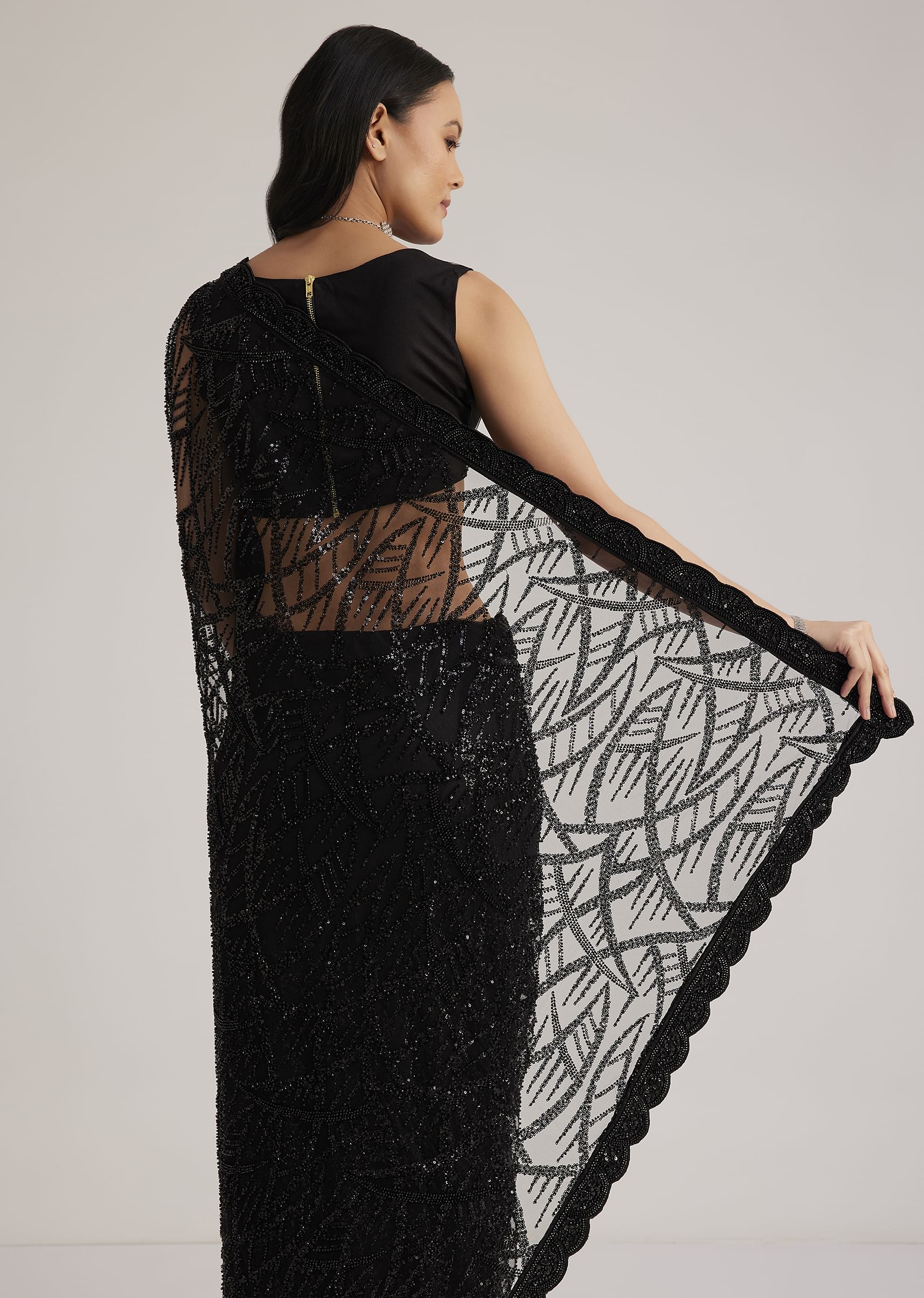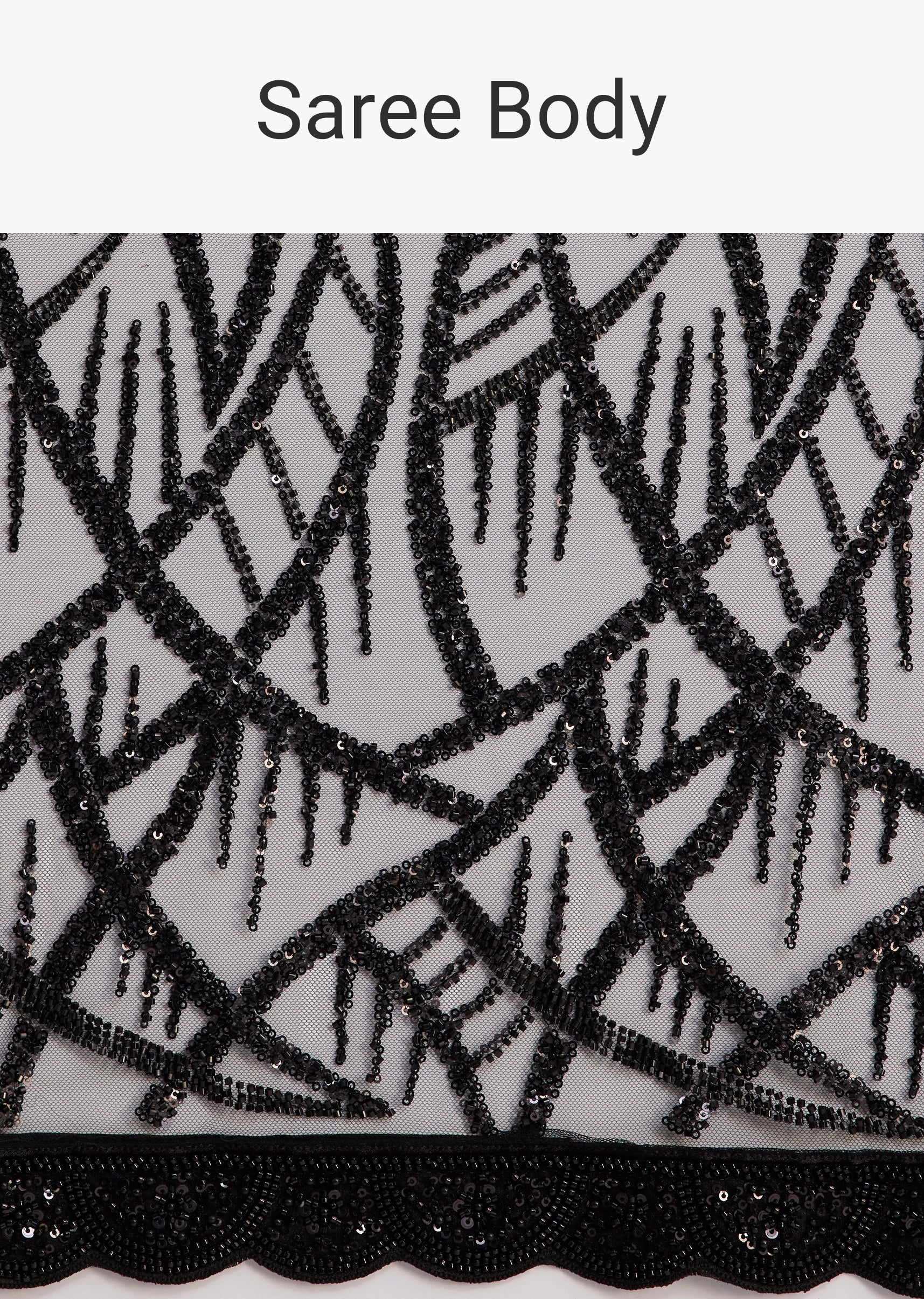 - Drape Yourself In Glamour With This Stunning Black Net Saree, Intricately Embroidered With Shimmering Sequins And Radiant Stones.