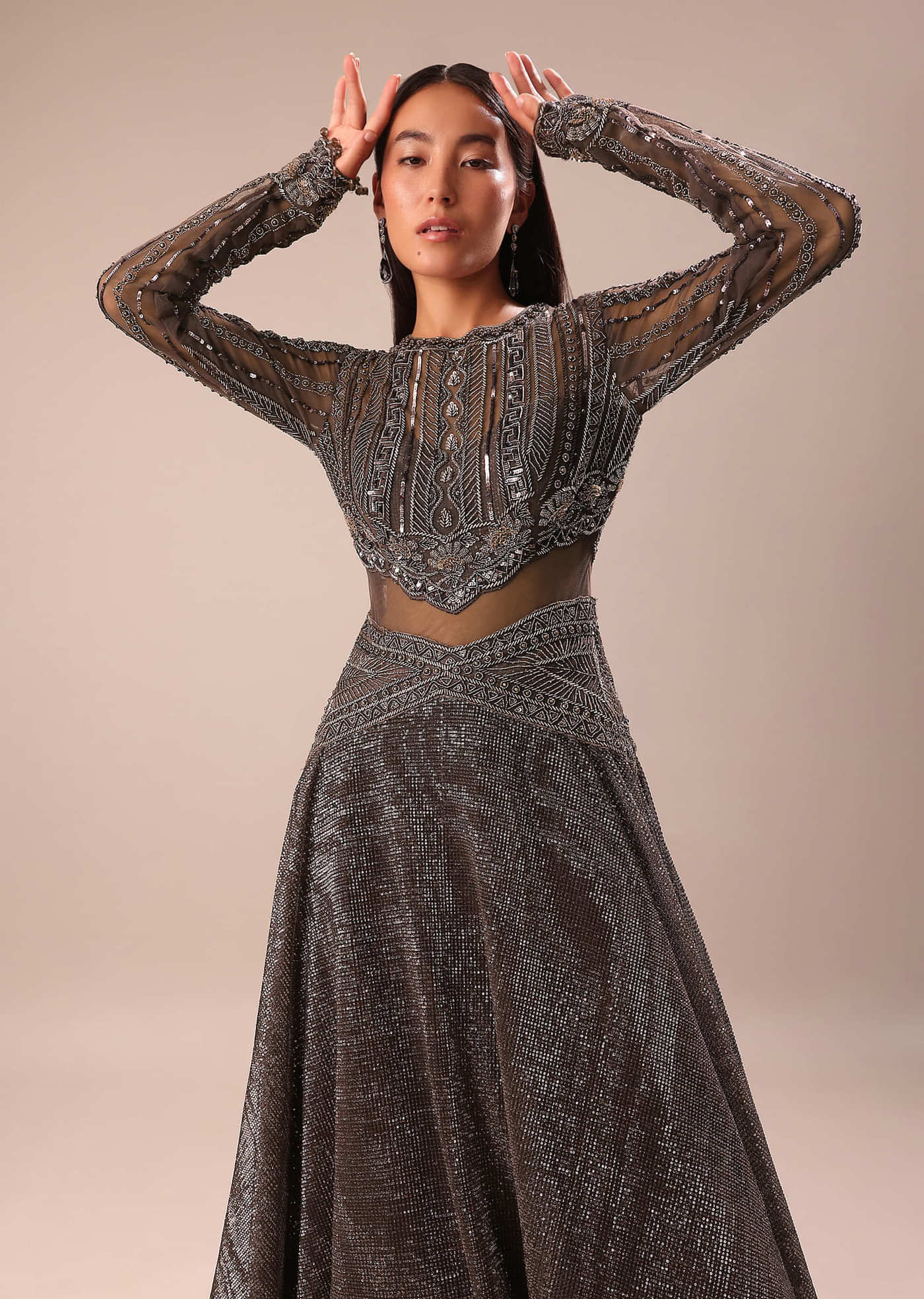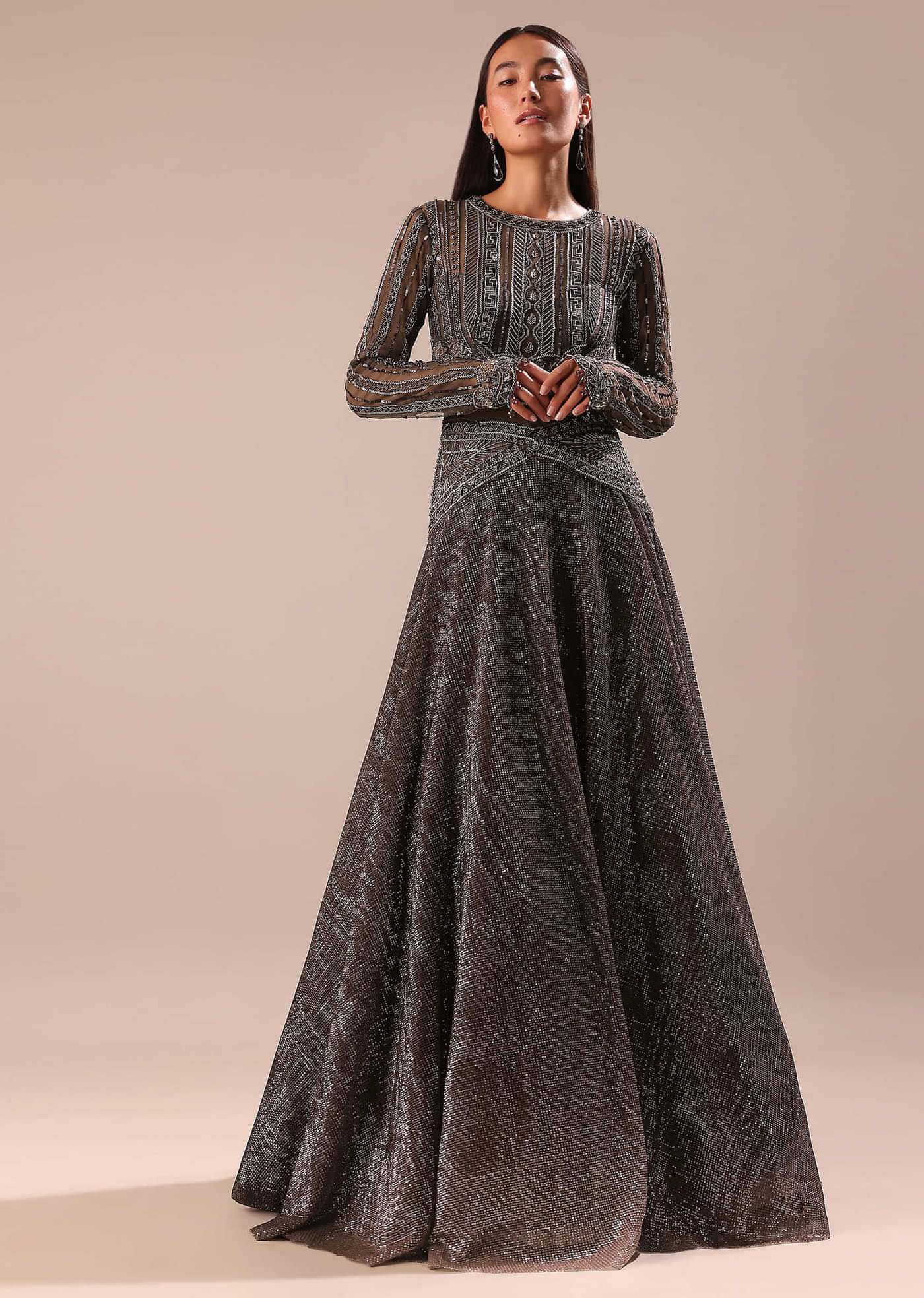 Discover unparalleled grace in our sophisticated black gown, specifically designed for receptions and wedding ceremonies. Made from lavish fancy sequin net fabric and adorned with elaborate hand-embroidered crystals, sequins, salli,... More Product Details