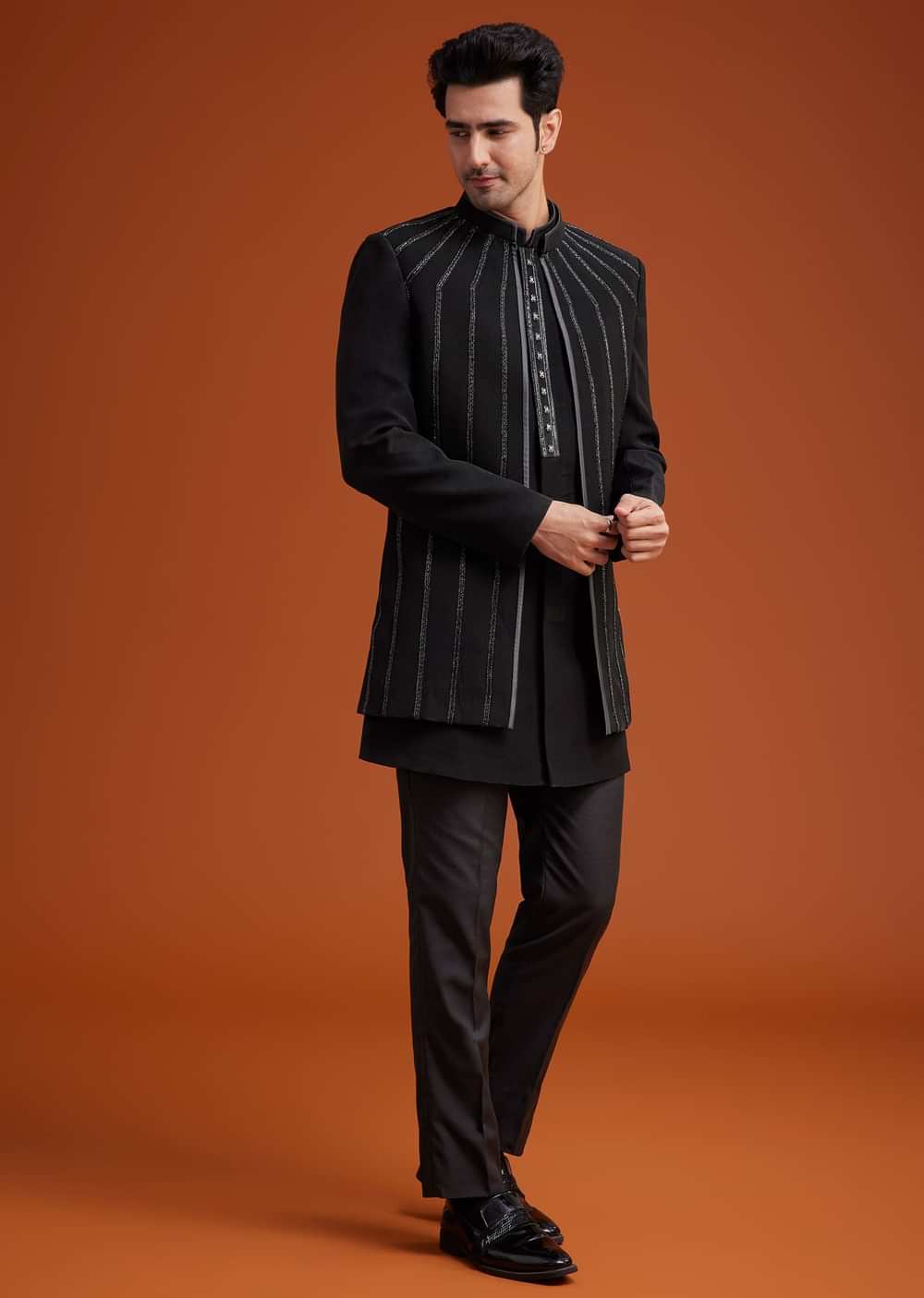 Black Open Sherwani Set with Linear Bead and Sequin Detailing