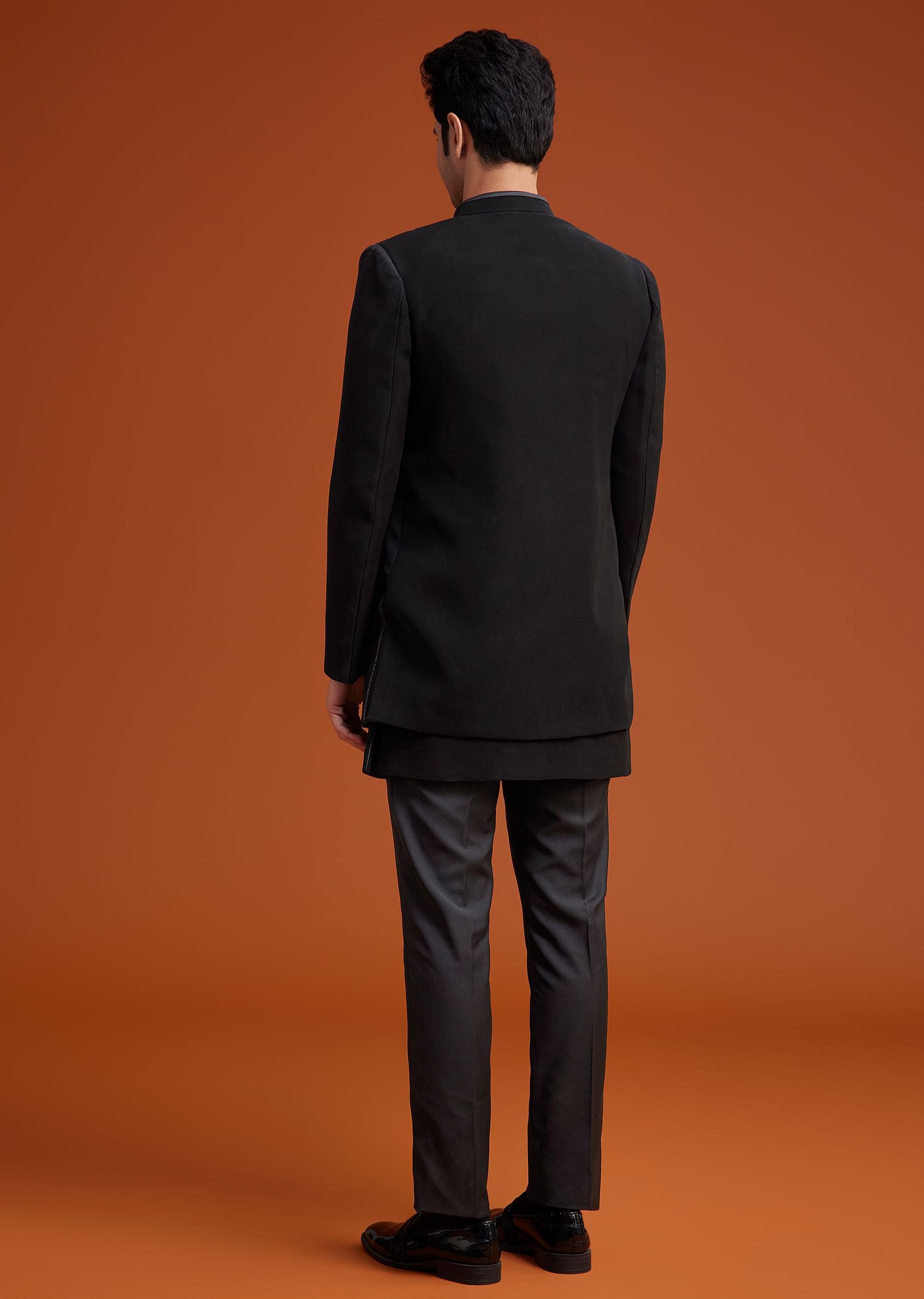 - Elevate your traditional ensemble with this black open jacket sherwani set, exuding sophistication and regal charm.