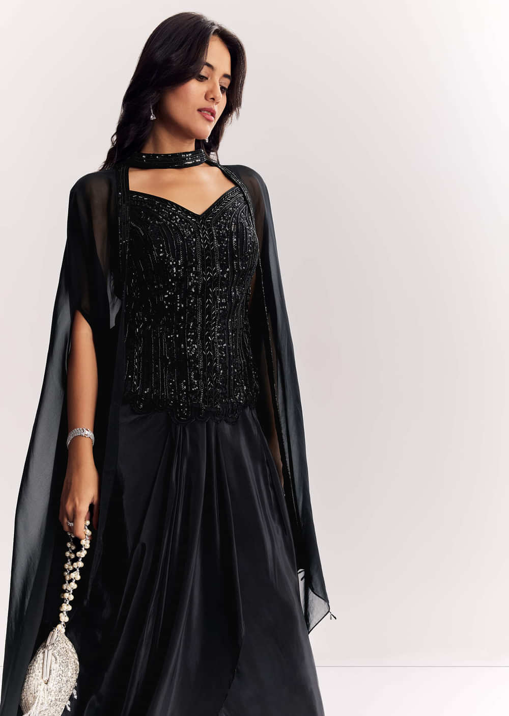 Black Organza Cape Suit With Sequins And Cutdana Embroidered Top