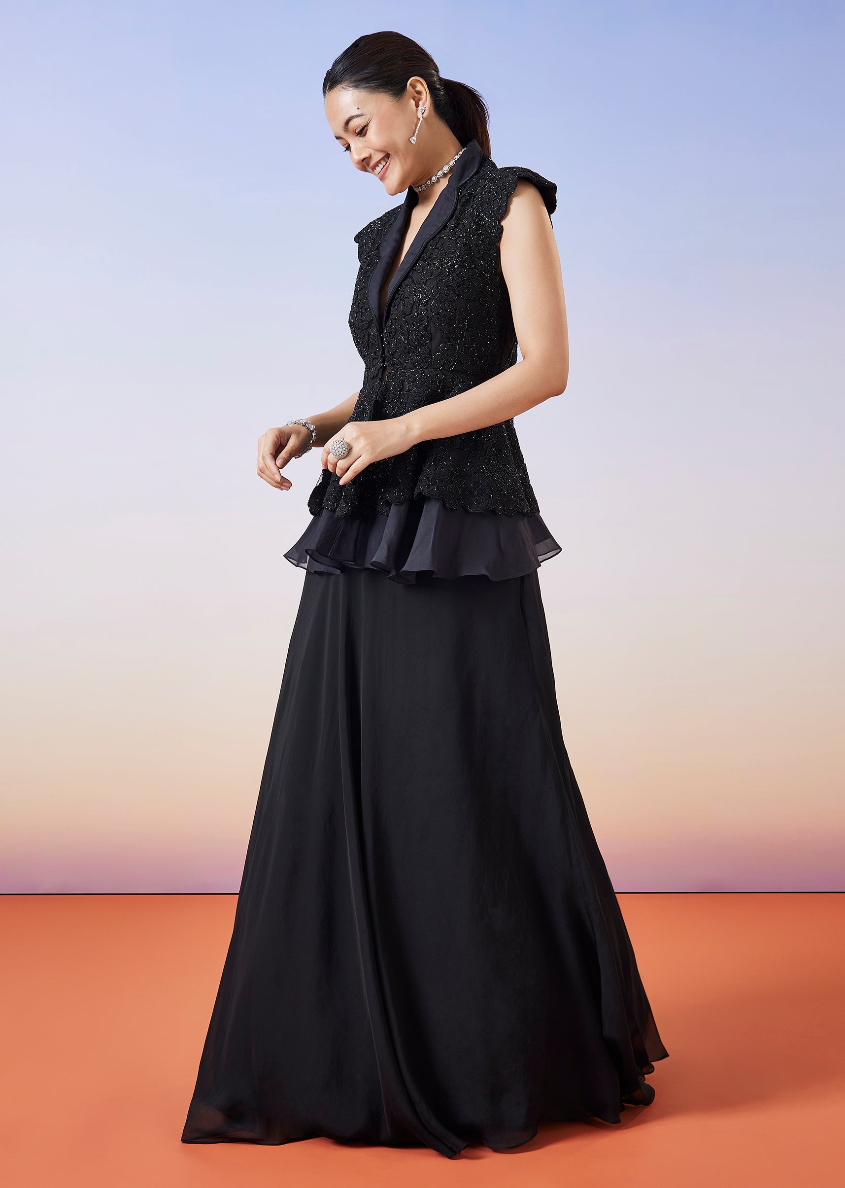 Black Organza Peplum Jacket Crop Skirt Lehenga