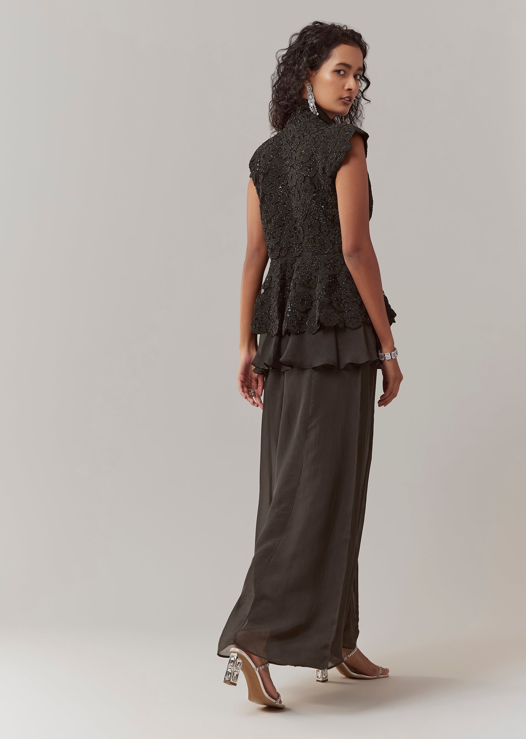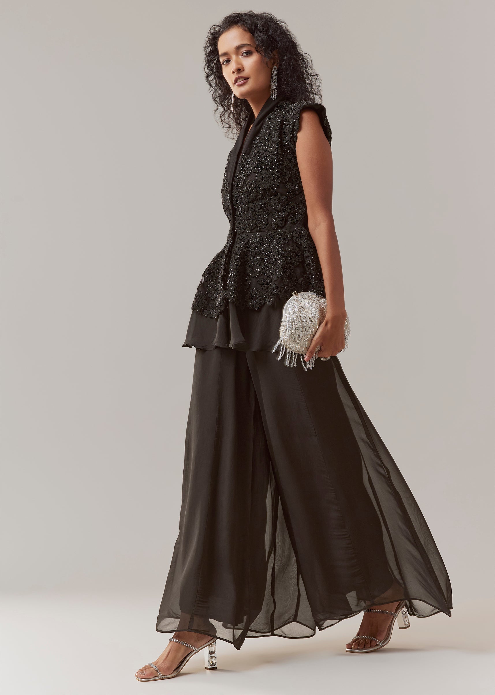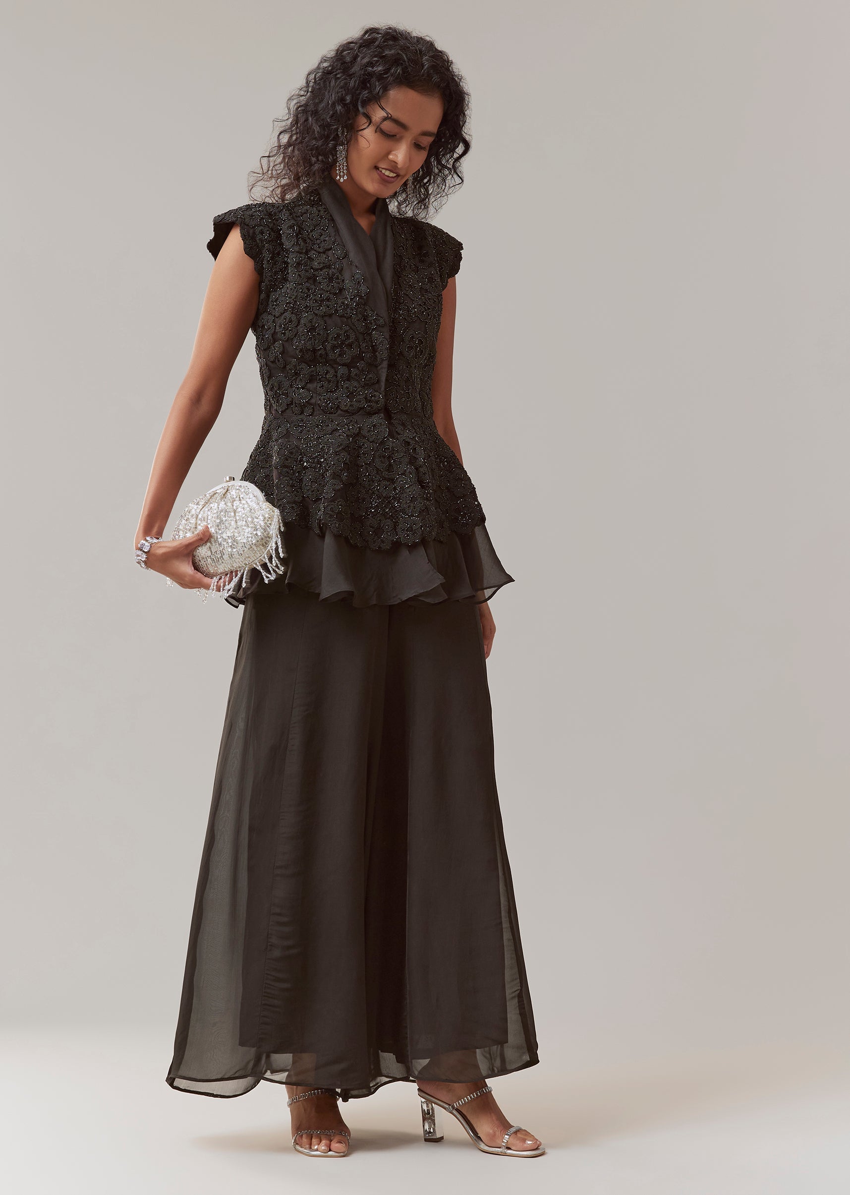 Chic with a hint of drama, this thread and cut dana work peplum set is designed for effortless festive style. The embroidered organza peplum top with cap sleeves and a structured shirt collar adds a contemporary edge. Paired with a coordinated crop top and flowy palazzo pants, the net detailing enhances lightness and movement. A versatile ensemble perfect for festive celebrations, parties, and modern wedding functions.