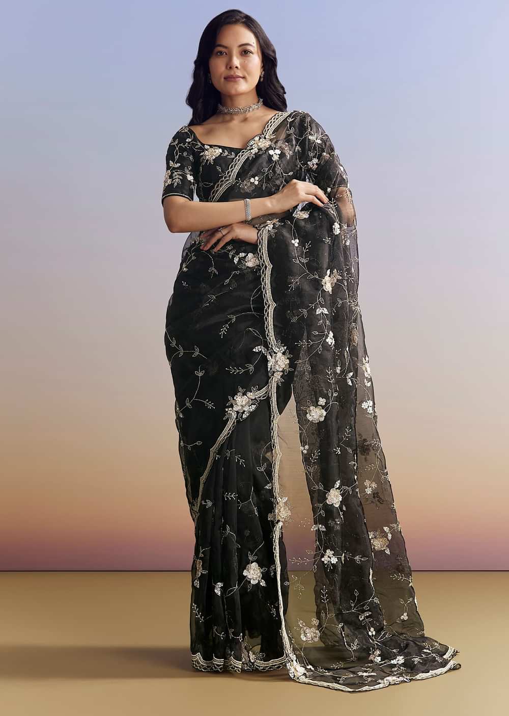 A striking black organza saree featuring intricate floral jaal embroidery with cutdana, sequins, and beads. Comes with a matching embroidered blouse. Includes an unstitched blouse. Perfect for Engagement and Sangeet nights. Awarded as the Most Trusted Brand, we're delivering styles you love, just as promised.