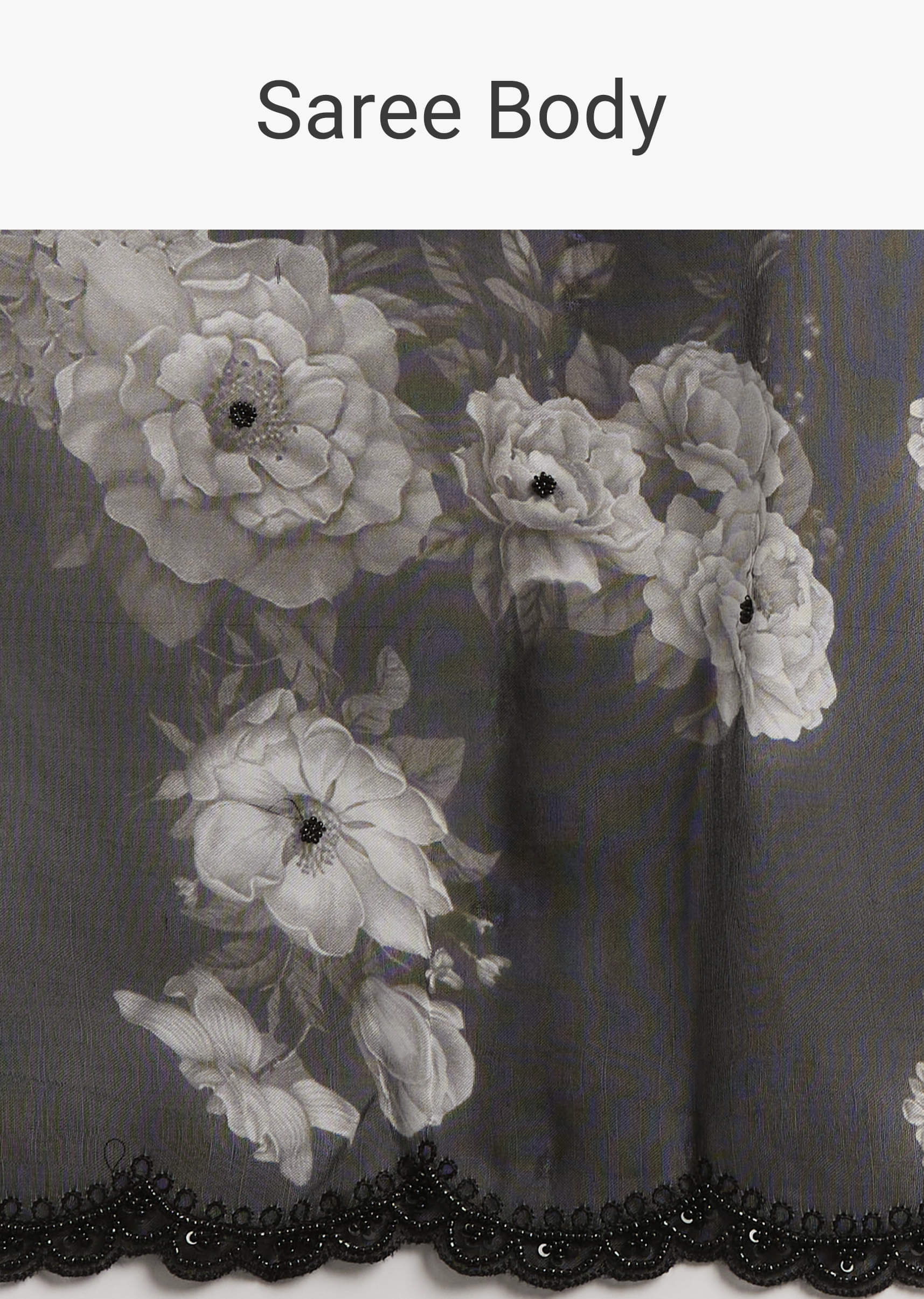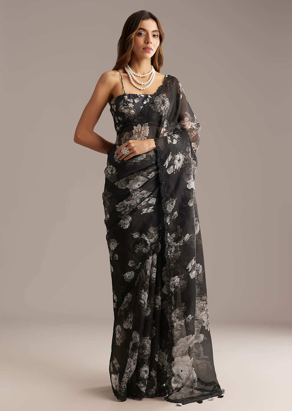 Black Organza Saree With Floral Print And Sequin Embroidery