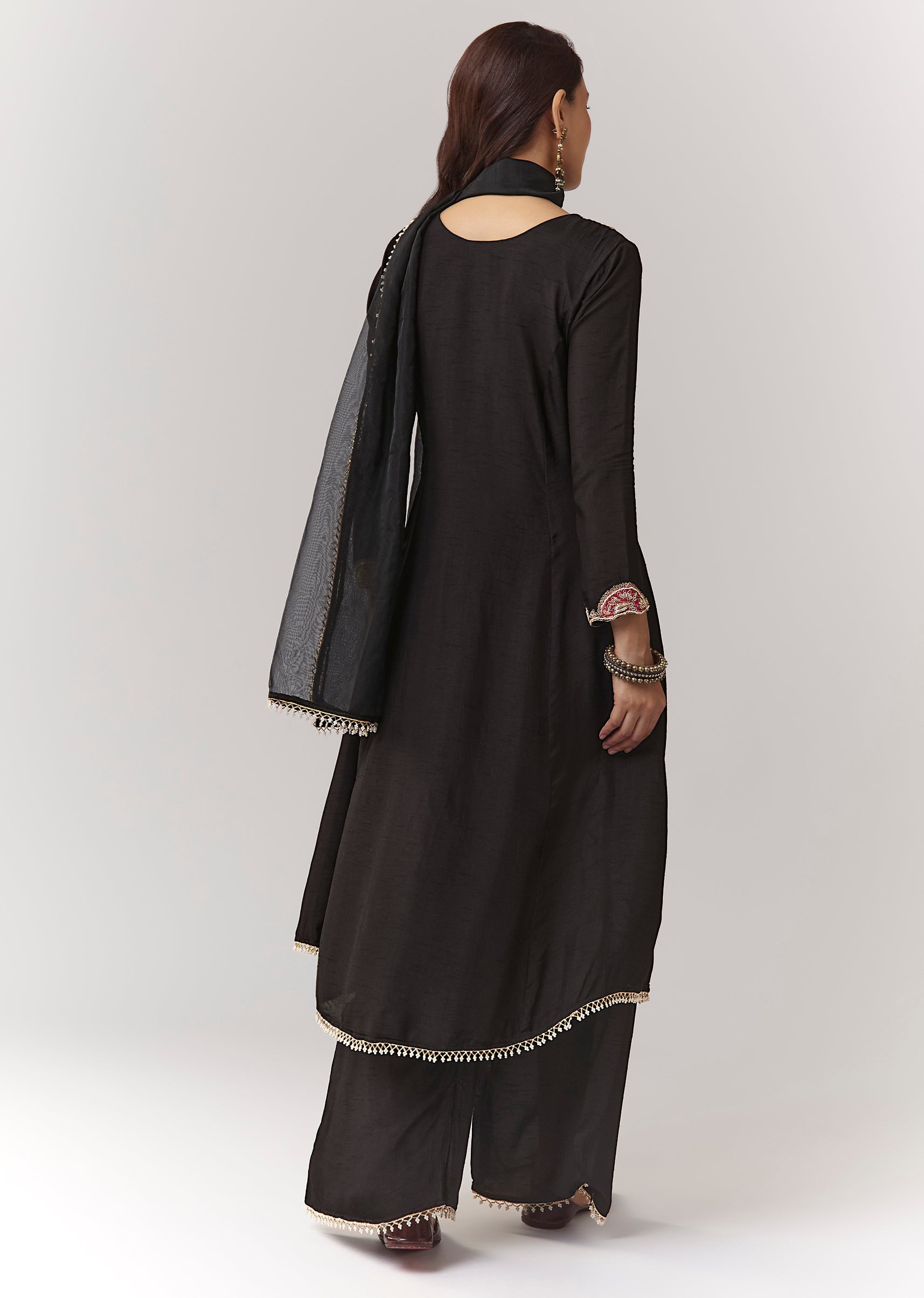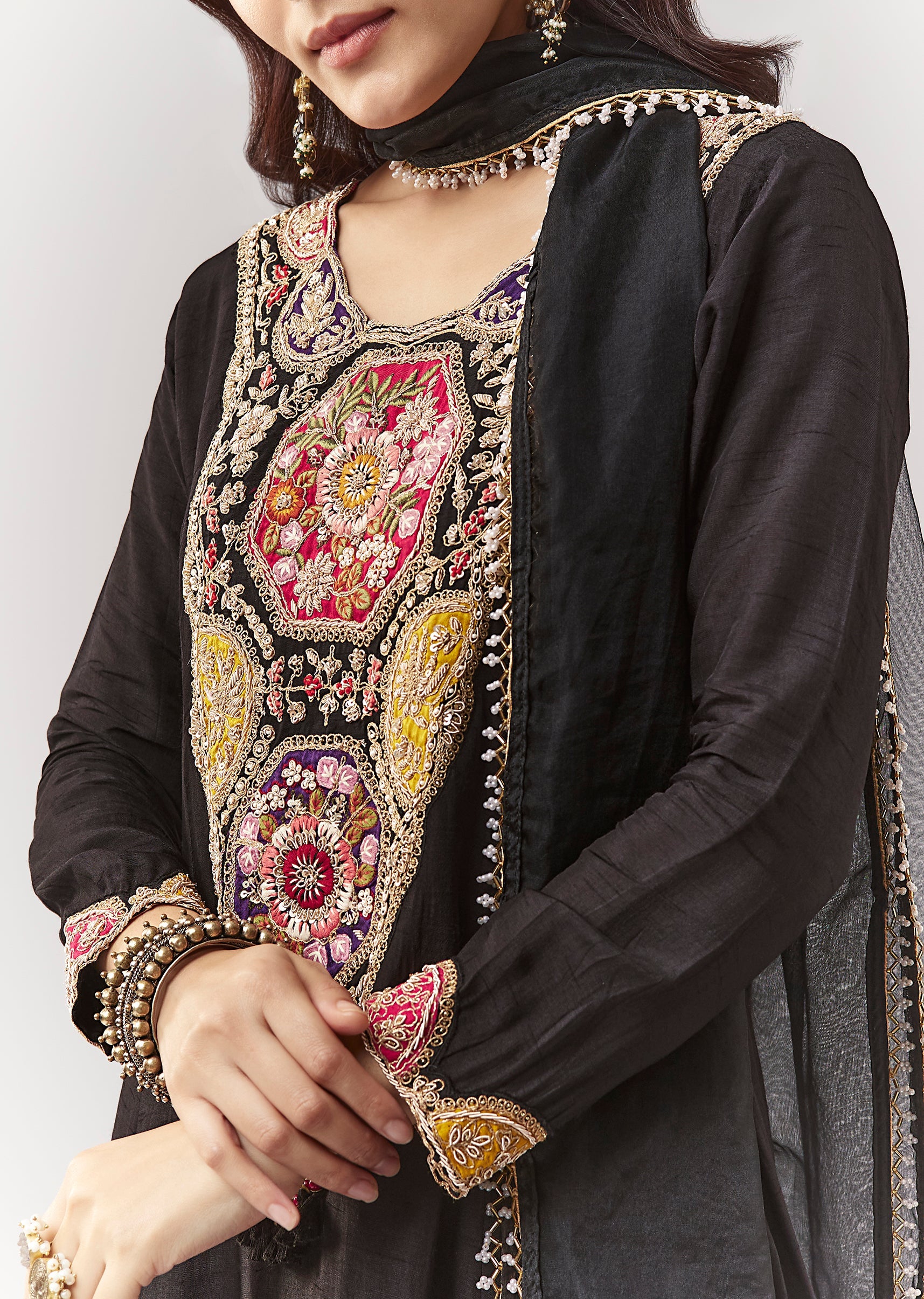 Black Patchwork Zardosi Thread Anarkali Pant Set With Dupatta