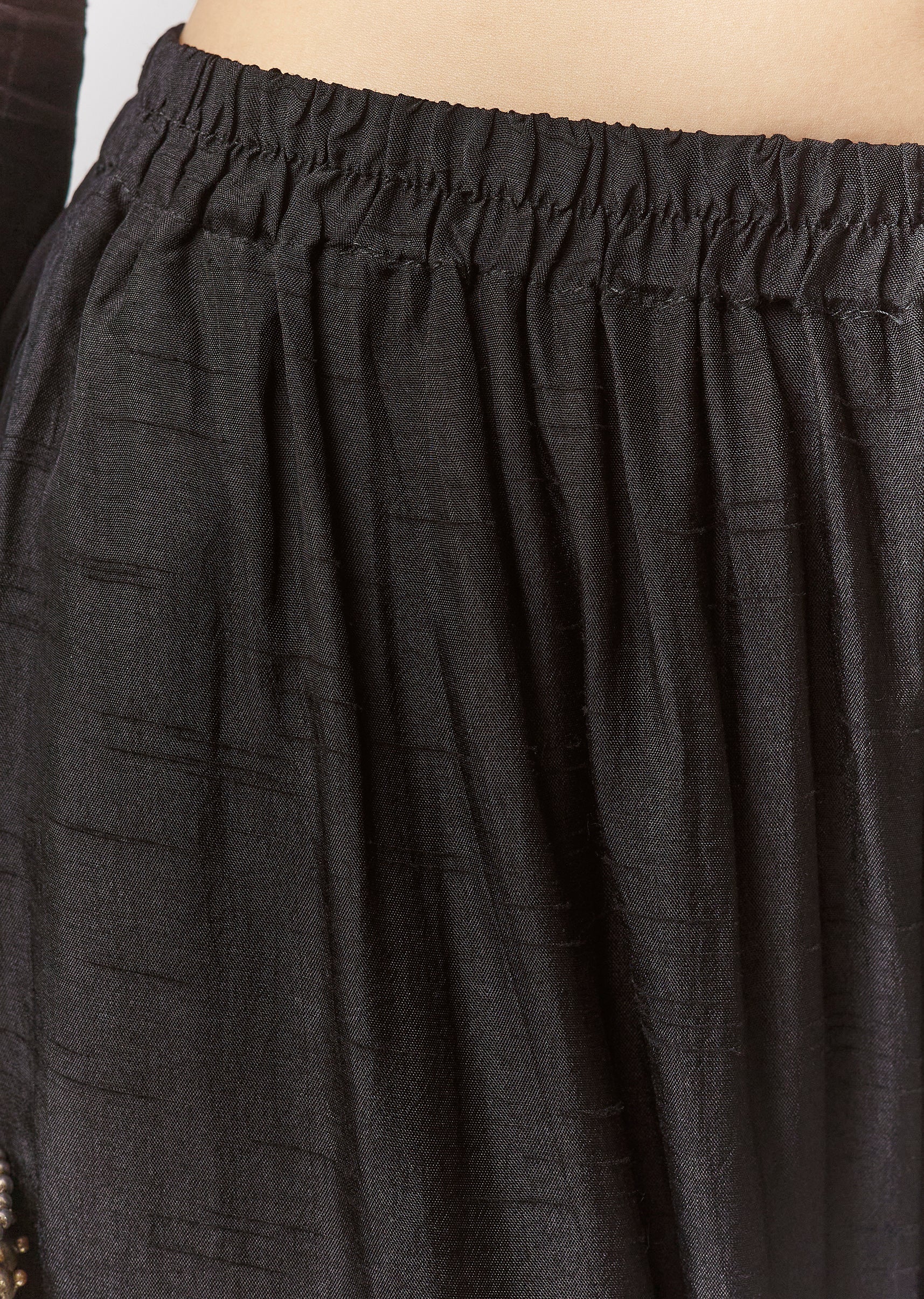 A minimal, festive black A-line anarkali in dola silk featuring patchwork with zardosi and thread embroidery. Designed with a round neckline and full sleeves for an elegant, modest silhouette. Comes... More Product Details