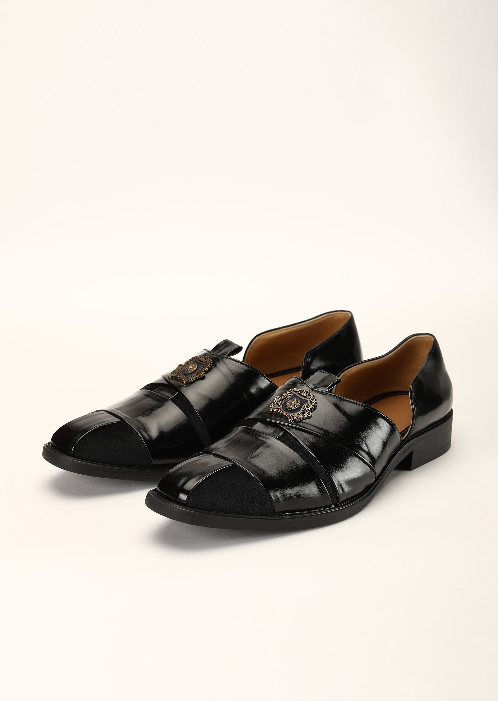 Black Peshawari Footwear In Rexine And Suede Leather Embellished With A Brooch