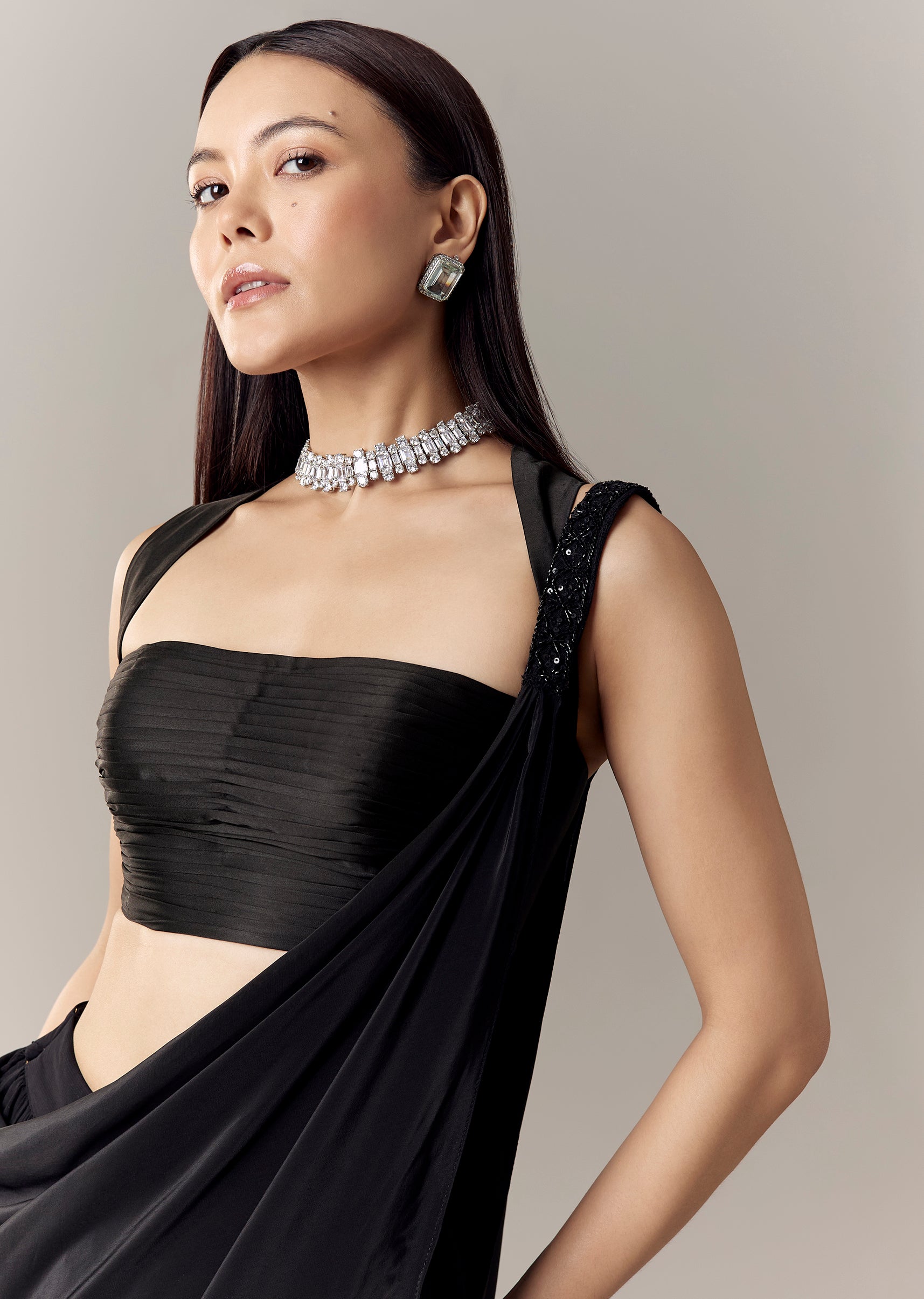 A satin black sleeveless blouse with front pleating and an adjustable smocked back—clean, minimal, and easy to style with statement drapes. Awarded as the Most Trusted Brand, we're delivering styles... More Product Details