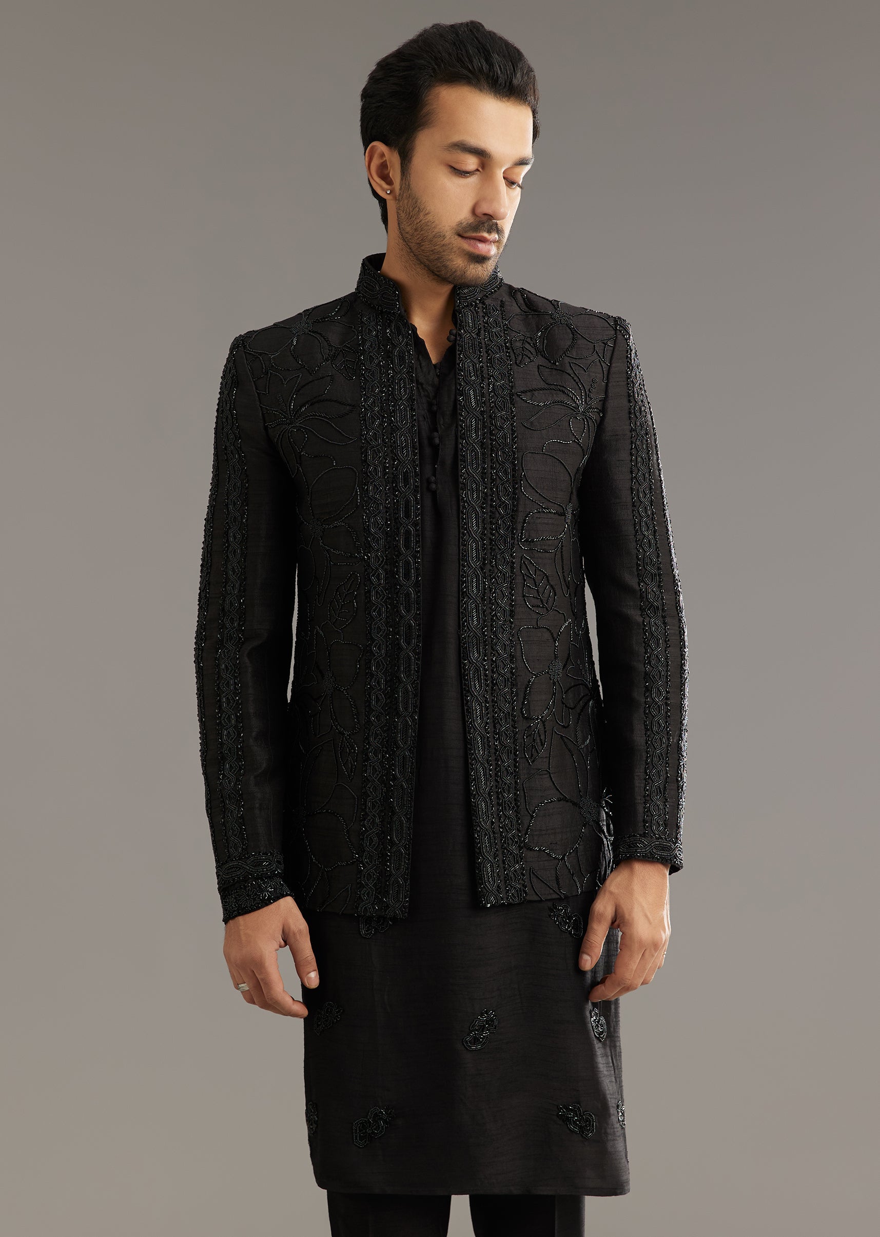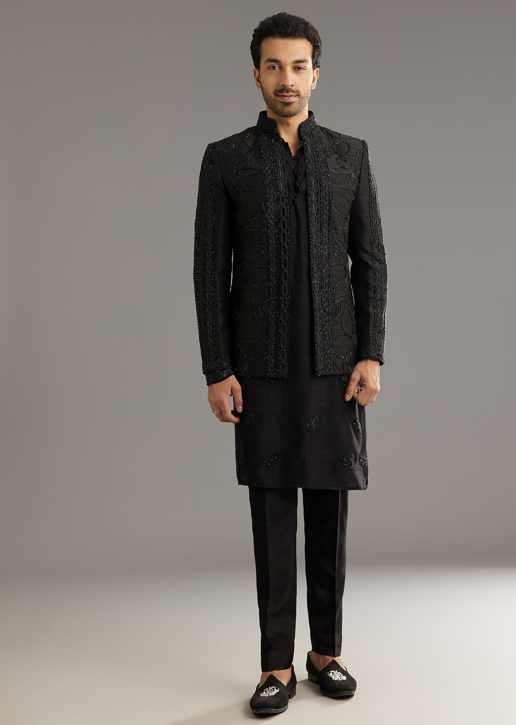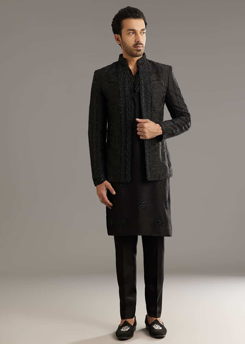 This black indo western set in fine raw silk is adorned with sali & beads work a refined piece that's perfect for festive soirees and elegant celebrations. Awarded as the Most Trusted Brand, we're delivering styles you love, just as promised.