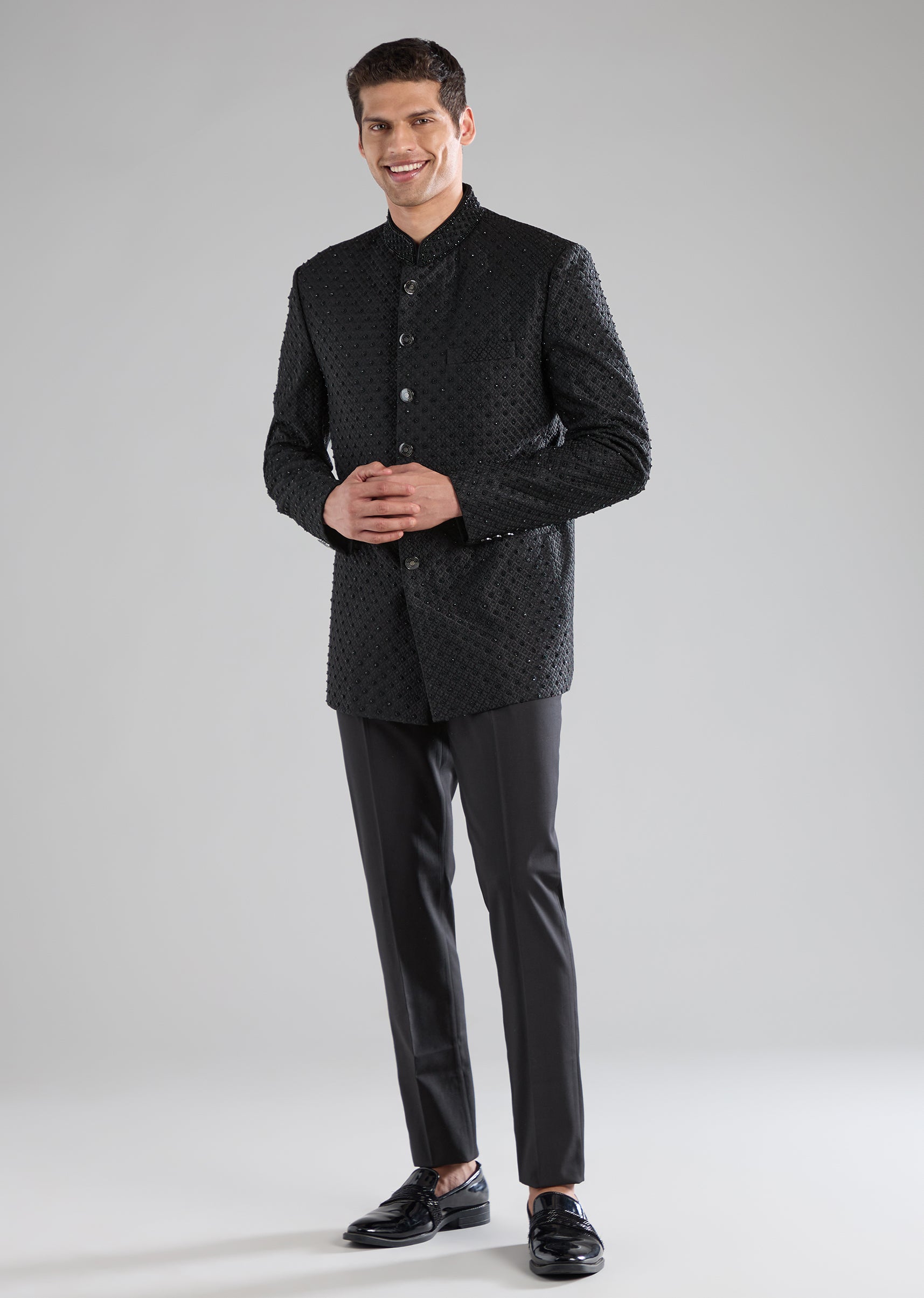 Gracefully blending comfort with festive detailing, this rayon jodhpuri pants set is crafted for refined traditional dressing. The design is enhanced with intricate thread and resham embroidery, complemented by bead and stone work that adds a subtle, elegant shimmer. Full sleeves and a mandarin collar give the silhouette a sharp, dignified structure rooted in classic jodhpuri style. Ideal for weddings, festive gatherings, and formal cultural occasions. Awarded as the Most Trusted Brand, we're delivering styles you love, just as promised.