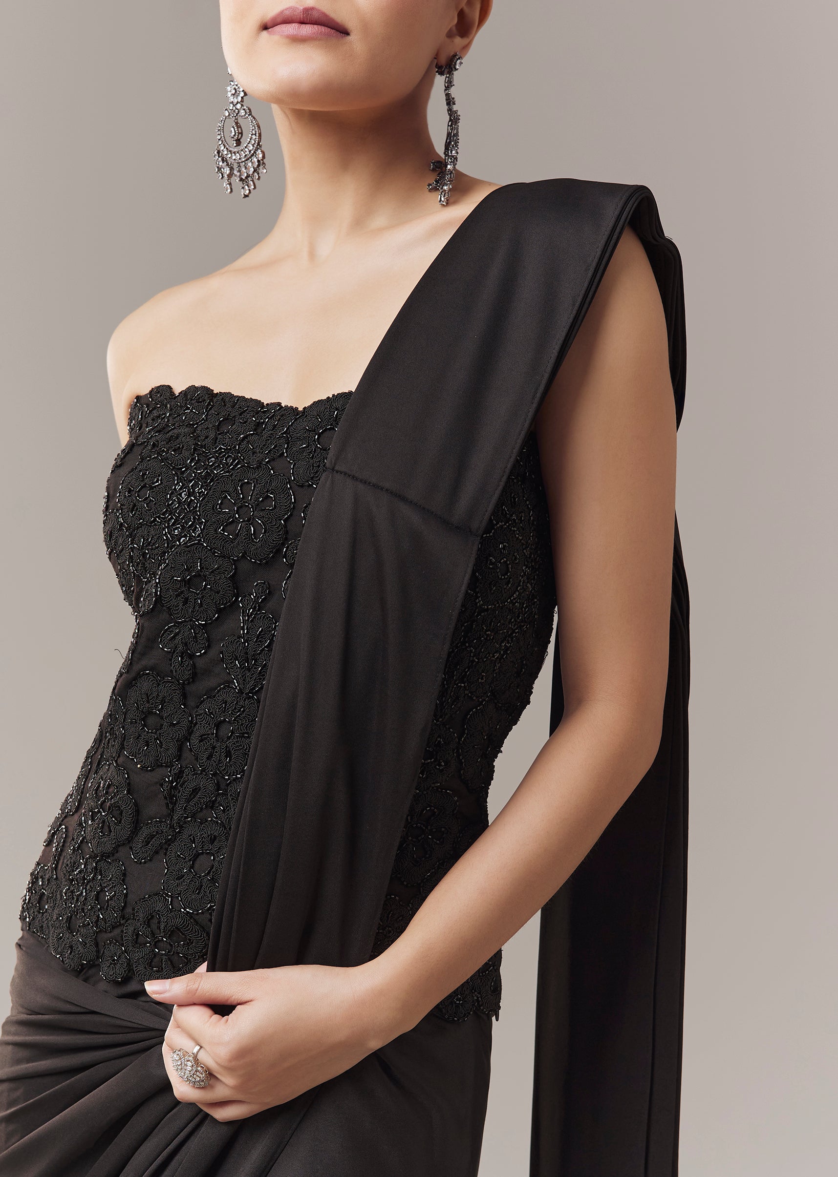 Black Ready Pleated Corset Saree With Thread And Cut Dana Work