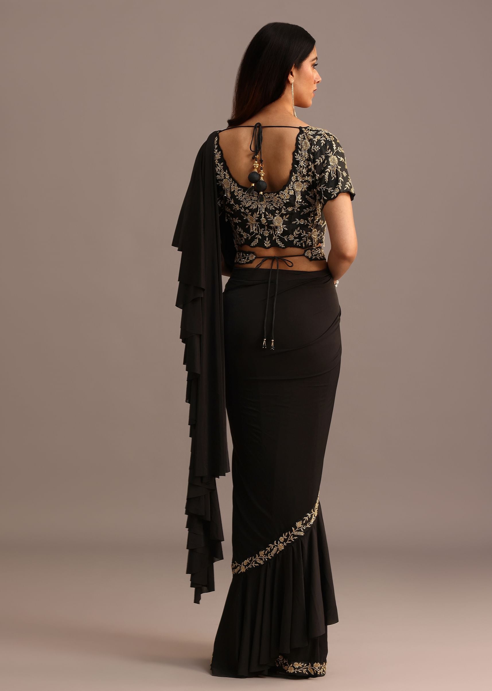 Black Ready Pleated Frills Saree With Embroided Blouse And Belt